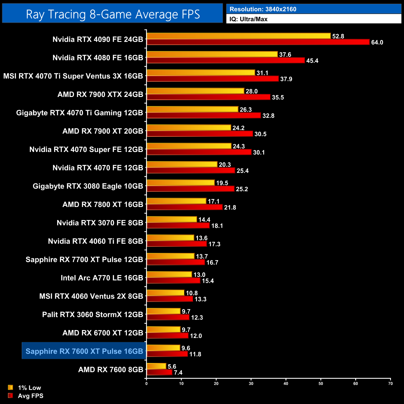 Overall, it is clear that ray tracing is not one of the RX 7600 XT's strengths. It might be manageable if you only use one ray traced effect, like we saw in Shadow of the Tomb Raider, but overall performance came in 20% behind the RTX 4060 at 1080p.