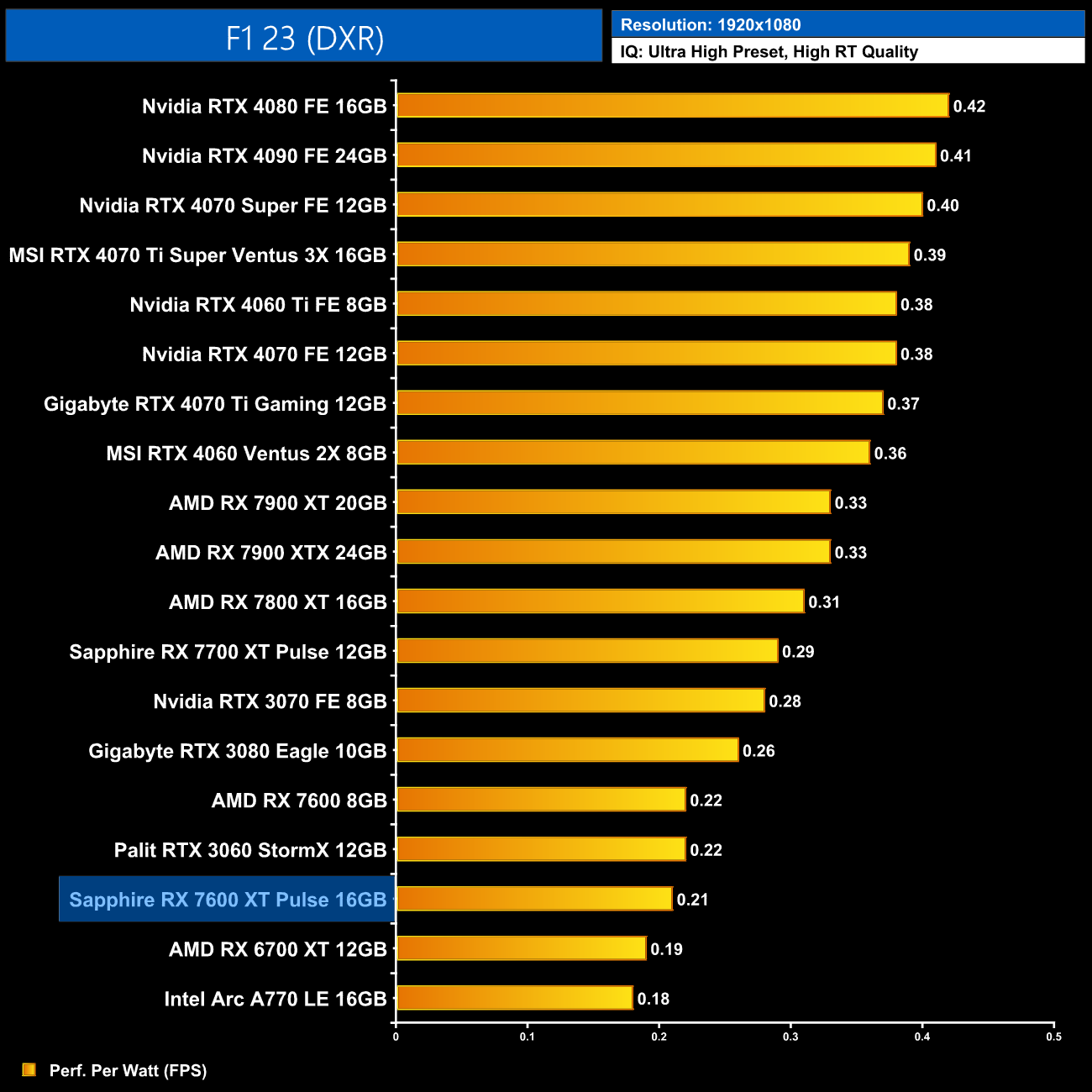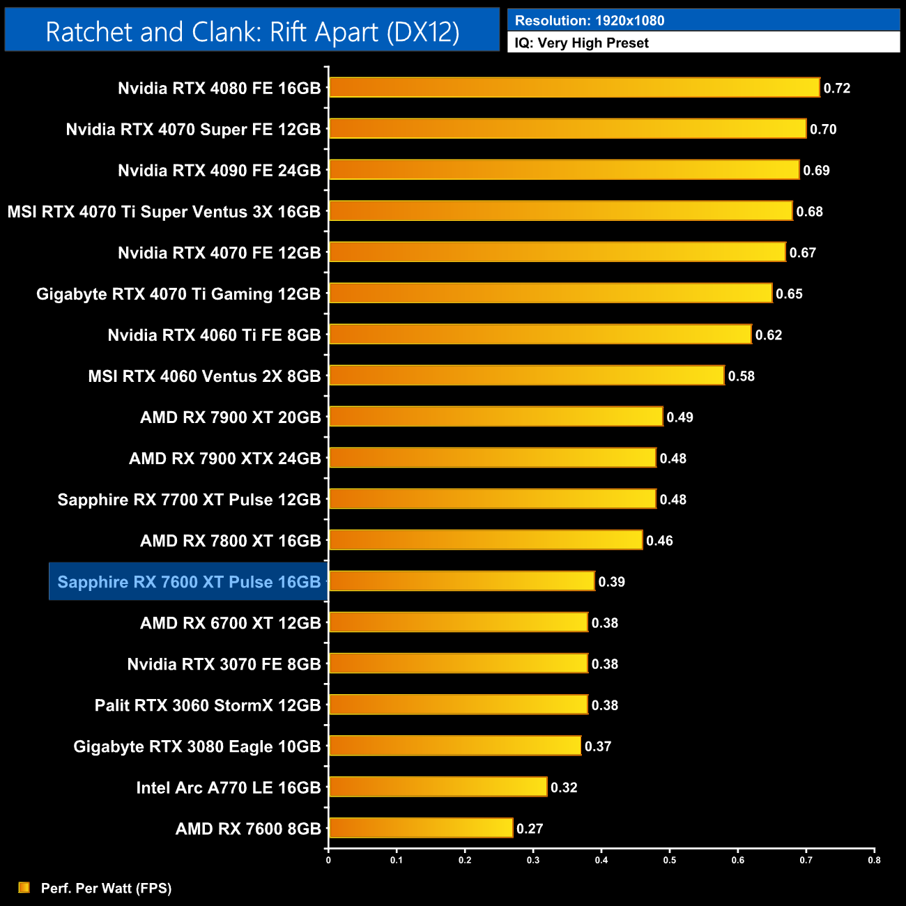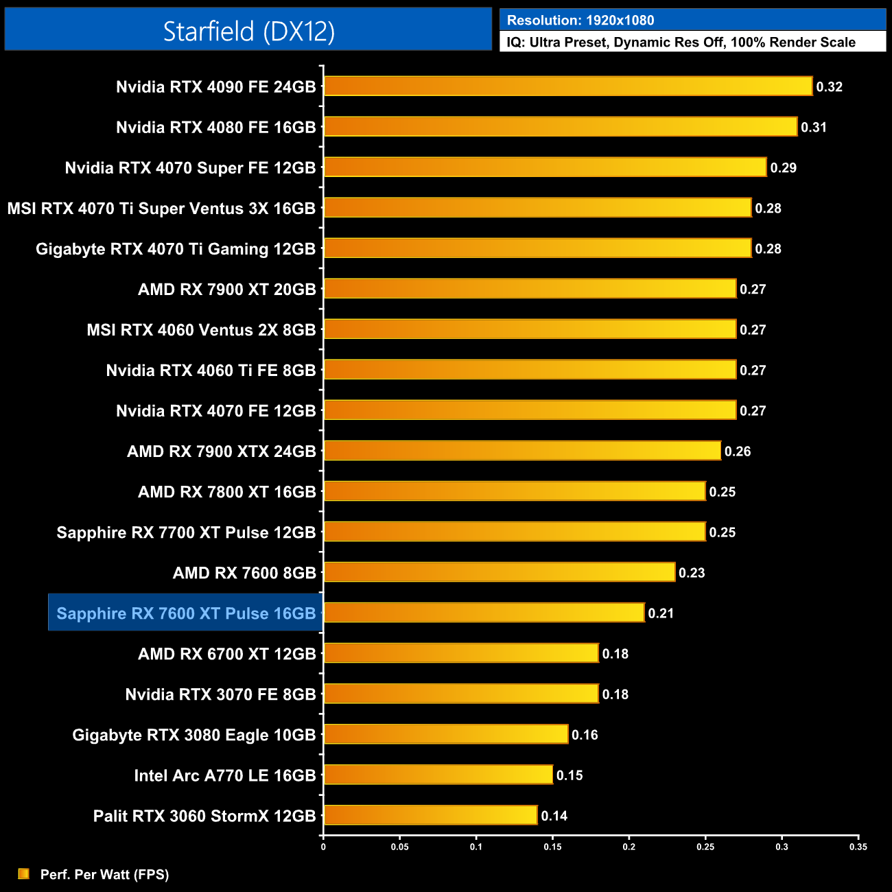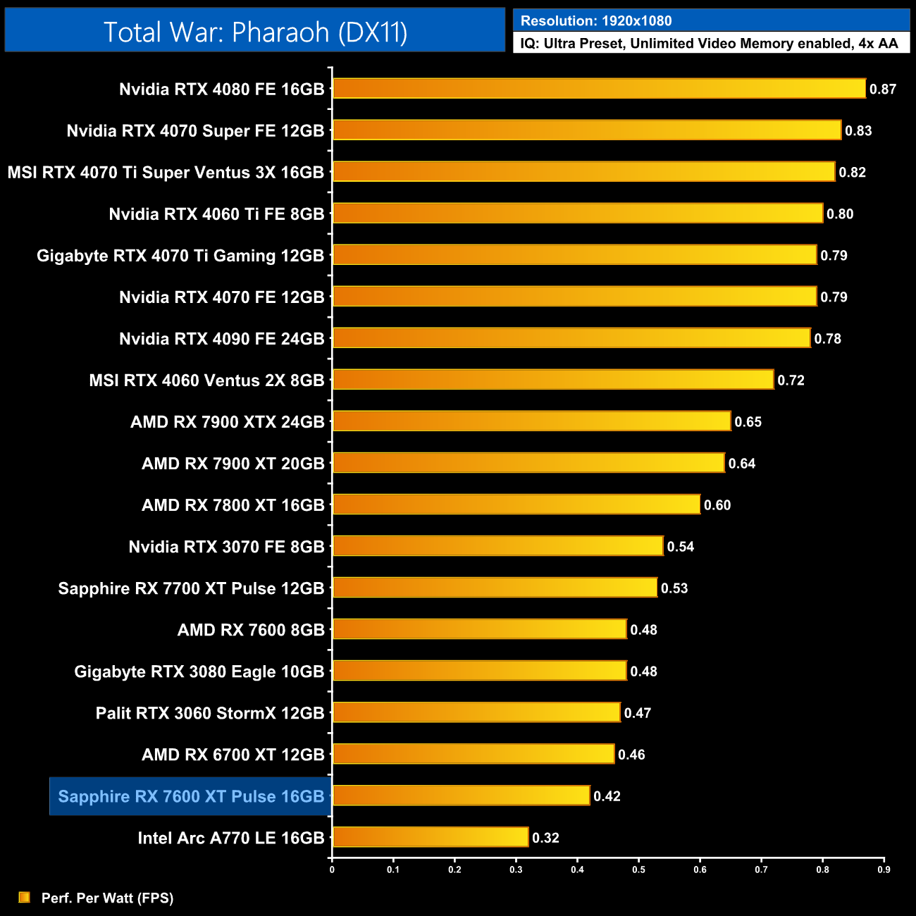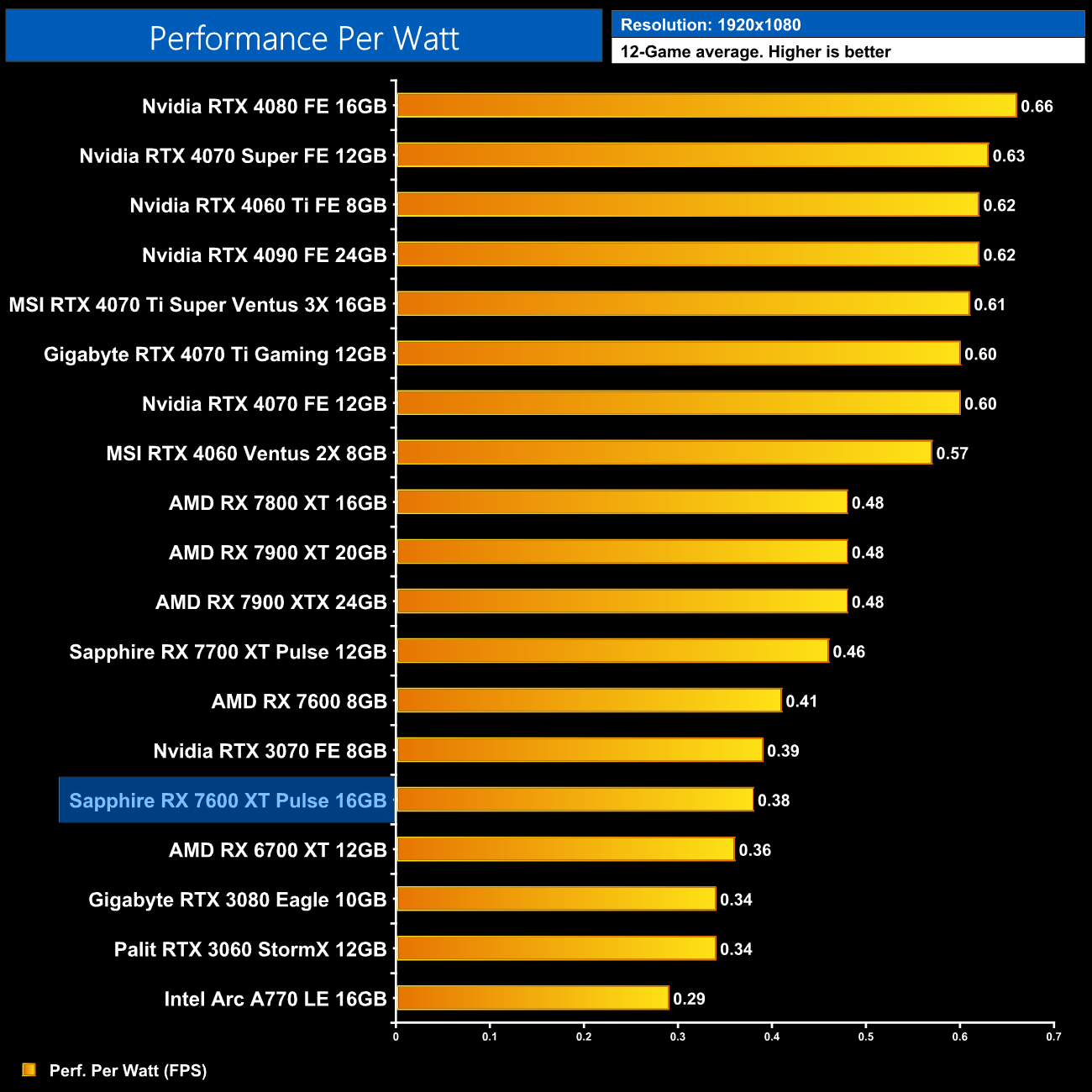 Using the graphics card-only power draw figures presented earlier in the review, here we present performance per Watt on a per-game basis for all twelve games we tested at 1080p.
