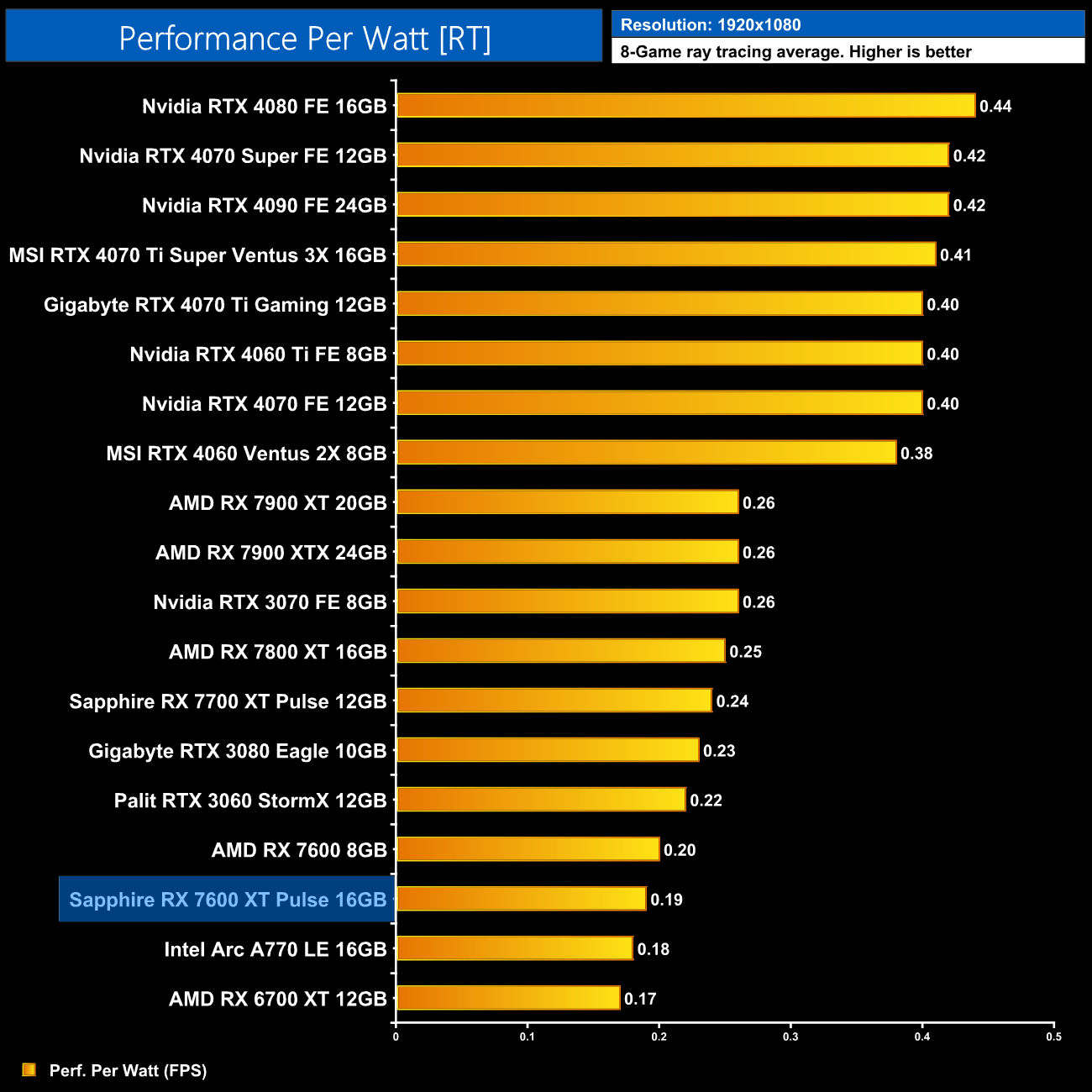 Given the roughly 19% increase in power draw over the RX 7600 for 12% more performance, the new RX 7600 XT is a step down in terms of efficiency. The RX 7600 wasn't very efficient to begin with, sticking with TSMC's 6nm node, so making things worse isn't great – overall performance per watt is below the last-gen RTX 3070, and barely any better than the RX 6700 XT.