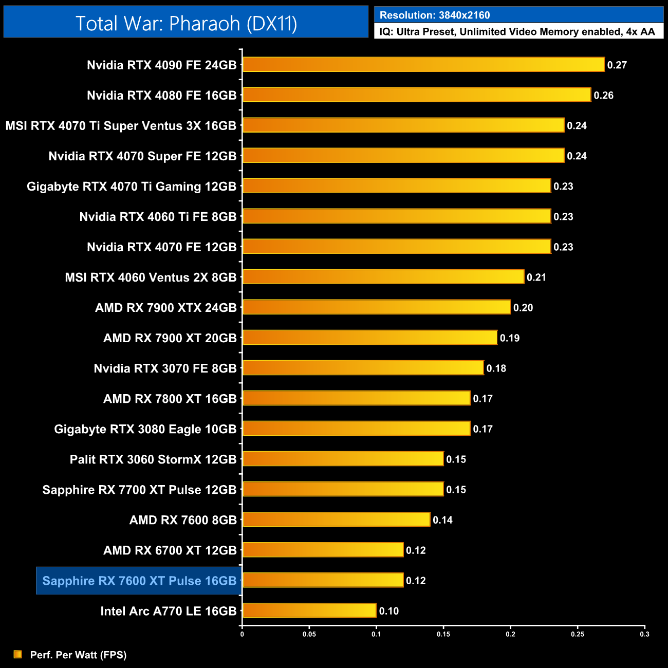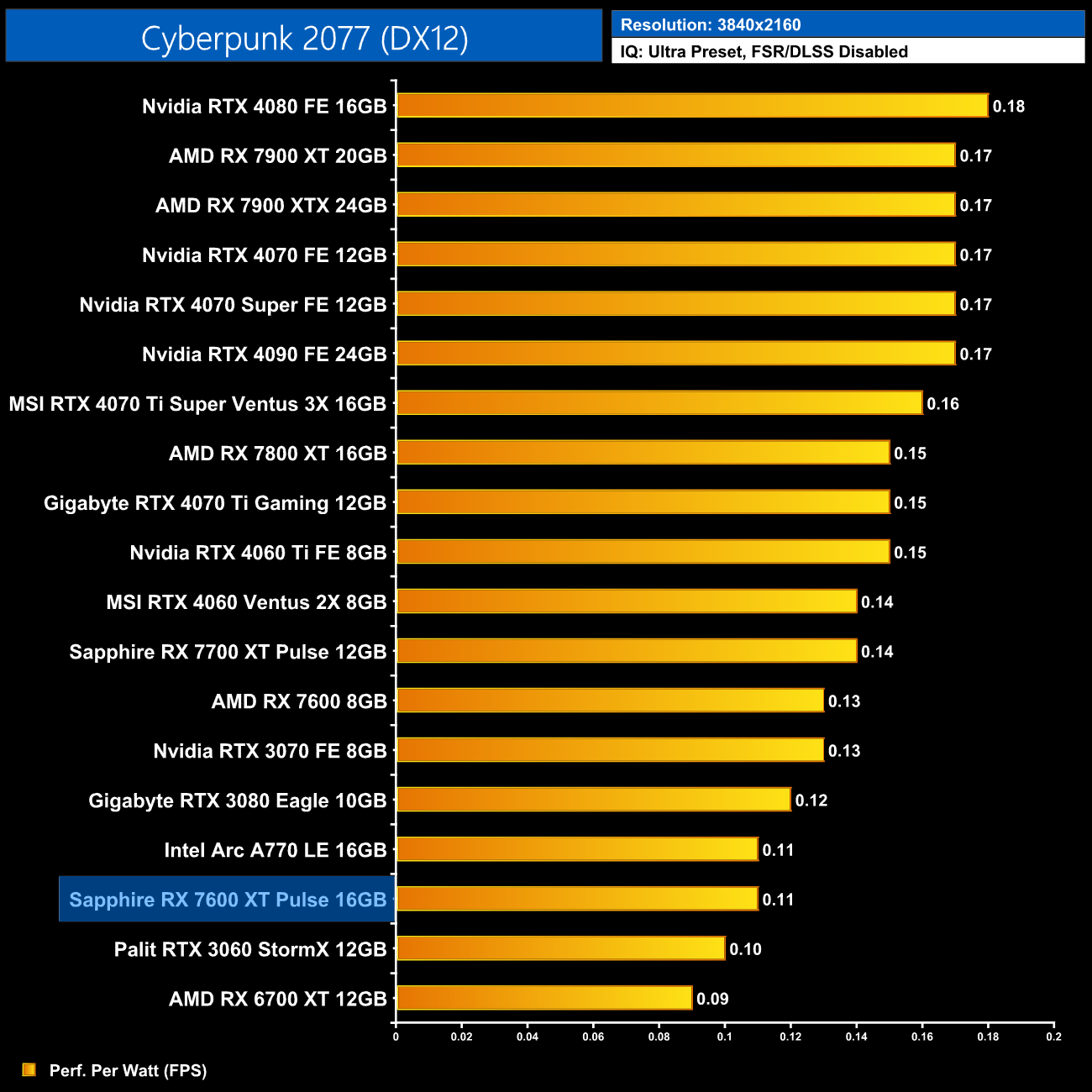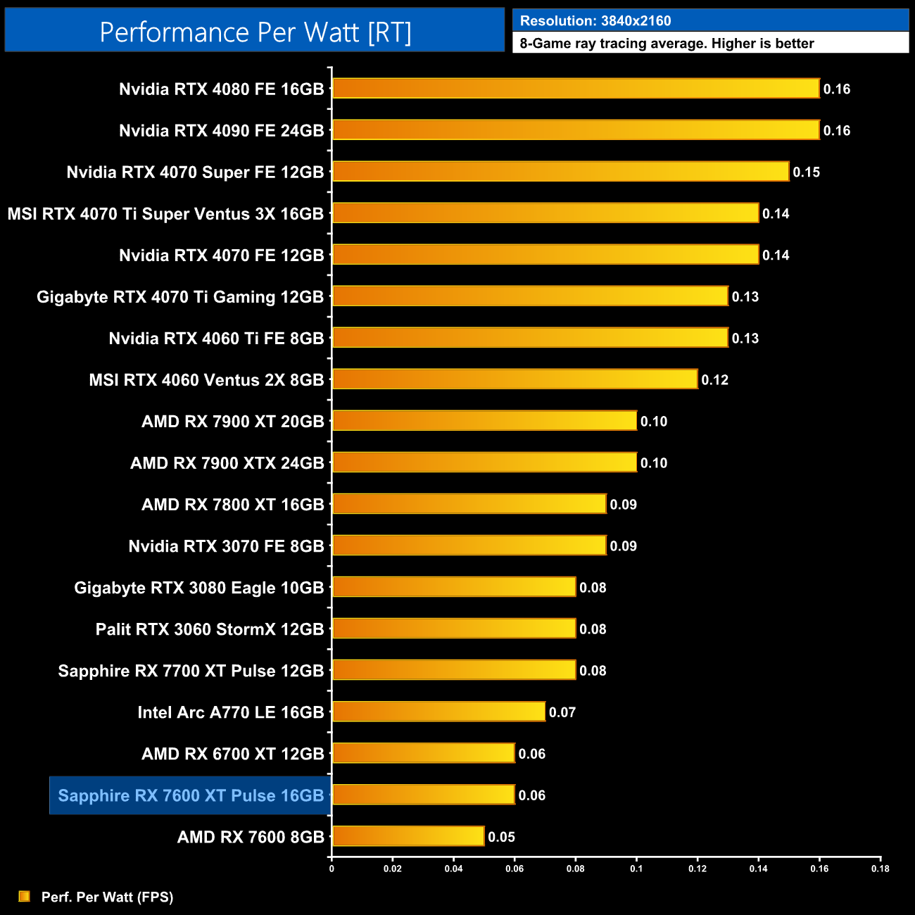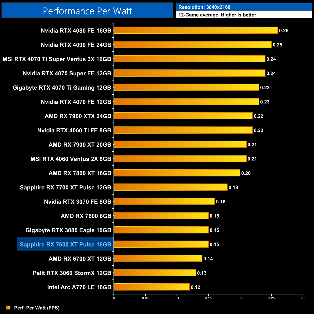 Finally, we have the 4K results, which are mostly academic but show performance per Watt matching the RTX 3080 10GB and RX 7600.