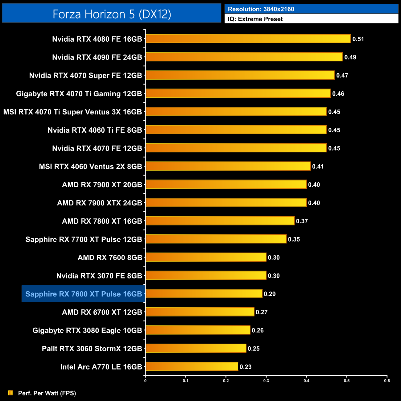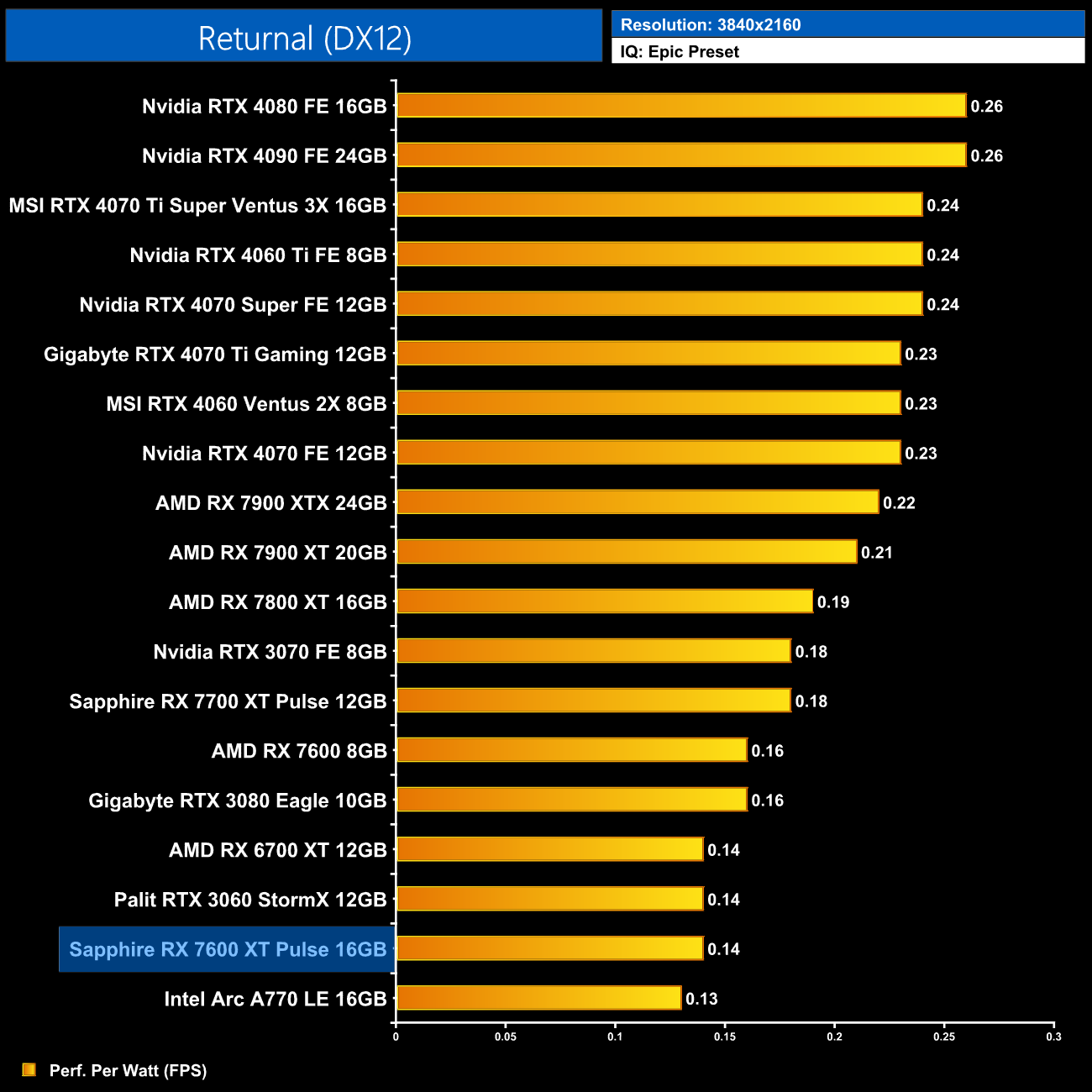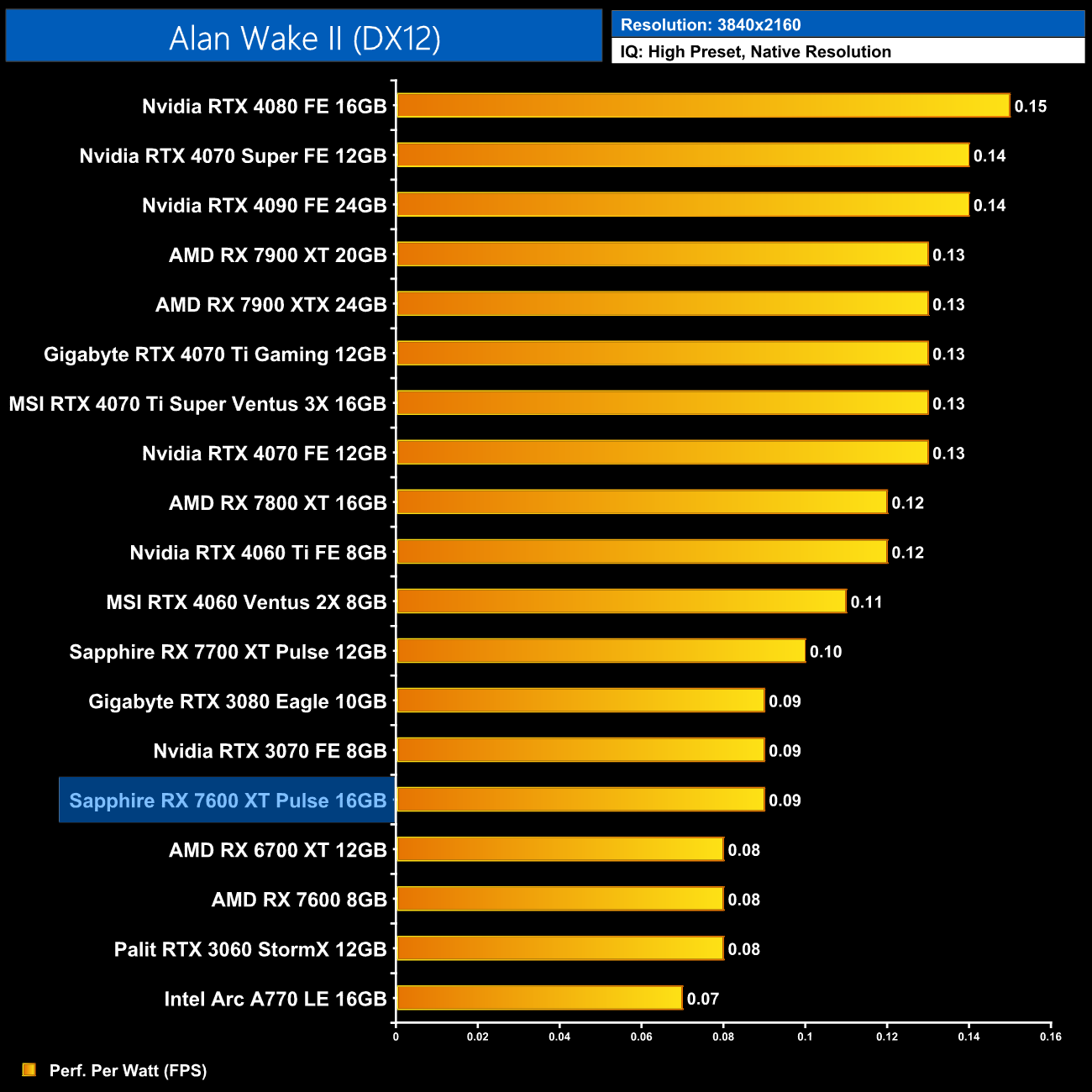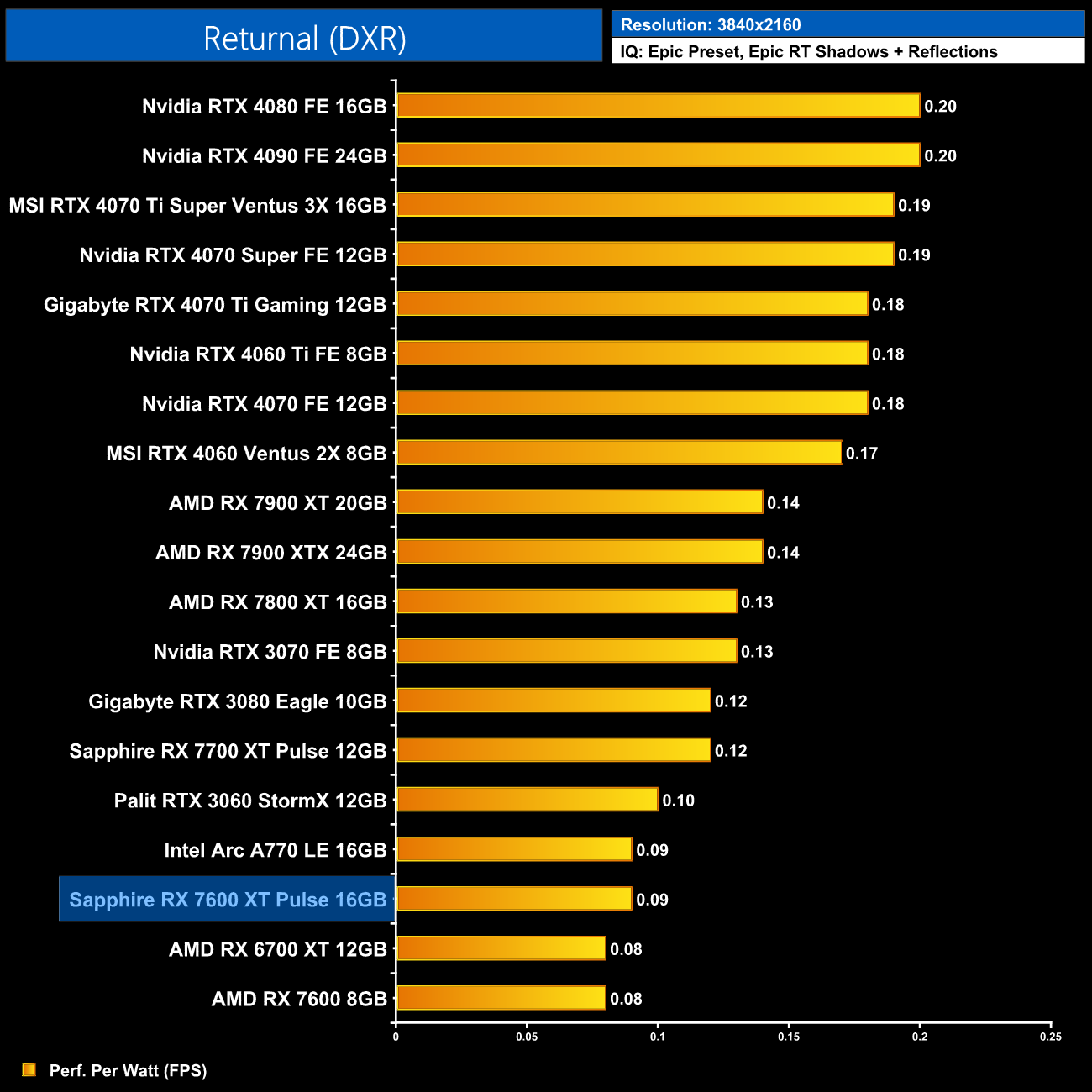 Finally, we have the 4K results, which are mostly academic but show performance per Watt matching the RTX 3080 10GB and RX 7600.