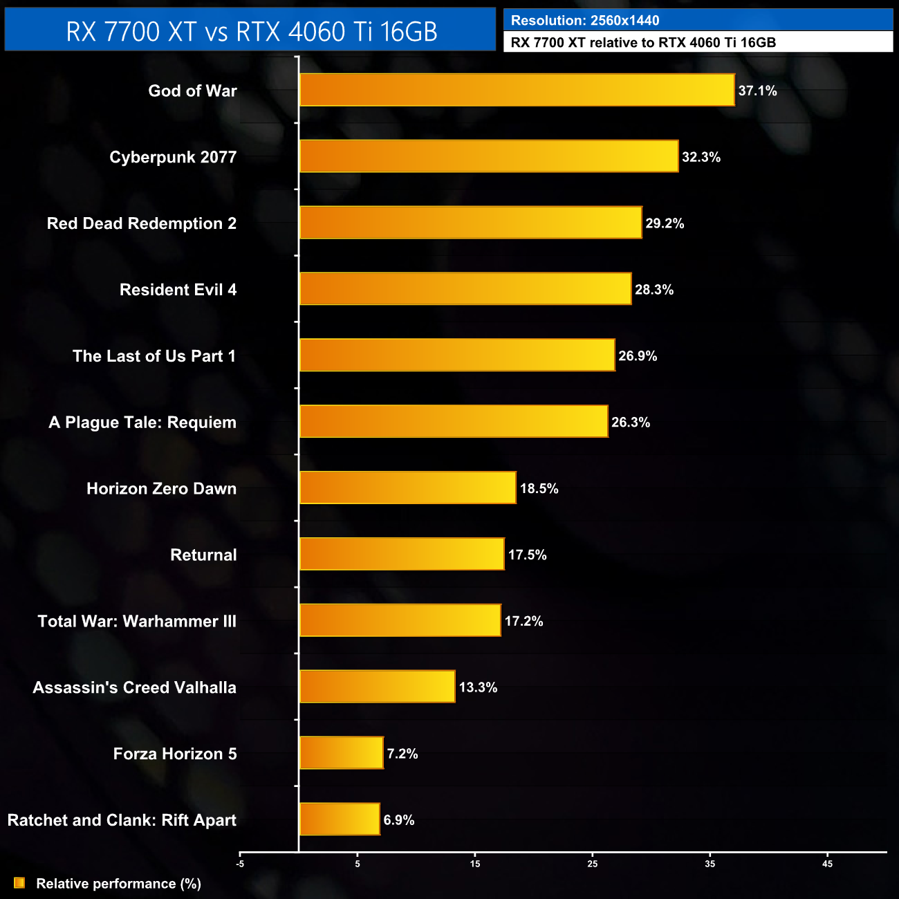 At worst, the RX 7700 XT is 7% faster than the RTX 4060 Ti 16GB, but 10 of the 12 games tested show at least a 10% lead for the AMD GPU. In fact, in half of the games tested it was more than 25% faster than its Nvidia rival, despite both GPU retailing for £430.