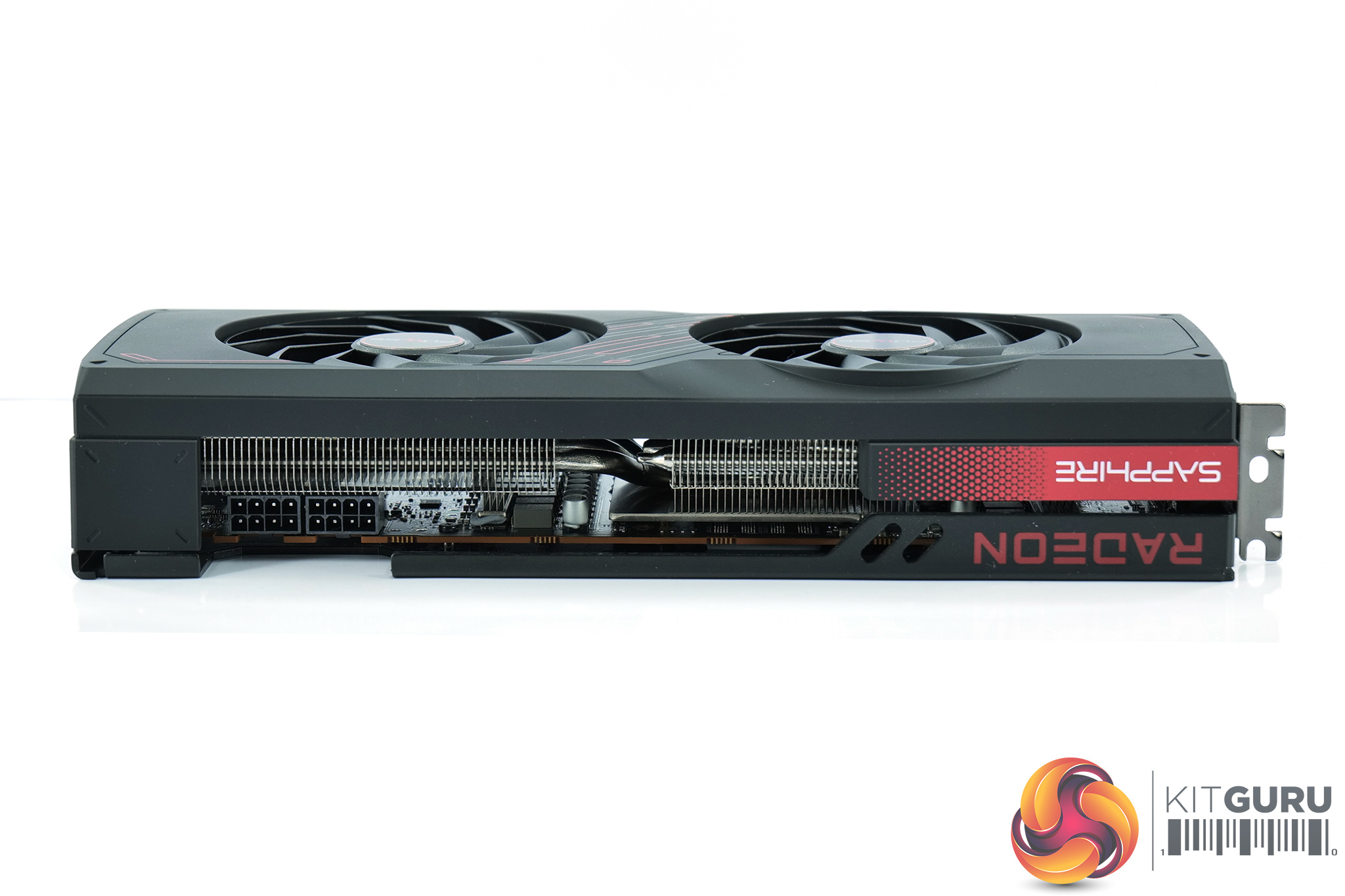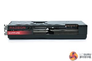 The side of the card is home to the Radeon and Sapphire logos, again coloured red. We can also note the full-length metal backplate, with the Pulse branding and an ECG printed in red – a staple of the Pulse series throughout the years.