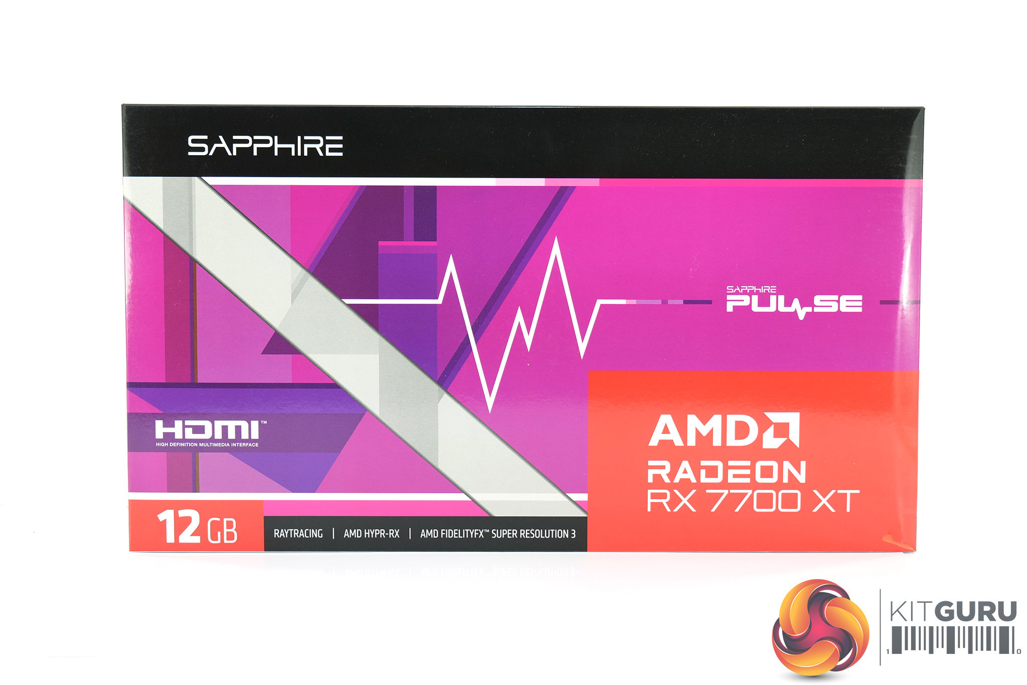 The Sapphire RX 7700 XT Pulse ships in a bright purple box, with a large AMD Radeon logo and 7700 XT branding in the bottom corner. Inside, the only included accessory was a short quick installation guide.