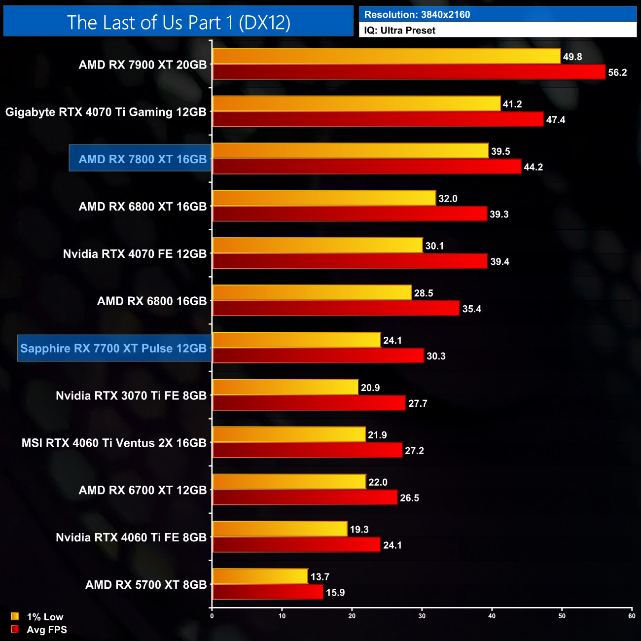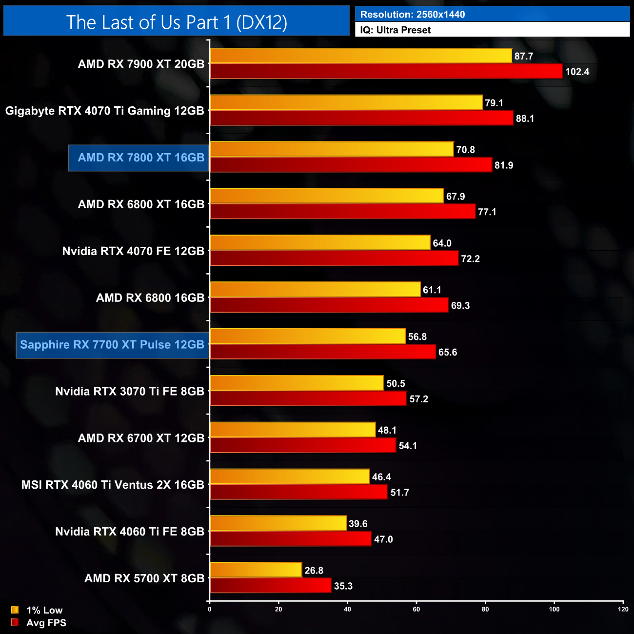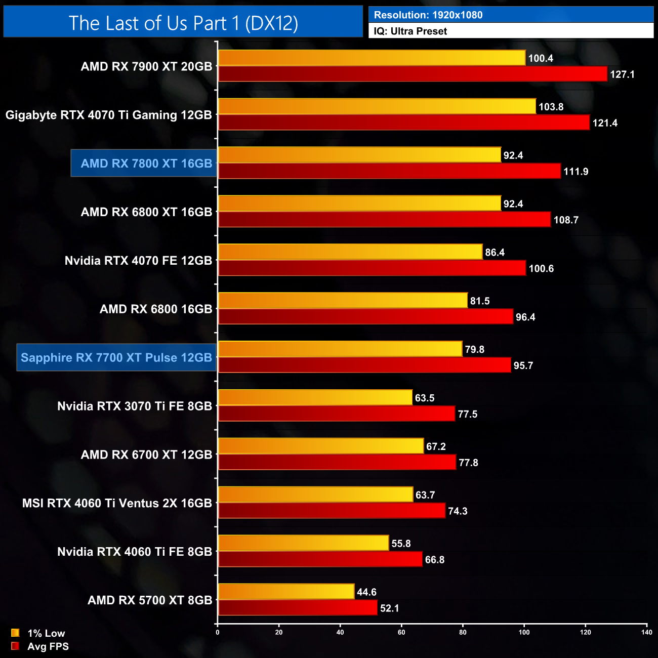 We do see more of a gap between the RX 7800 XT and RTX 4070 in The Last of Us Part 1, where the AMD GPU holds a 13% lead over its Nvidia rival, delivering 80FPS on average in the process.