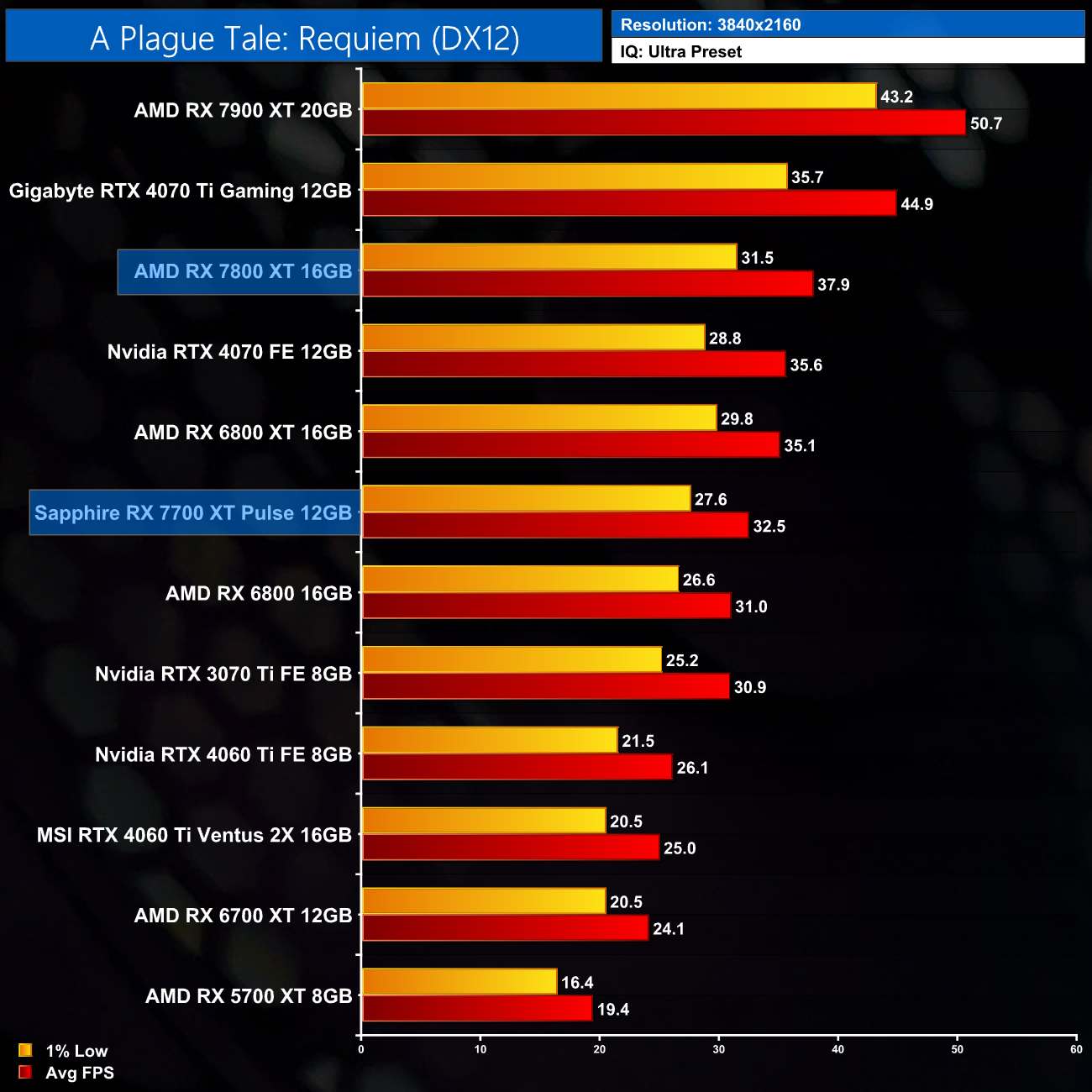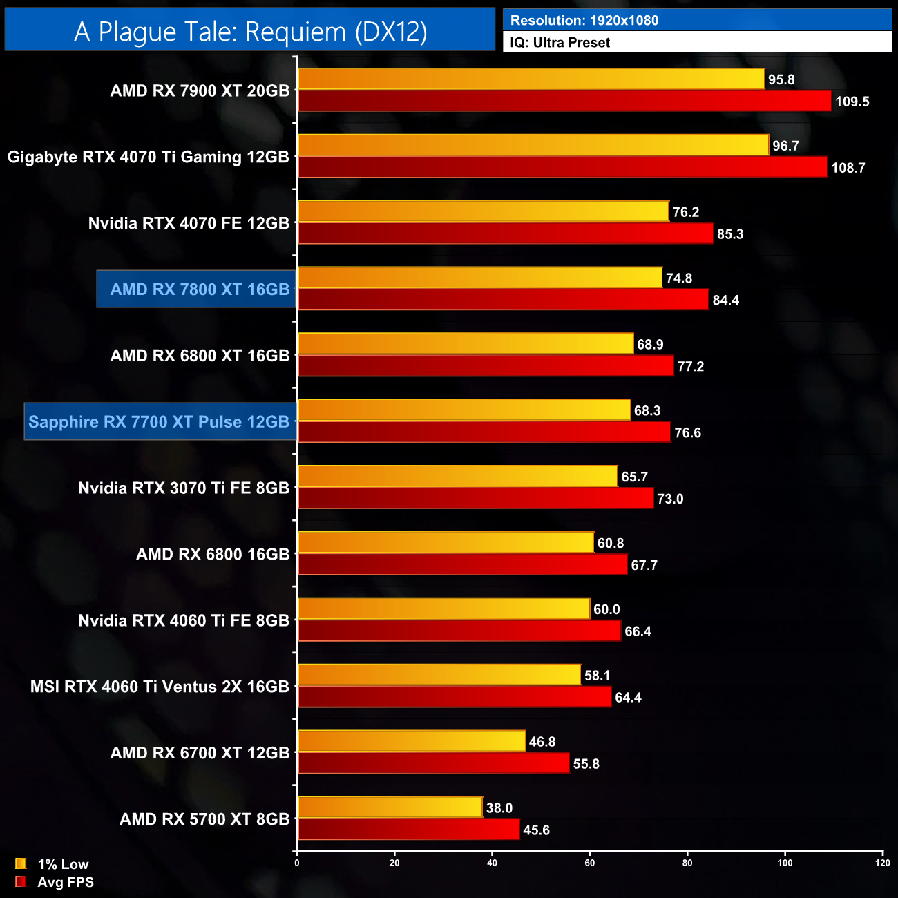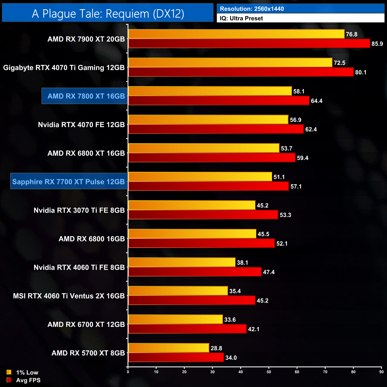 As for A Plague Tale: Requiem, here the RTX 4070 and 7800 XT are locking horns once again, both deliver over 60FPS at 1440p but there's not much to split between them.