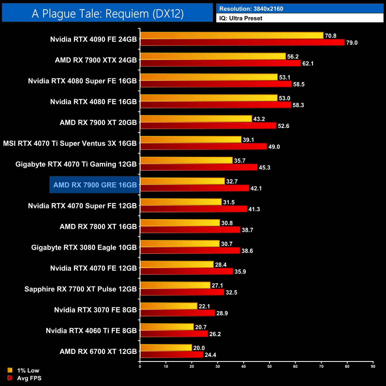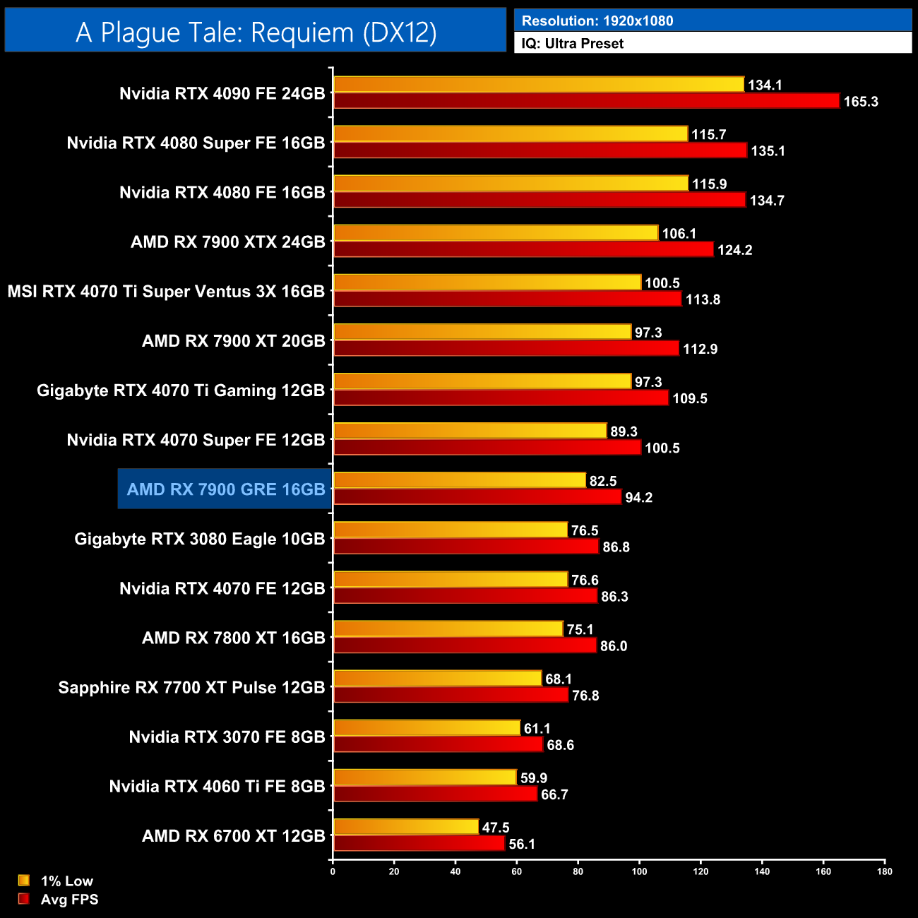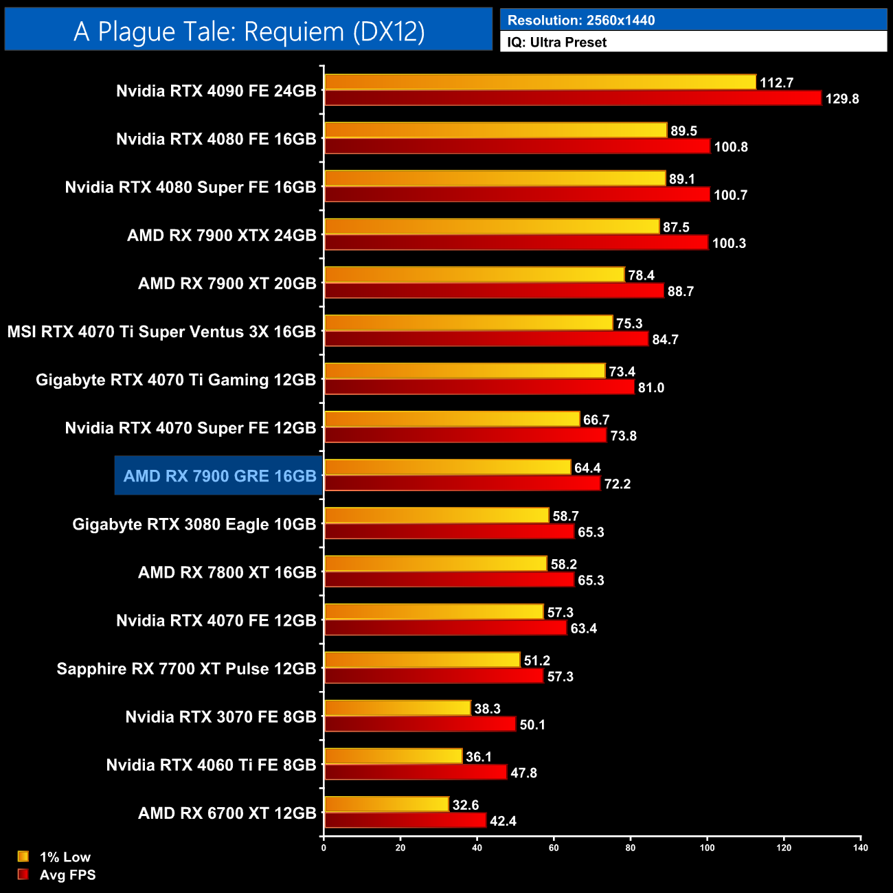 As for A Plague Tale: Requiem, at 1440p the 7900 GRE is once again trading blows with the 4070 Super, as both GPUs deliver frame rates in the low 70s.
