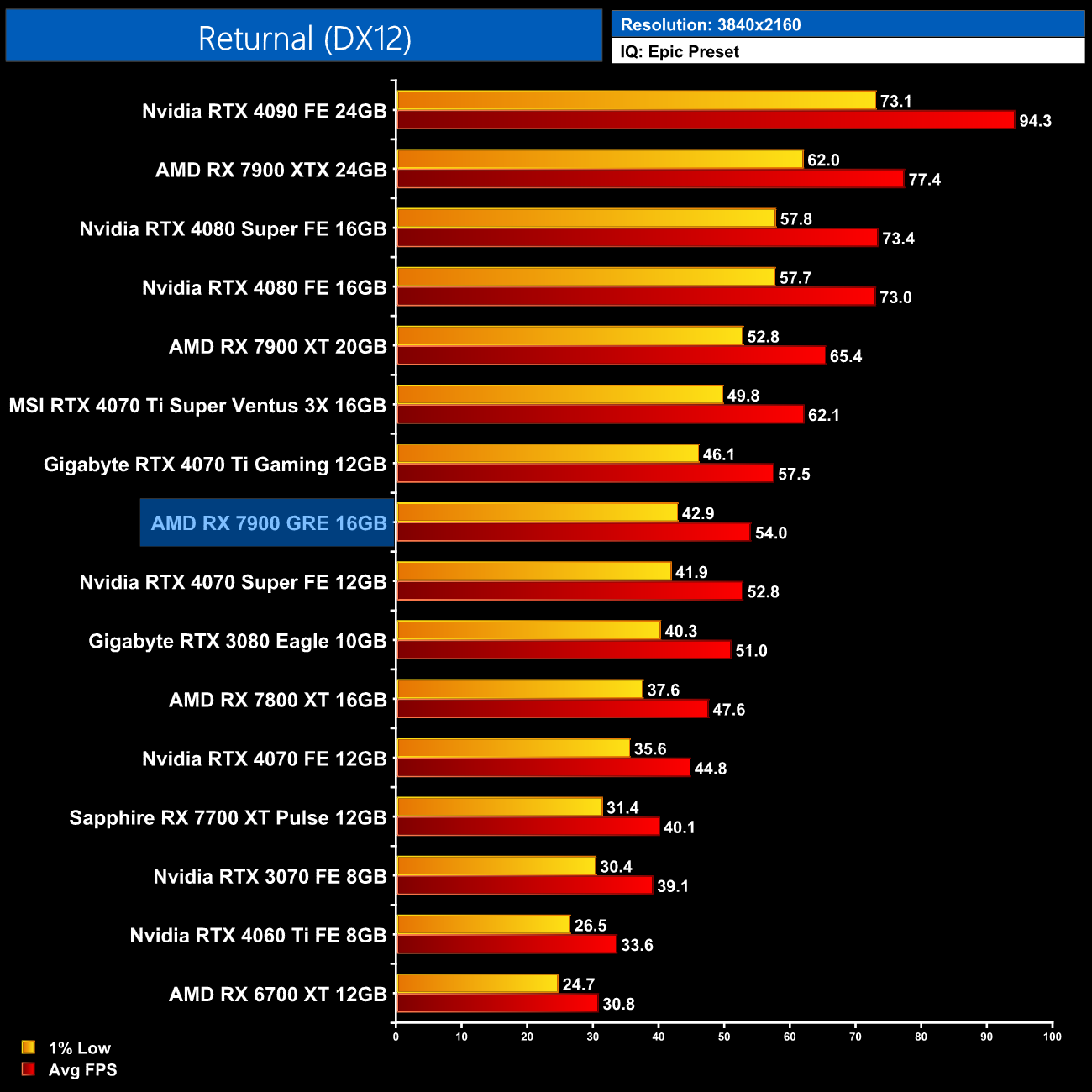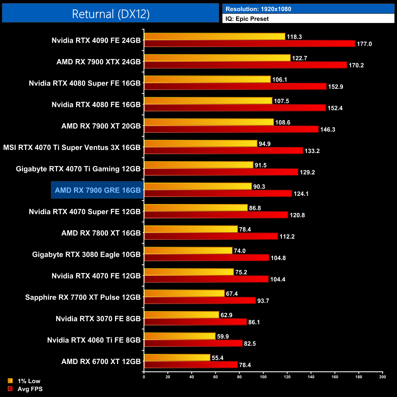 Returnal shows more competitive performance from the 7900 GRE, as at 1440p it is a hair faster than the RTX 4070 Super and not too far behind the 4070 Ti.
