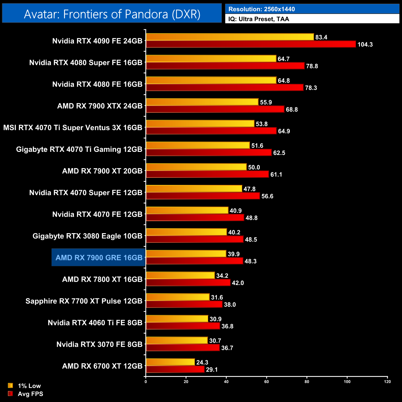 Avatar: Frontiers of Pandora is a lot more performant with the 7900 GRE, hitting 48FPS without any form of upscaling. That puts it level with the likes of the RTX 3080 10GB and RTX 4070, while it's 15% faster than the 7800 XT here.