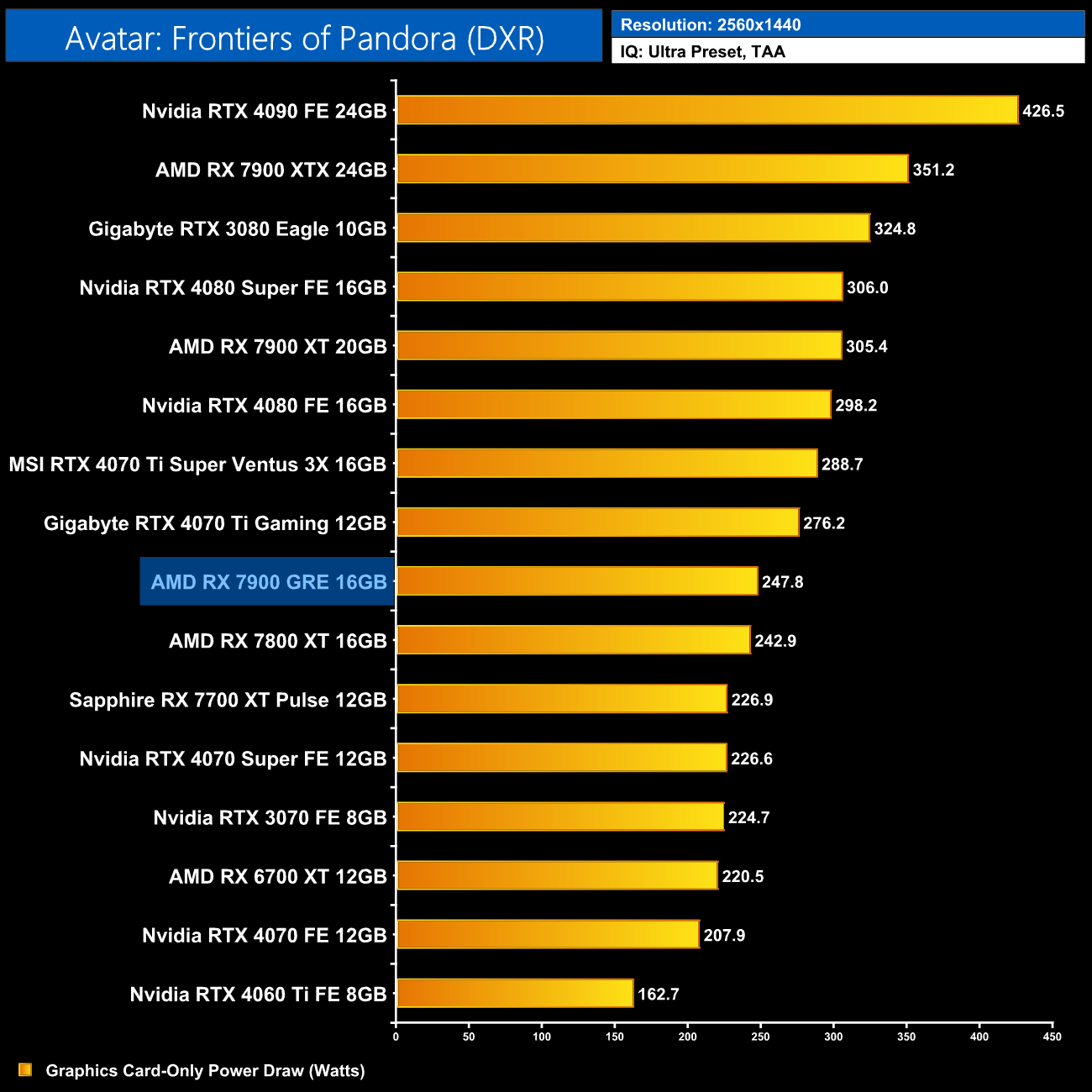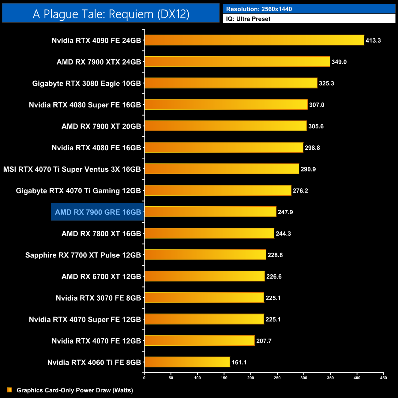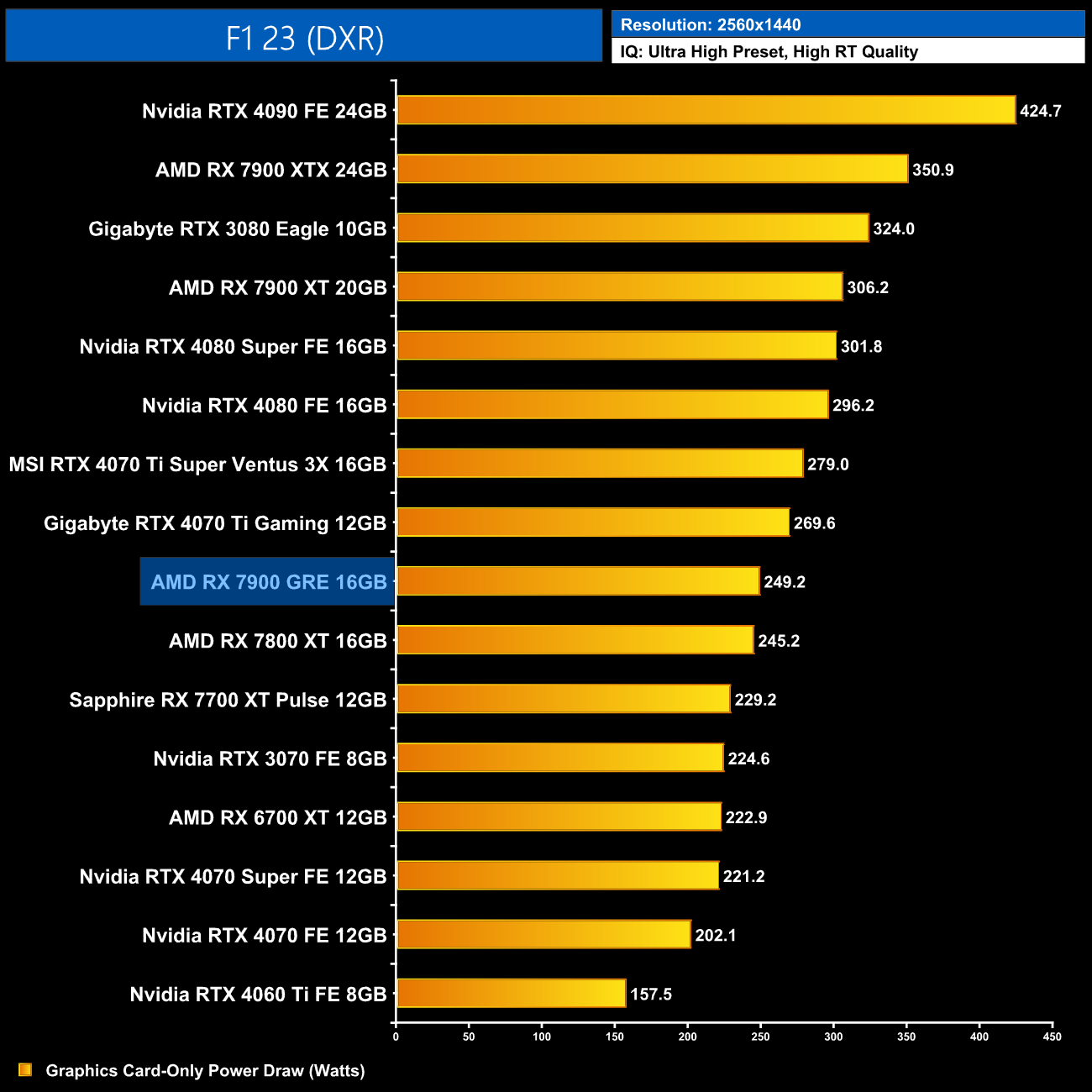 Average power draw is basically unchanged at 1440p compared to the 1080p data, still hovering below the 250W, while the 7900 GRE pulls just 4W more than the RX 7800 XT.