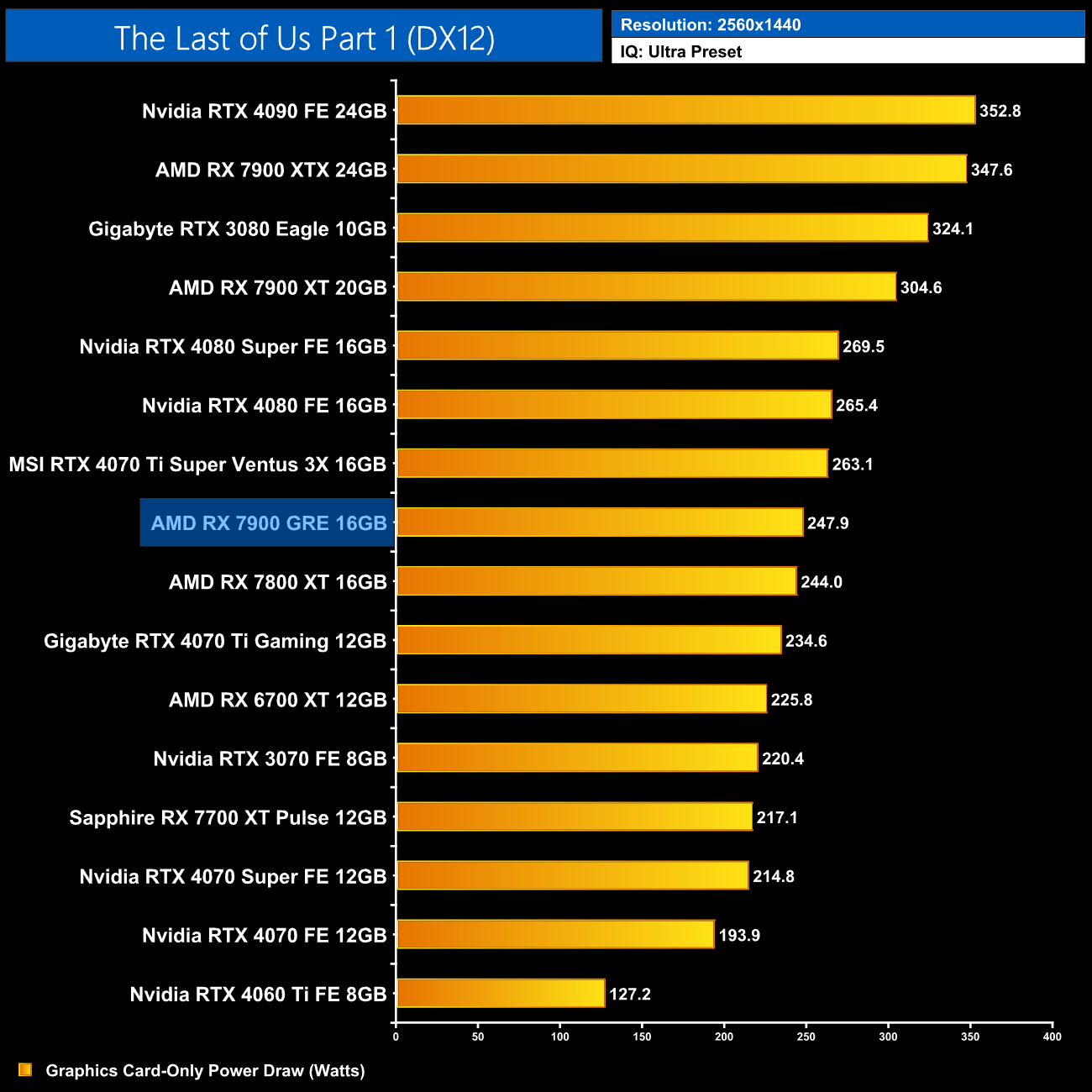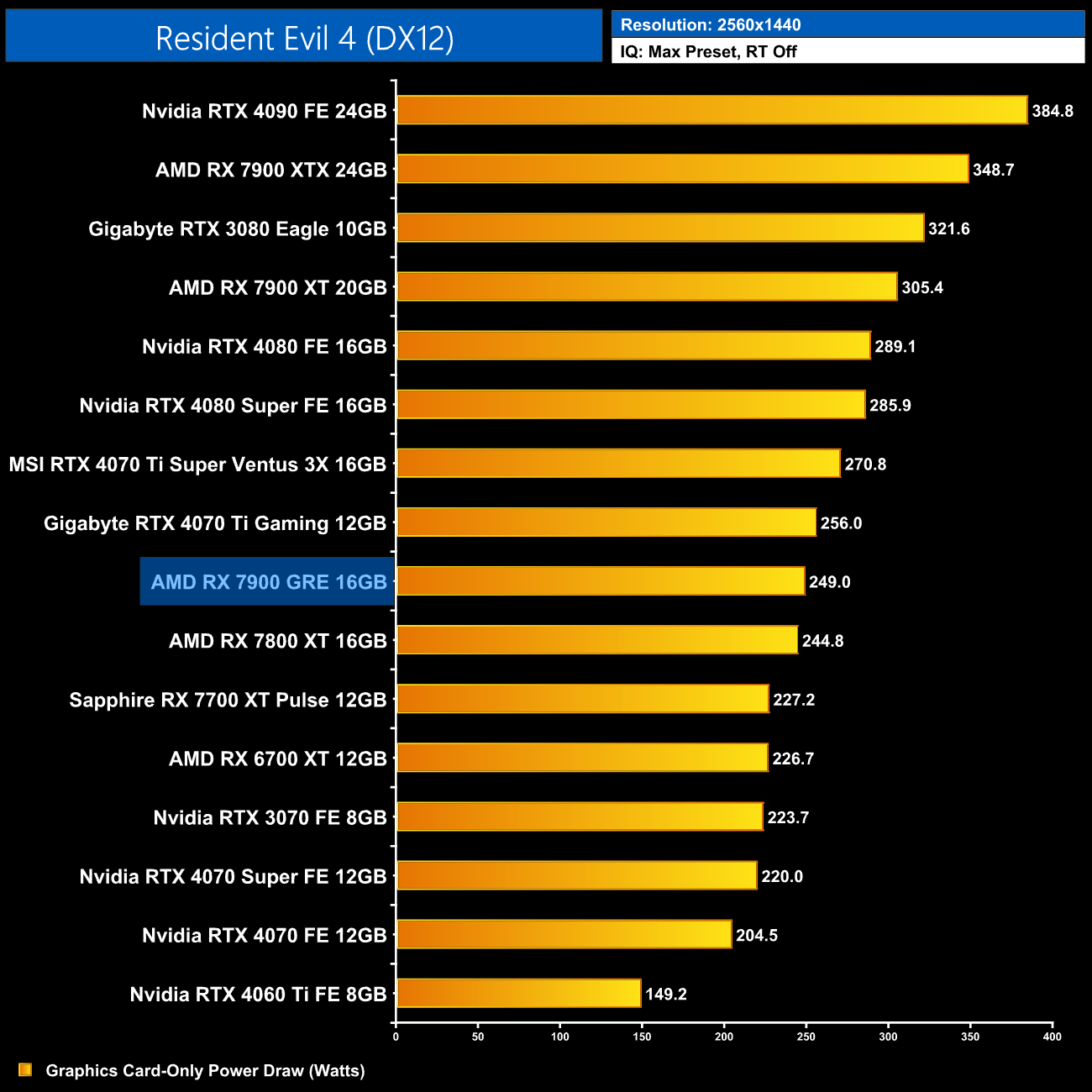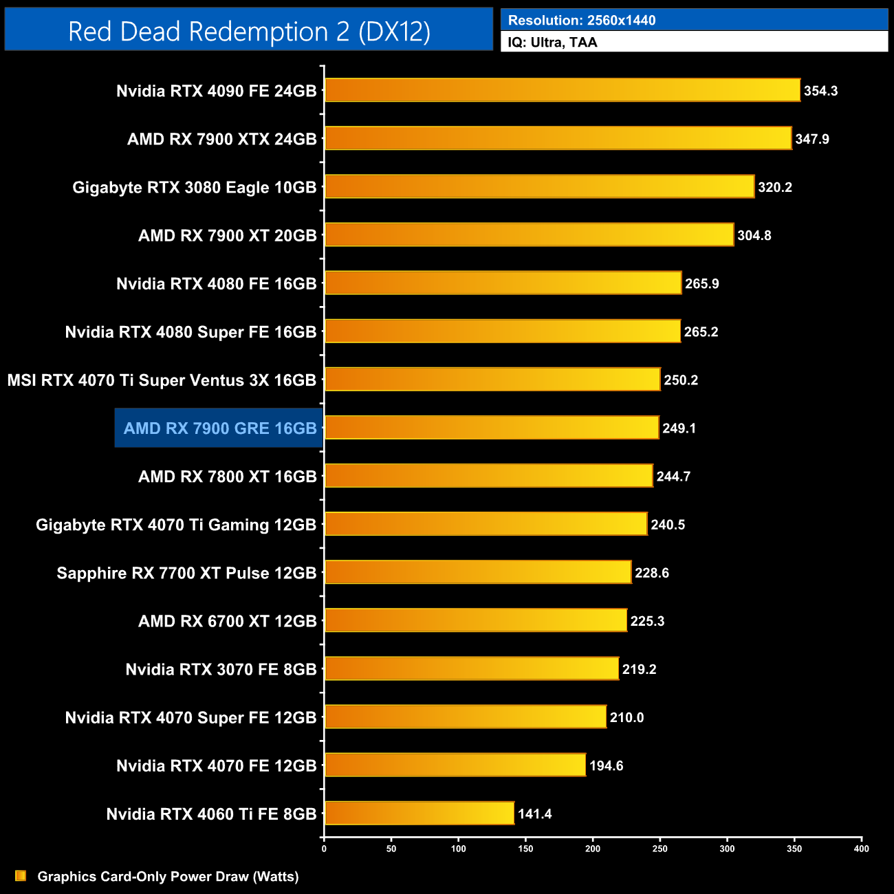 Average power draw is basically unchanged at 1440p compared to the 1080p data, still hovering below the 250W, while the 7900 GRE pulls just 4W more than the RX 7800 XT.