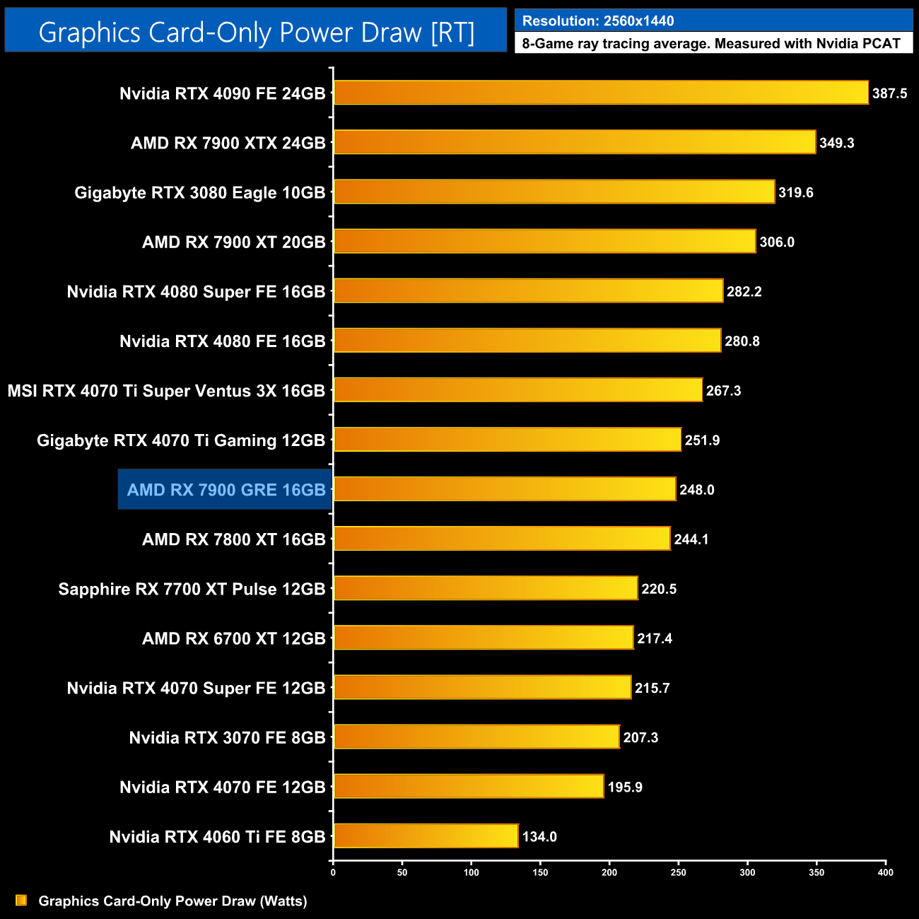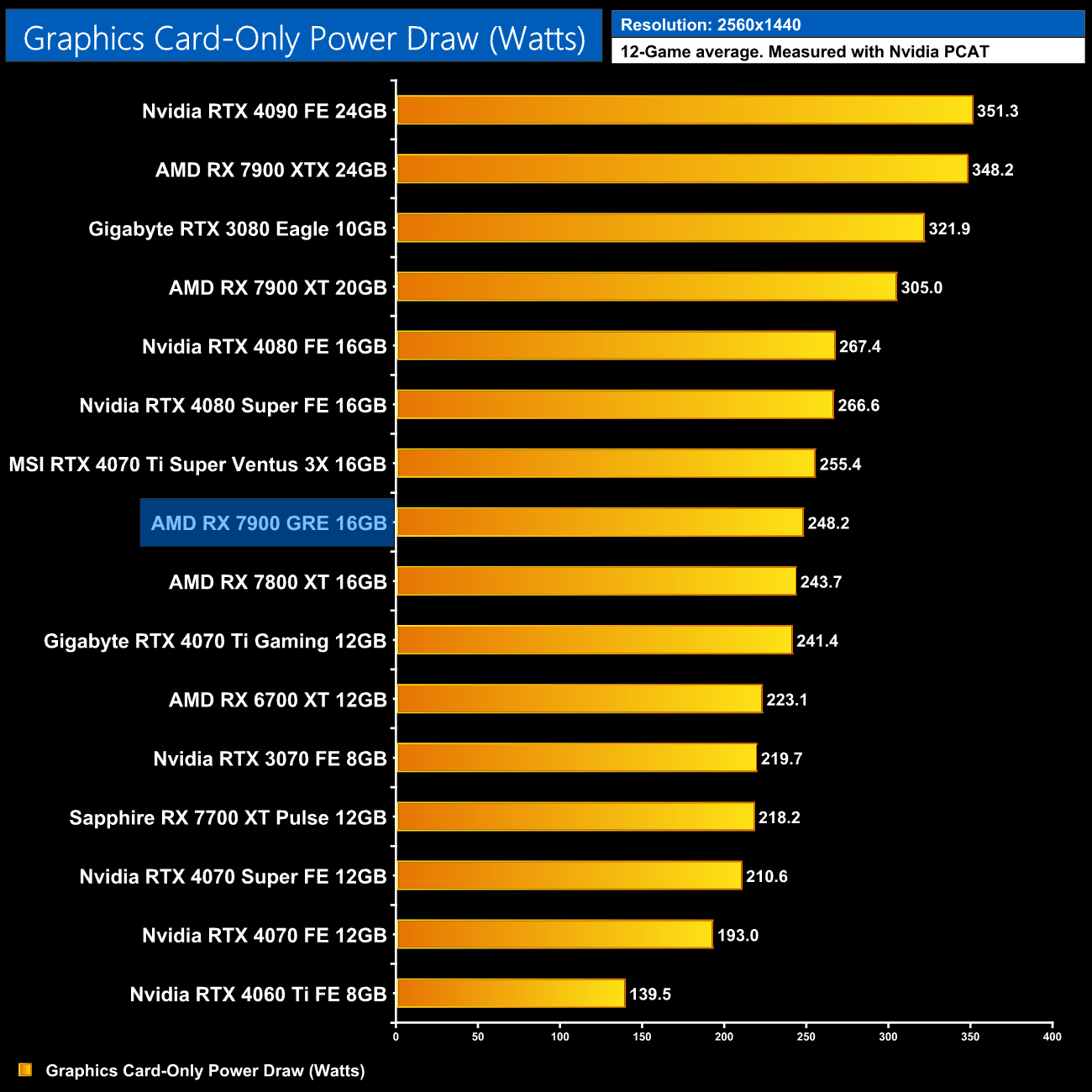Here we present power draw figures for the graphics card-only, on a per-game basis for all twelve games we tested at 1440p. This is measured using Nvidia's Power Capture Analysis Tool, also known as PCAT. You can read more about our updated power draw testing methodology HERE.