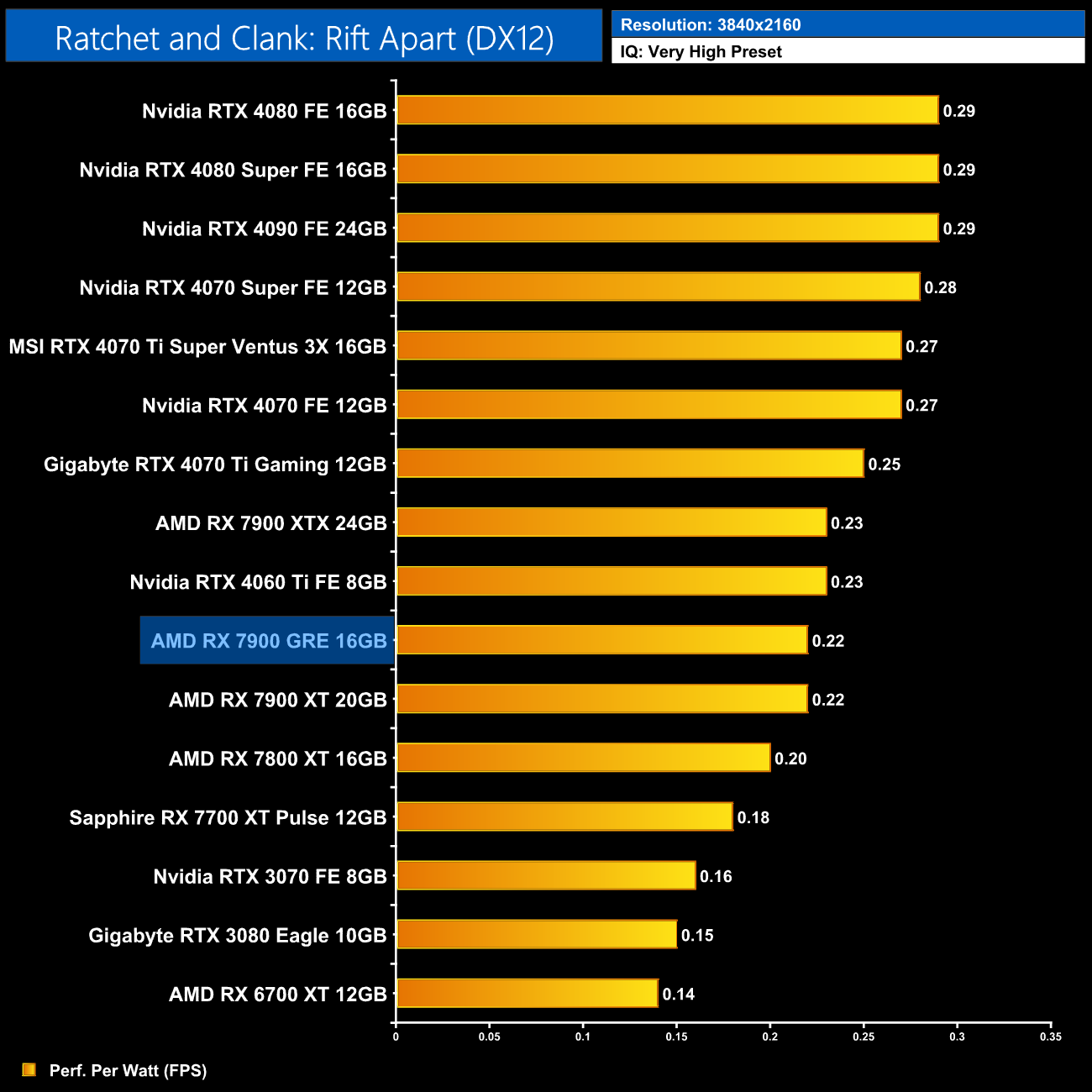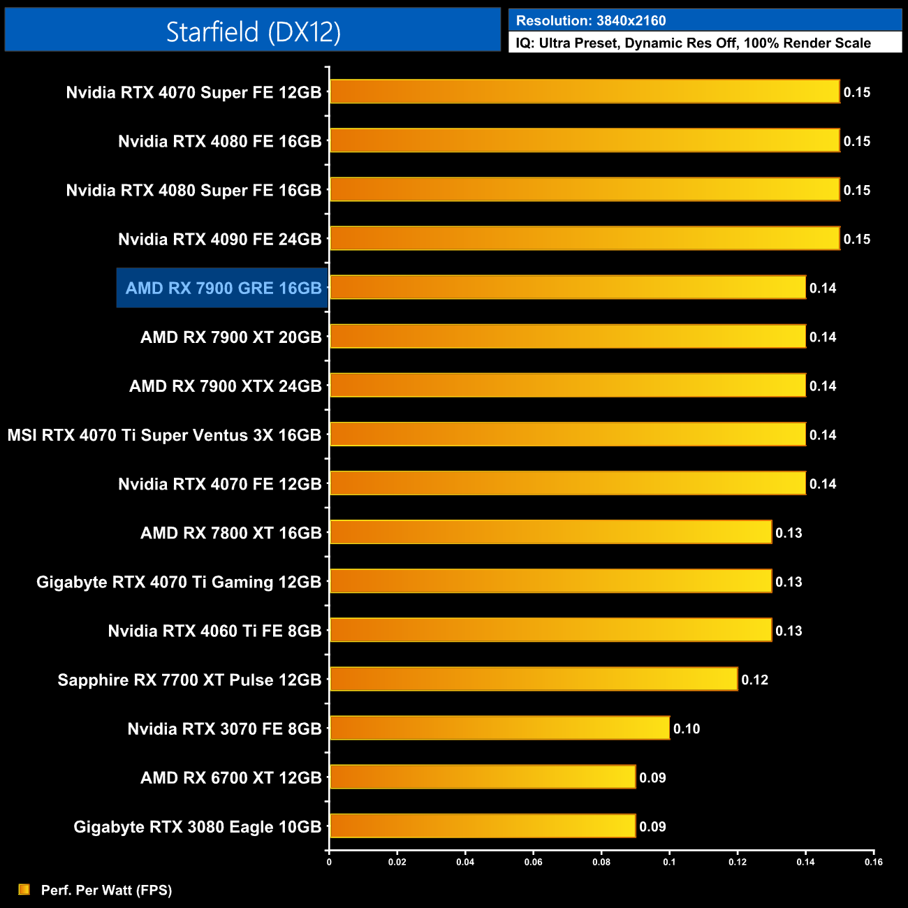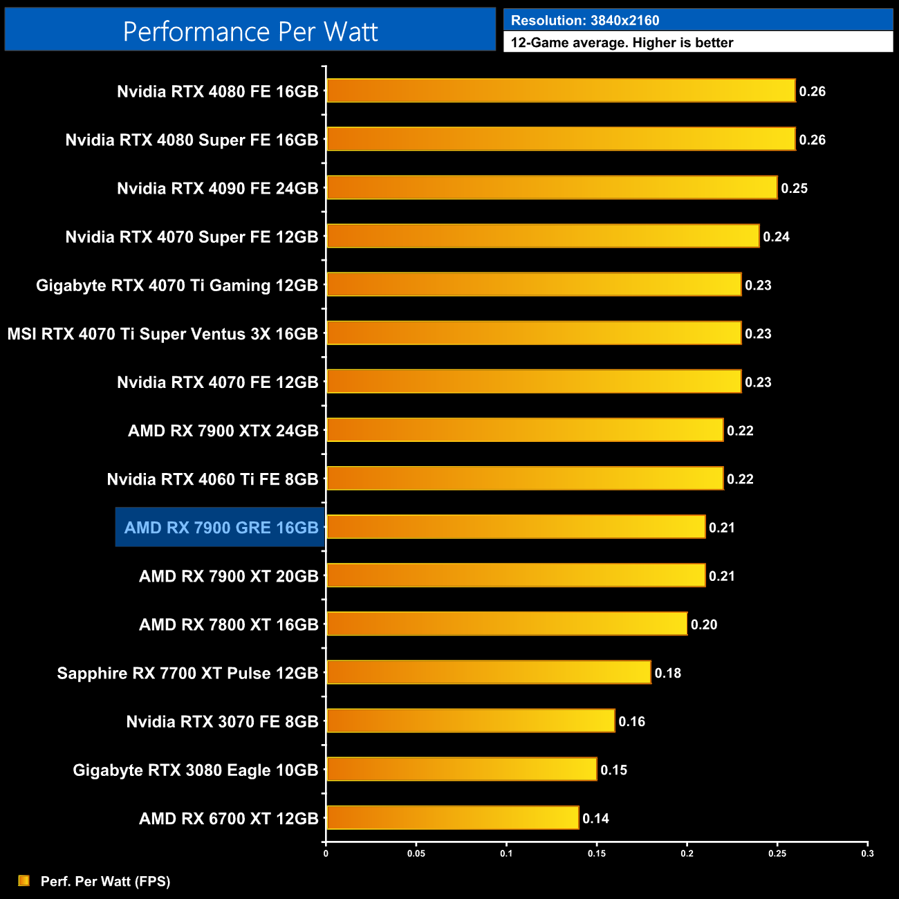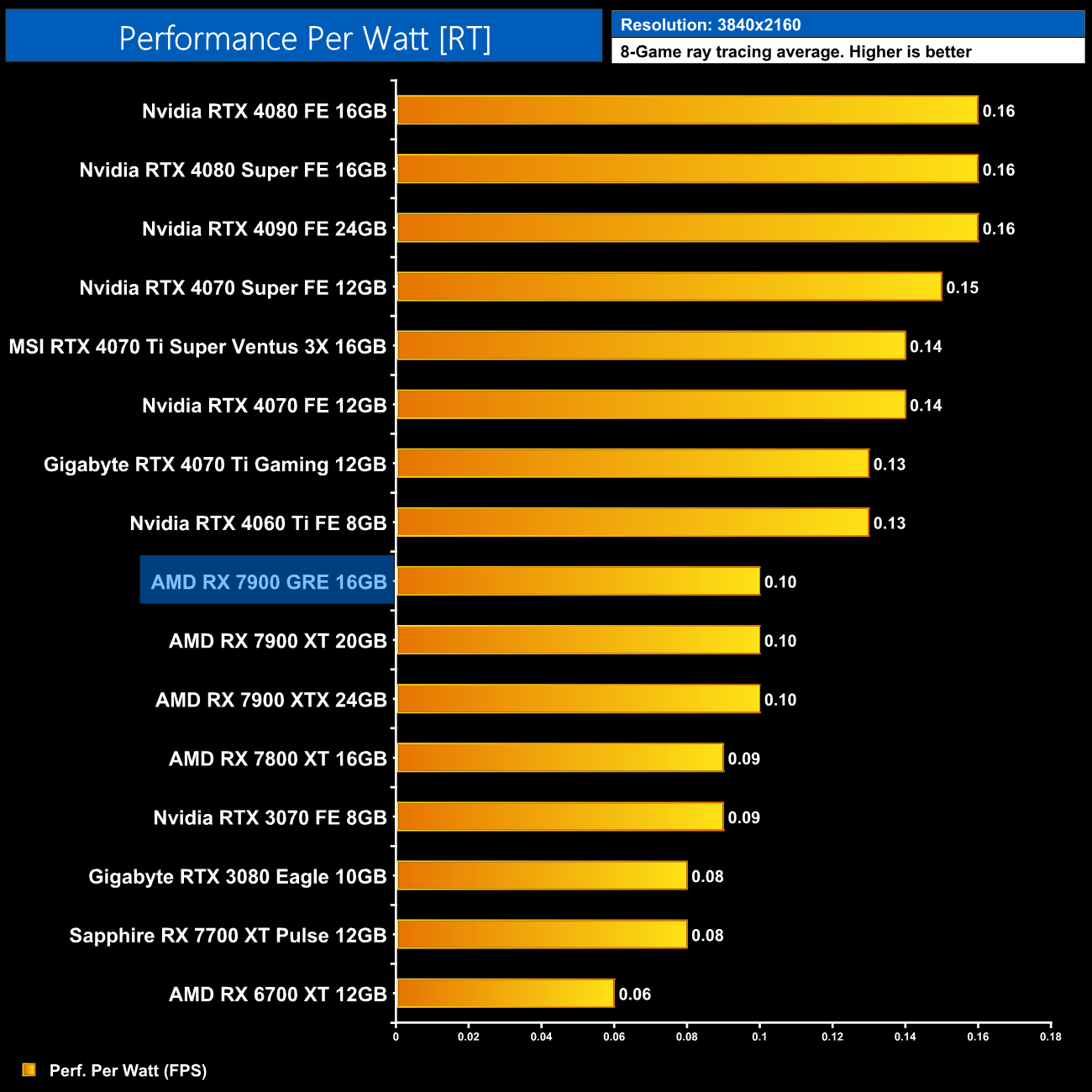 Lastly, at 4K we can see overall efficiency is still level with the RX 7900 XT and a hair ahead of the RX 7800 XT.