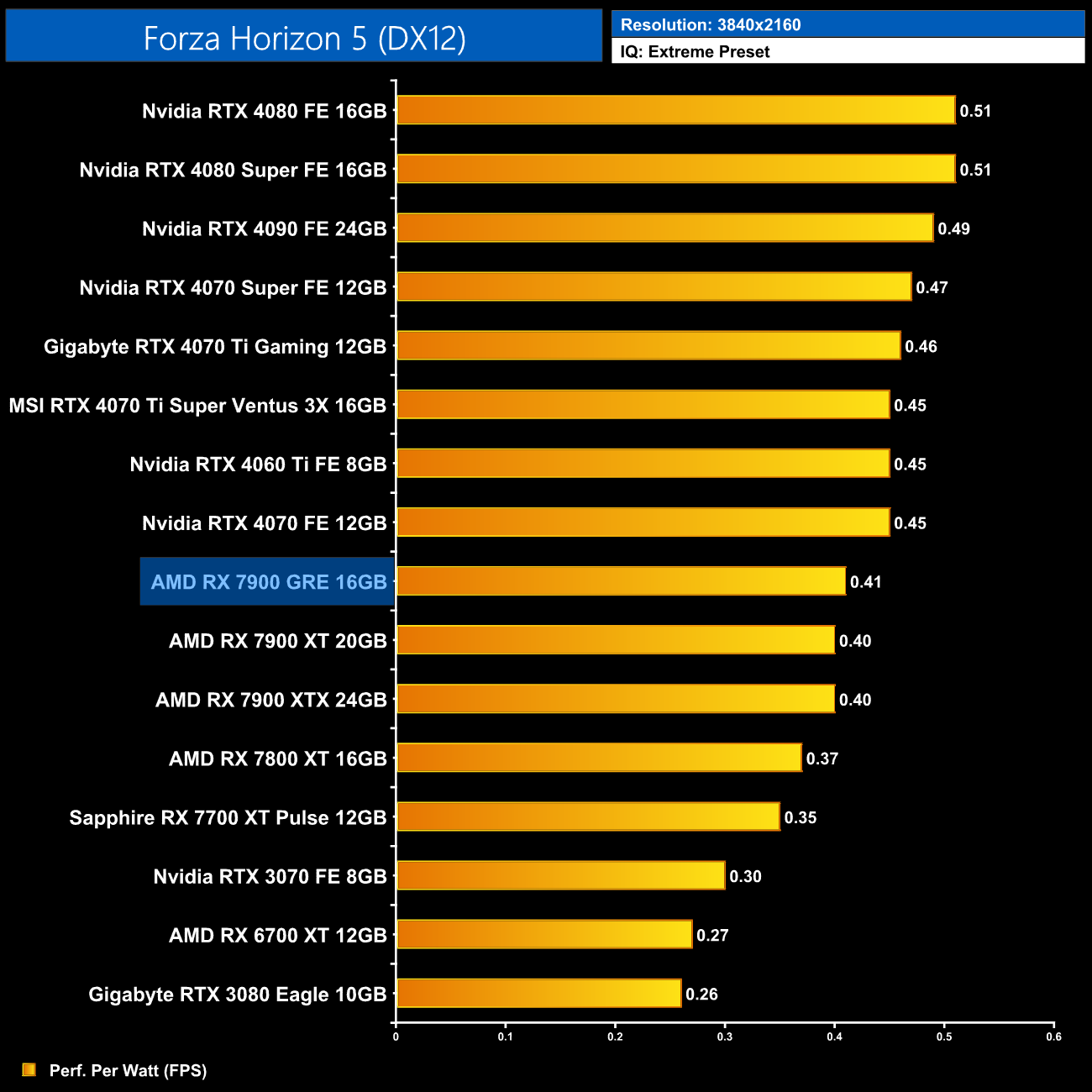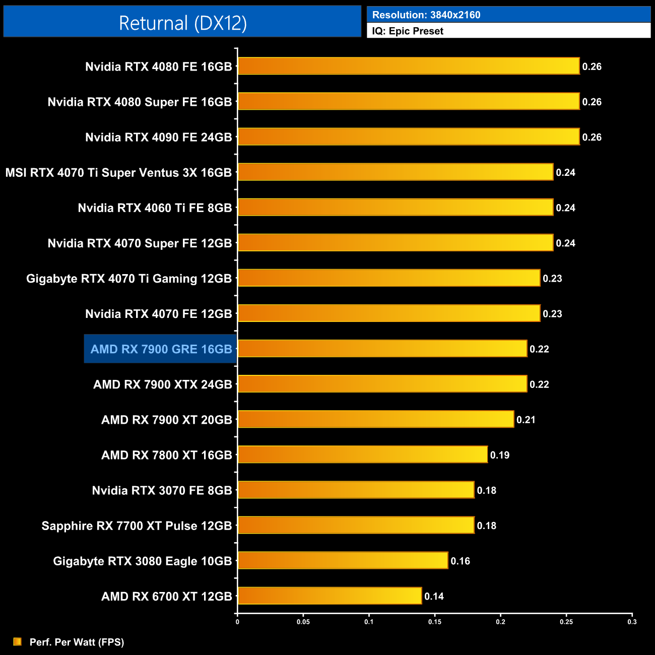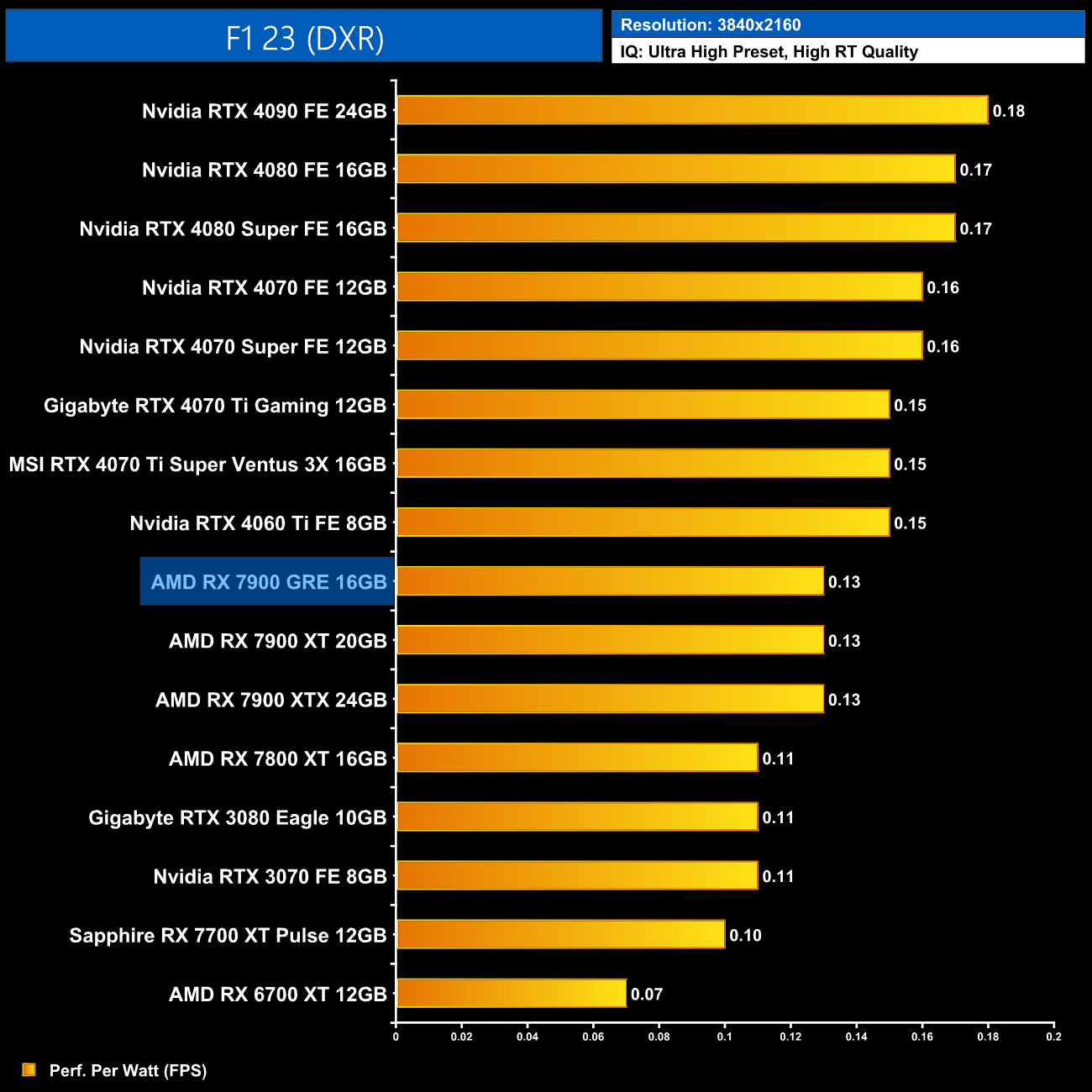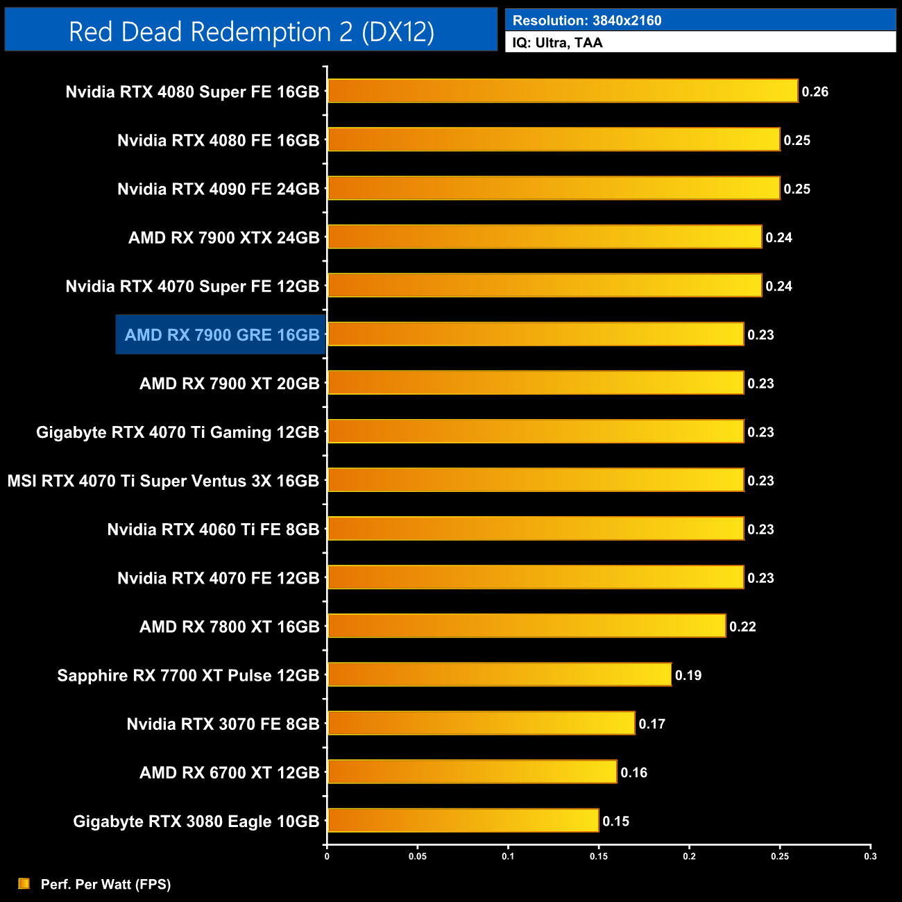 Lastly, at 4K we can see overall efficiency is still level with the RX 7900 XT and a hair ahead of the RX 7800 XT.
