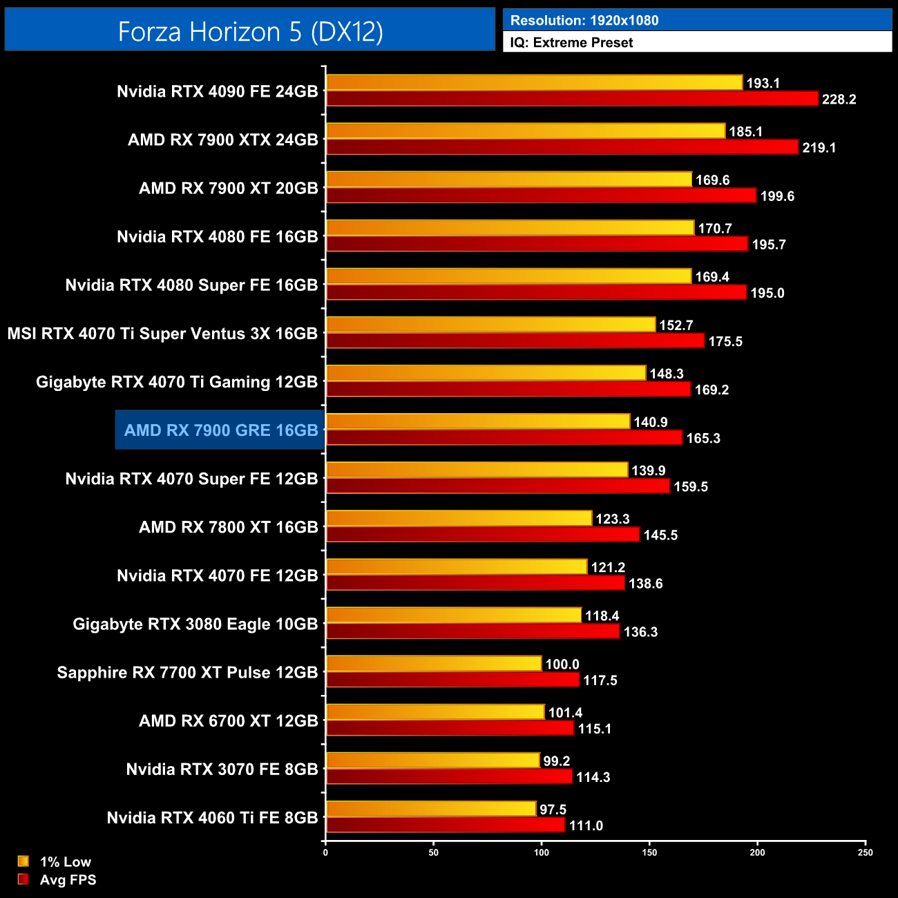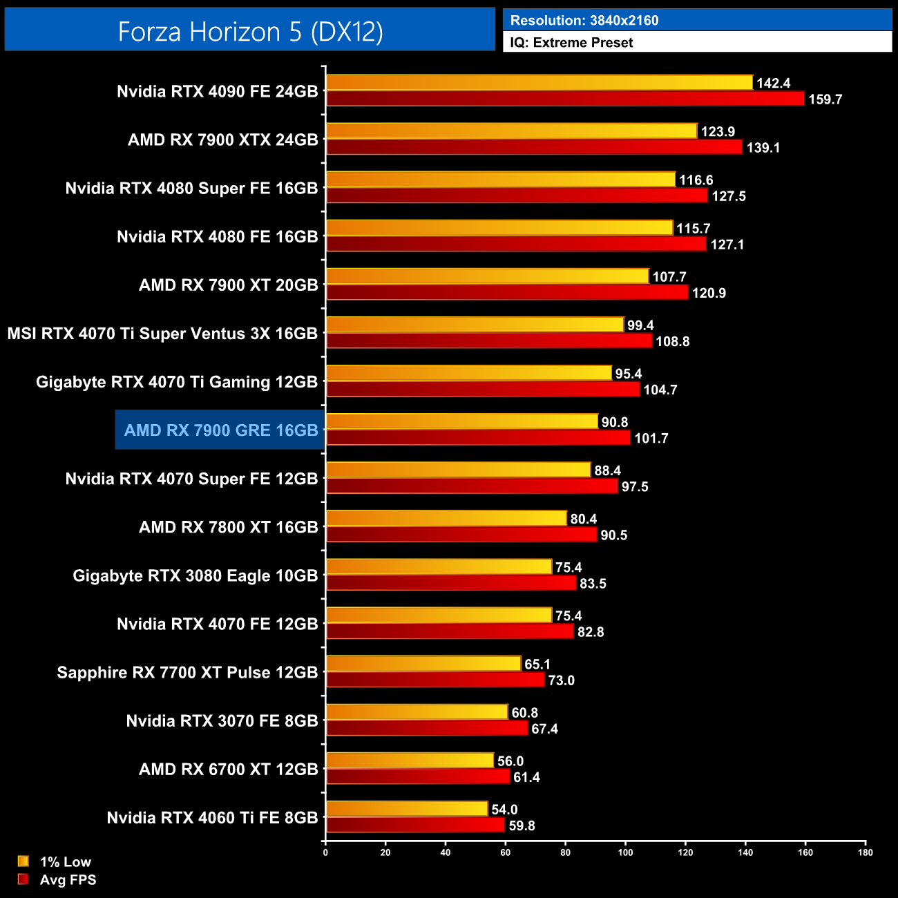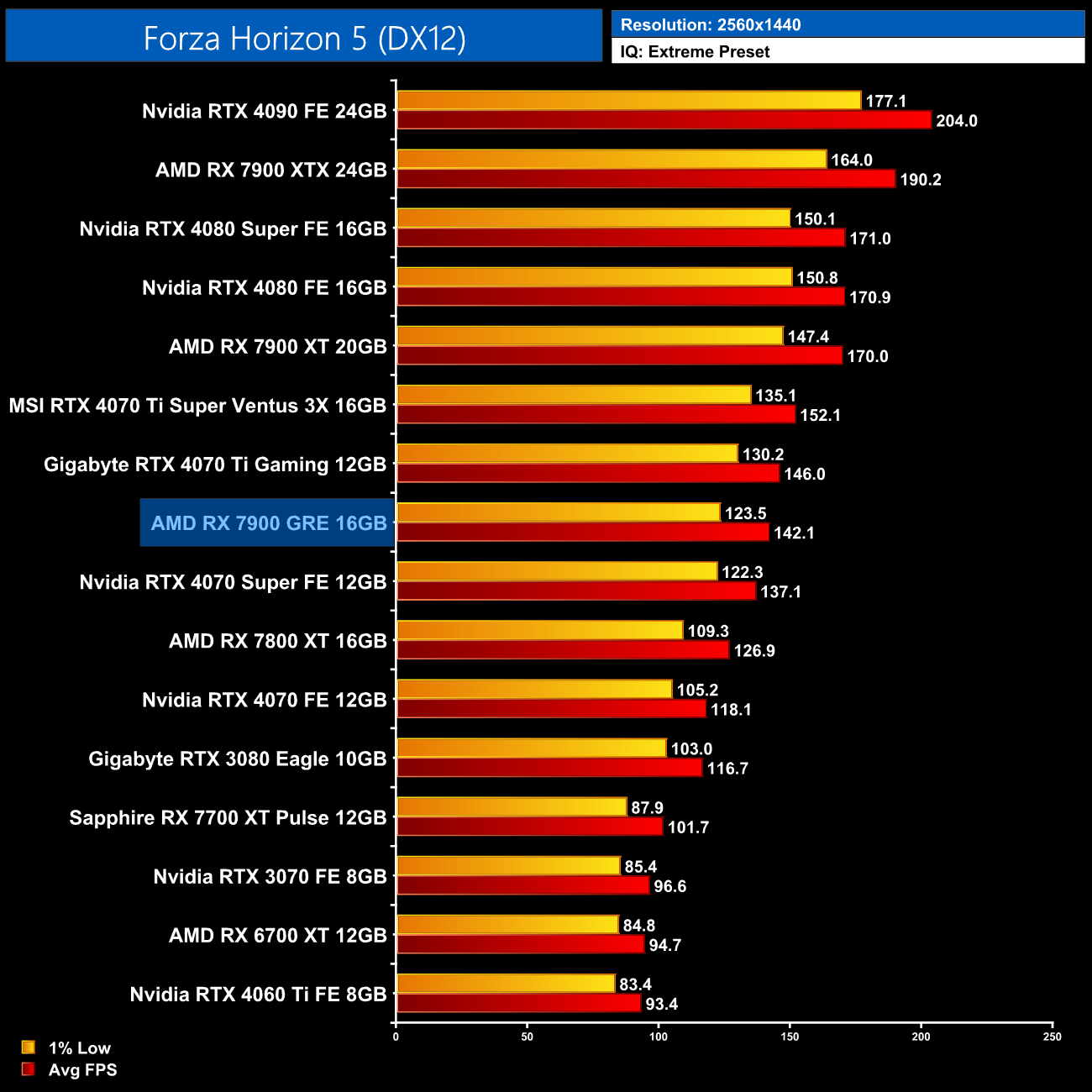Forza Horizon 5 is next and this one runs very well using the Extreme preset, and with the GRE delivering 142FPS on average at 1440p, it slots neatly between the 4070 Super and 4070 Ti, while it's 12% faster than the 7800 XT.