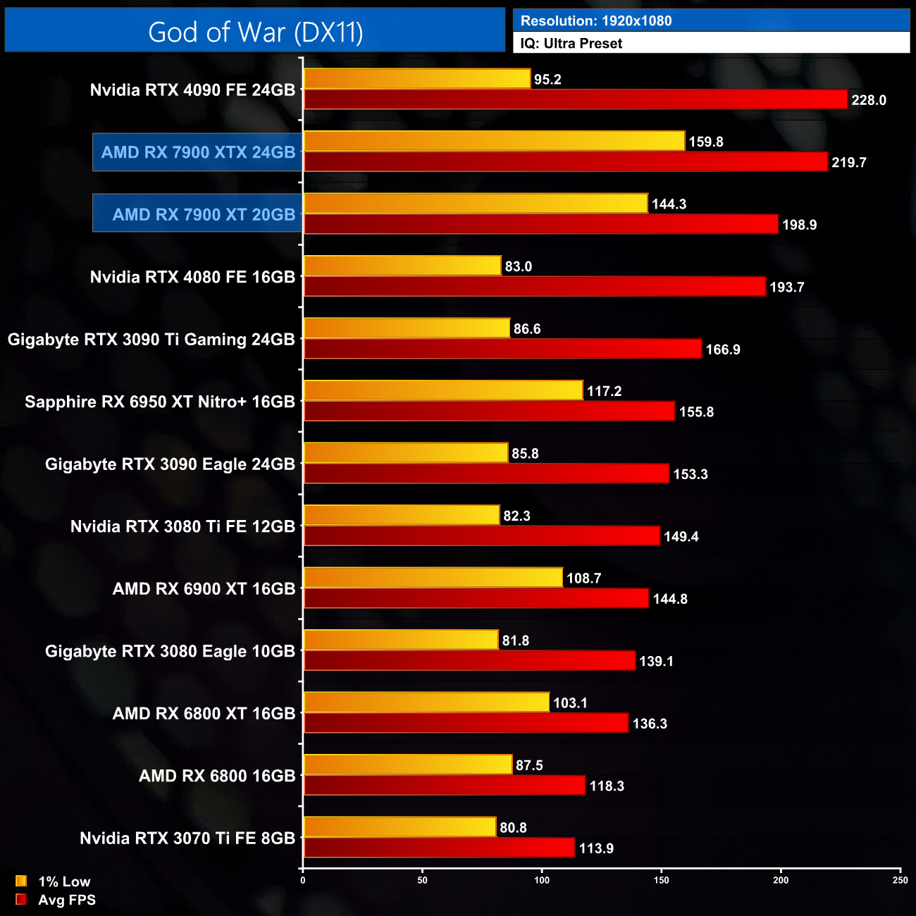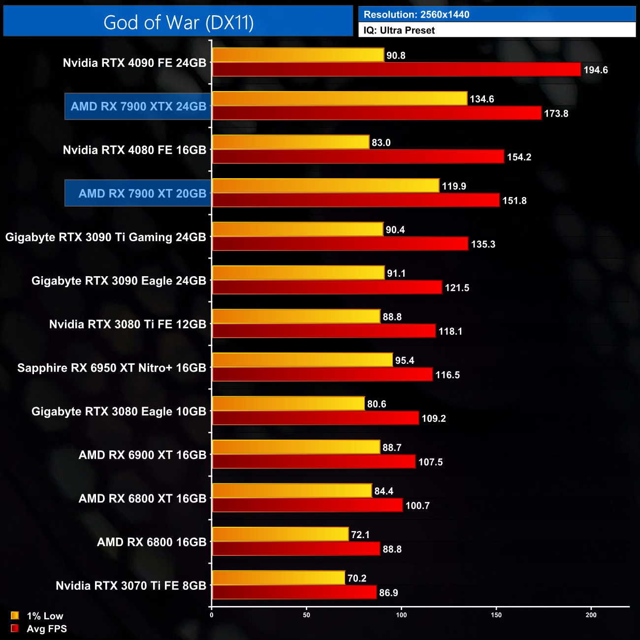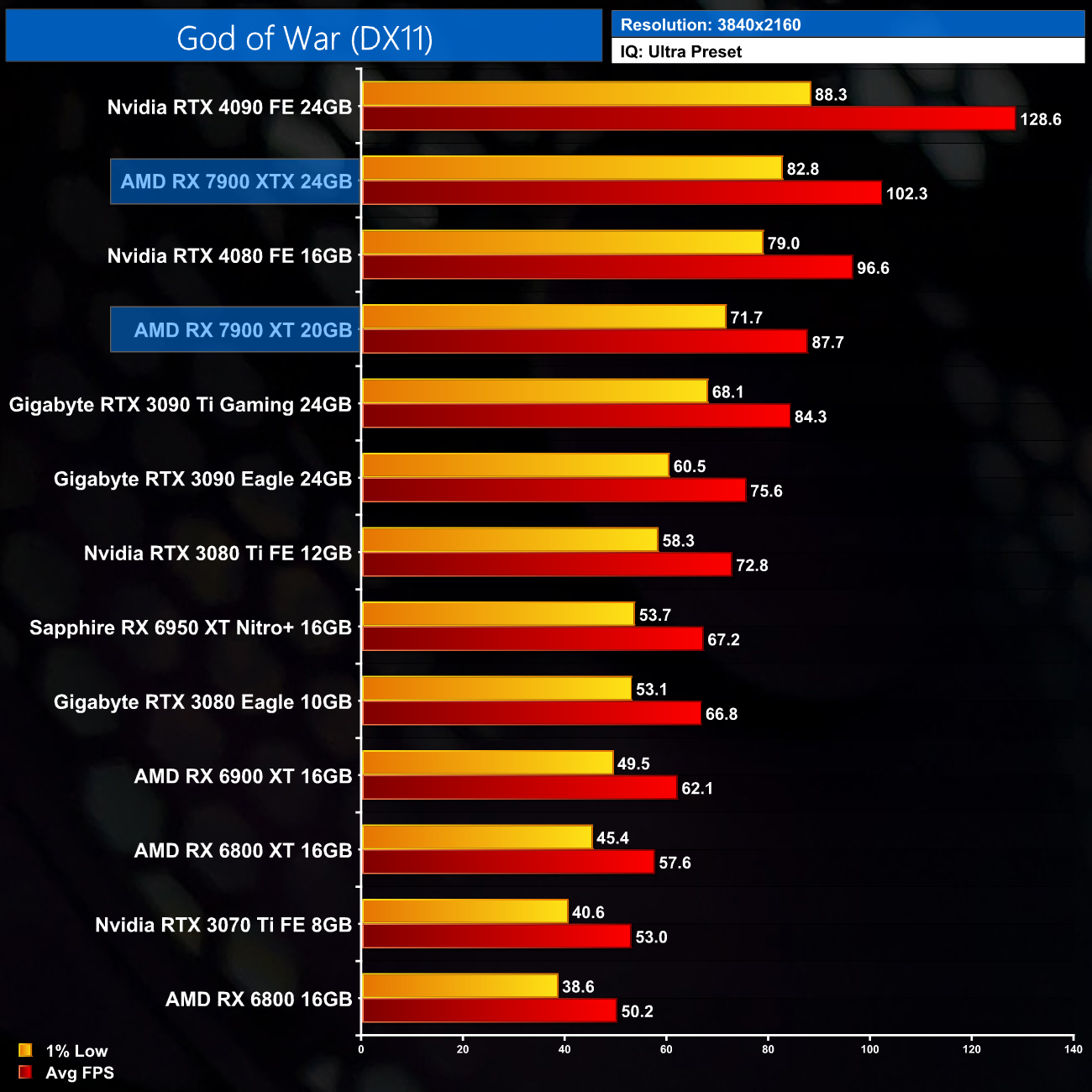Next is God of War, where the 7900 XT delivers over 150FPS at 1440p – it's basically a match for the RTX 4080, but with substantially better 1% lows.
