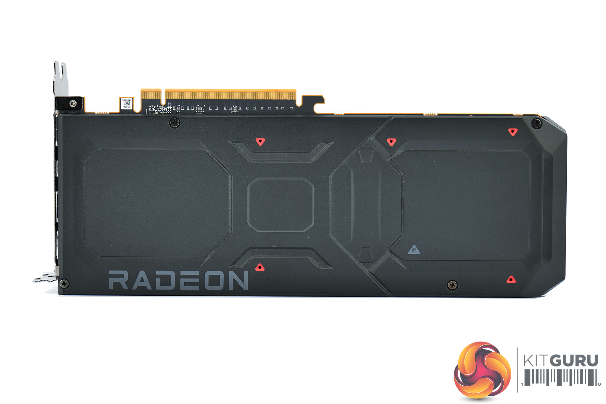 The front side of the card is left fairly bare, with the aluminium finstack occupying most of the space. A full-length metal backplate can be seen once the card is flipped over, with the Radeon branding printed in grey text towards the I/O bracket.
