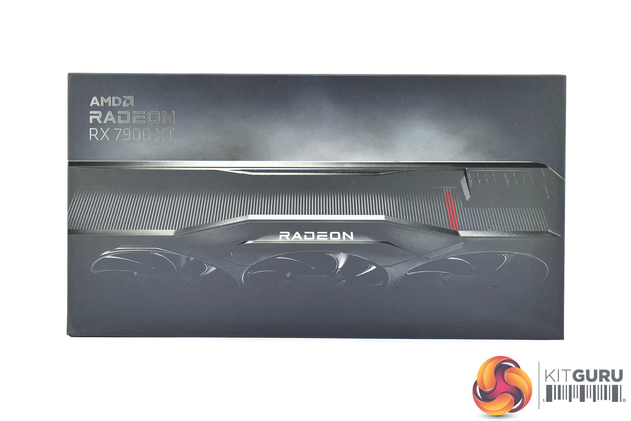 The AMD Radeon RX 7900 XT ships in a compact black box. A semi-obscured image of the graphics card is visible on the front, while AMD highlights the Adrenalin software on the back.