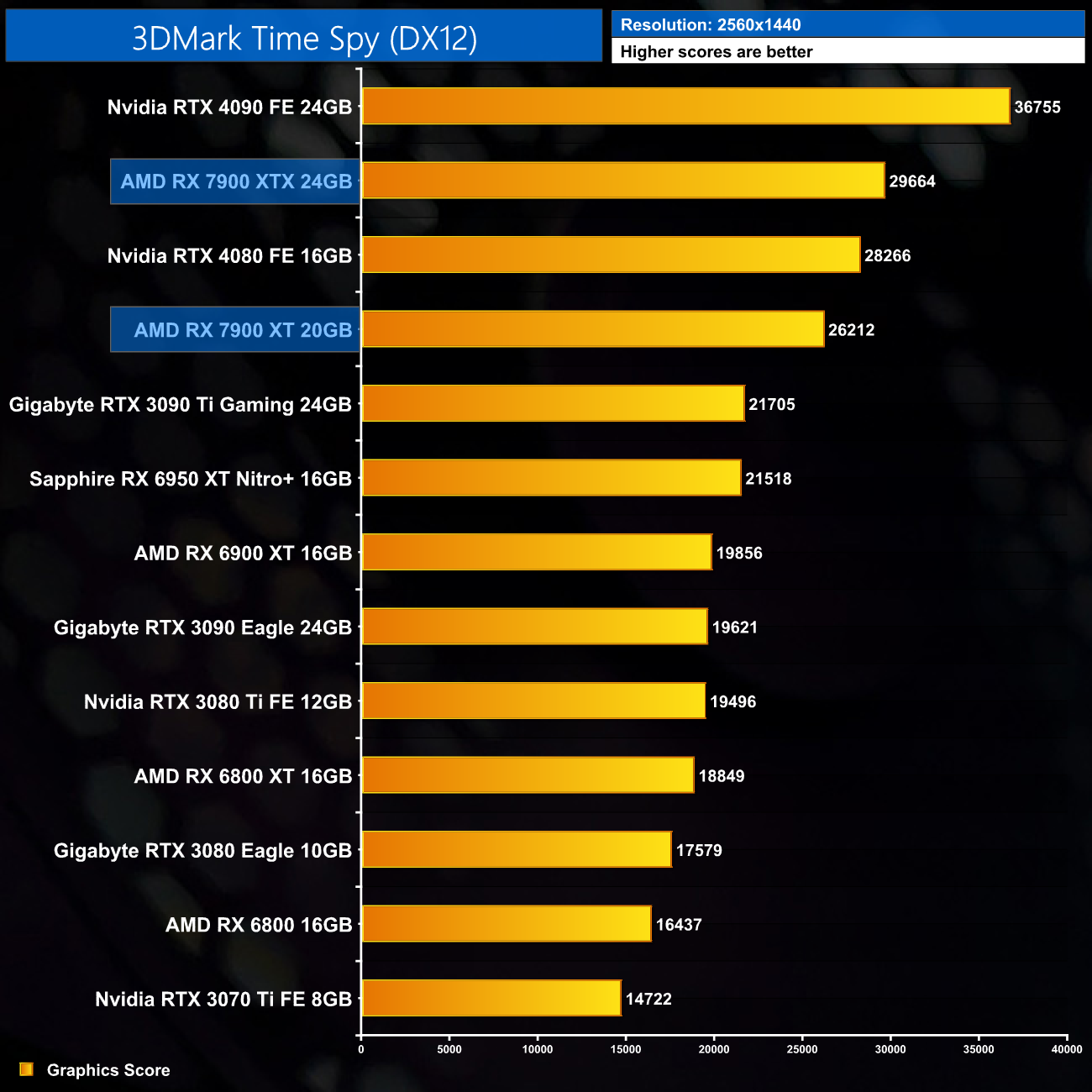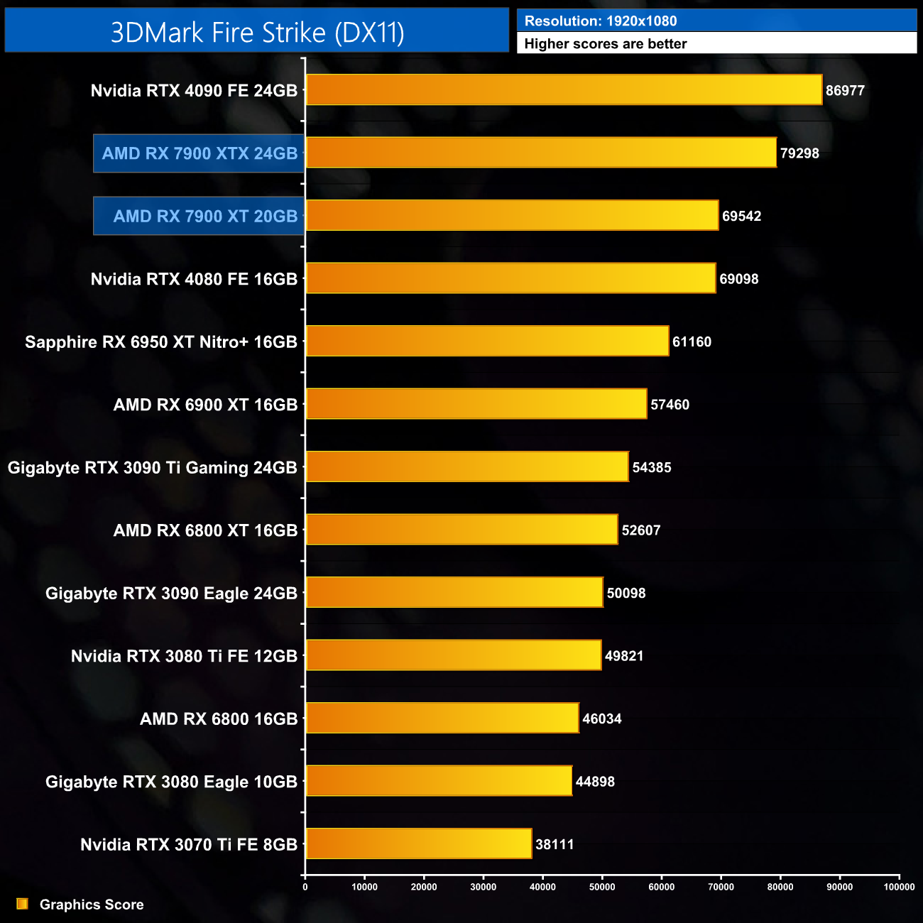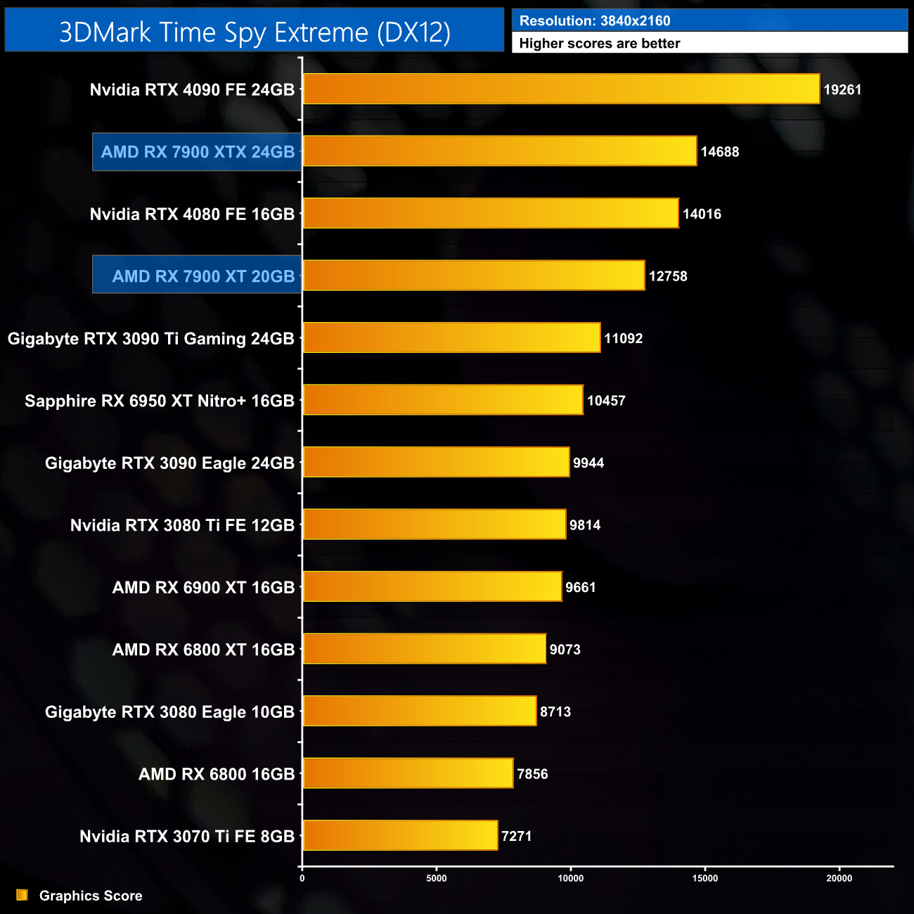 Initial impressions are positive for the RX 7900 XT. It's level with the RTX 4080 in 3DMark Fire Strike, and still outscores the RTX 3090 Ti handsomely in Time Spy.