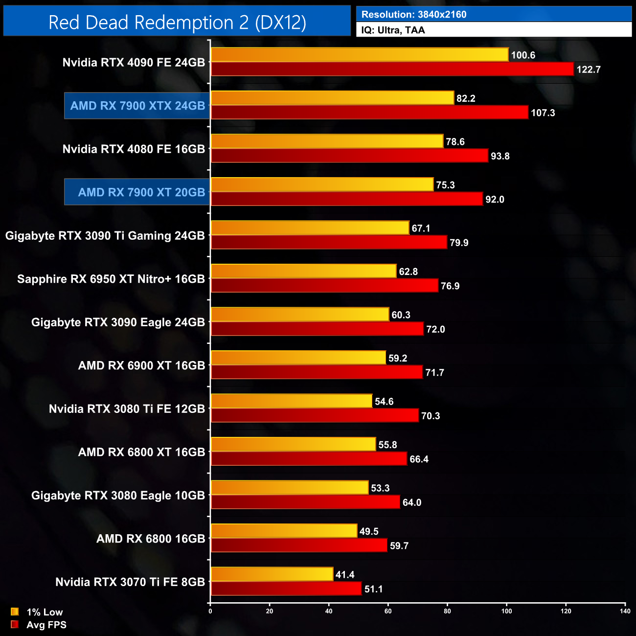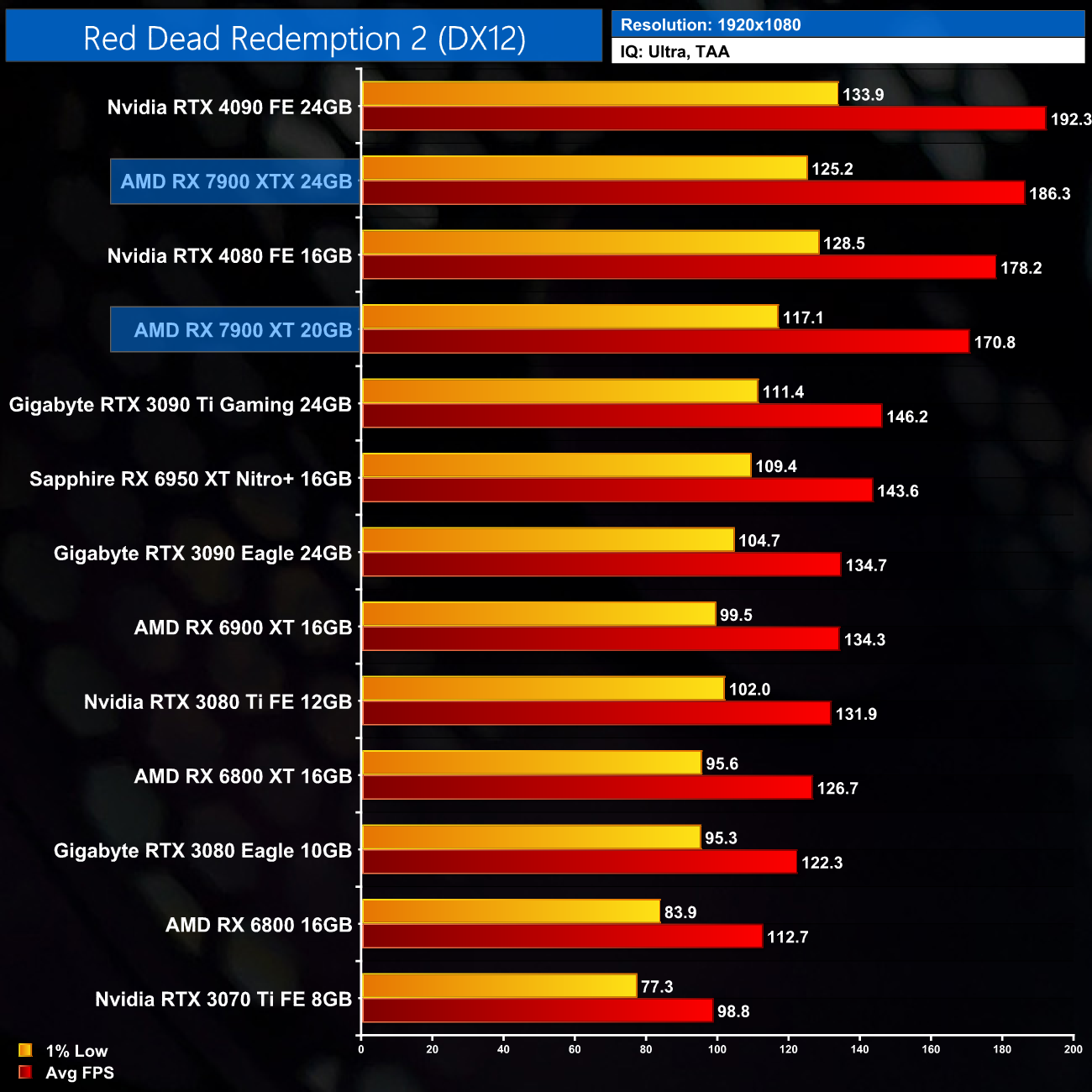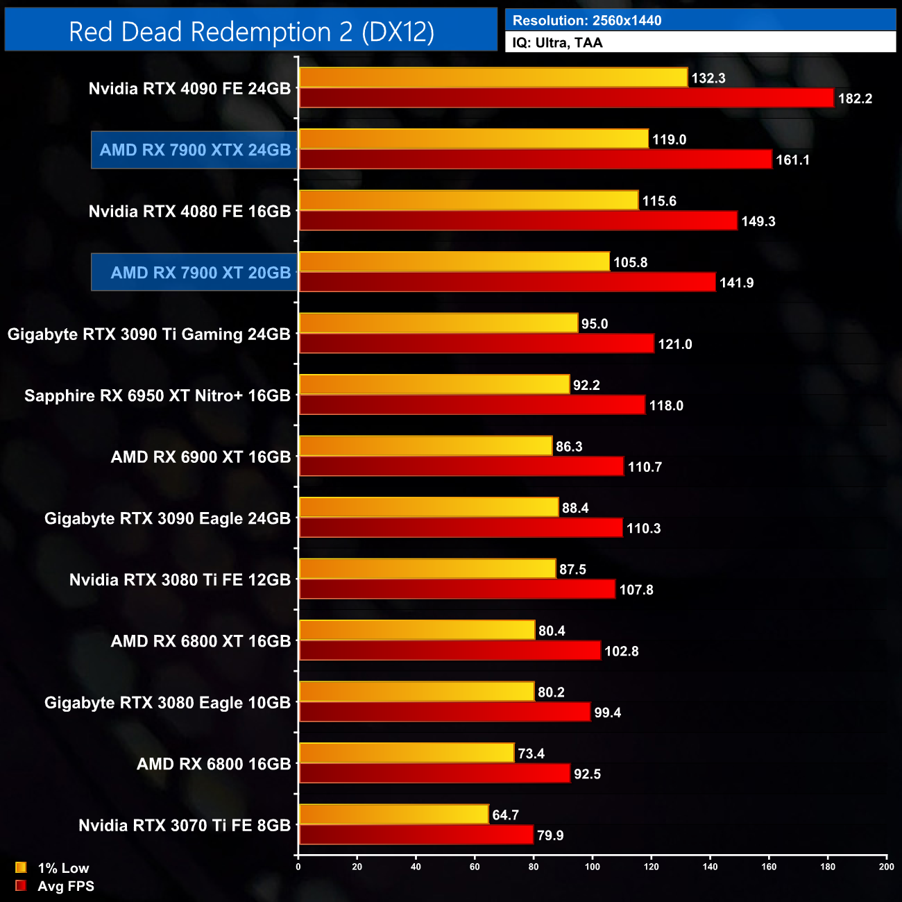 Red Dead Redemption 2 is another decent showing for RDNA 3 though, with the 7900 XTX averaging over 160FPS at 1440p, where it's 8% faster than the RTX 4080.