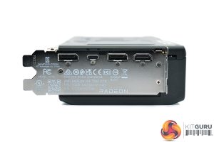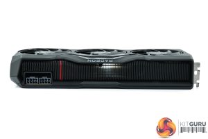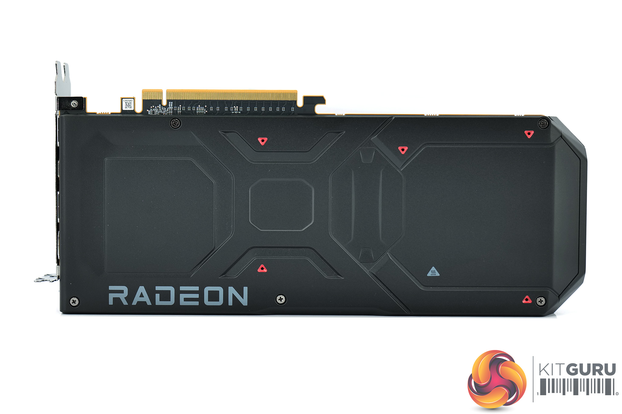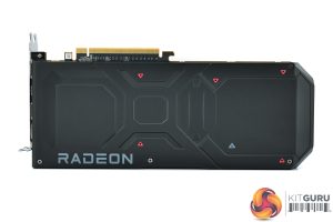 The front side of the card is left fairly bare, with the aluminium finstack occupying most of the space. A full-length metal backplate can be seen once the card is flipped over, with the Radeon branding printed in grey text towards the I/O bracket.