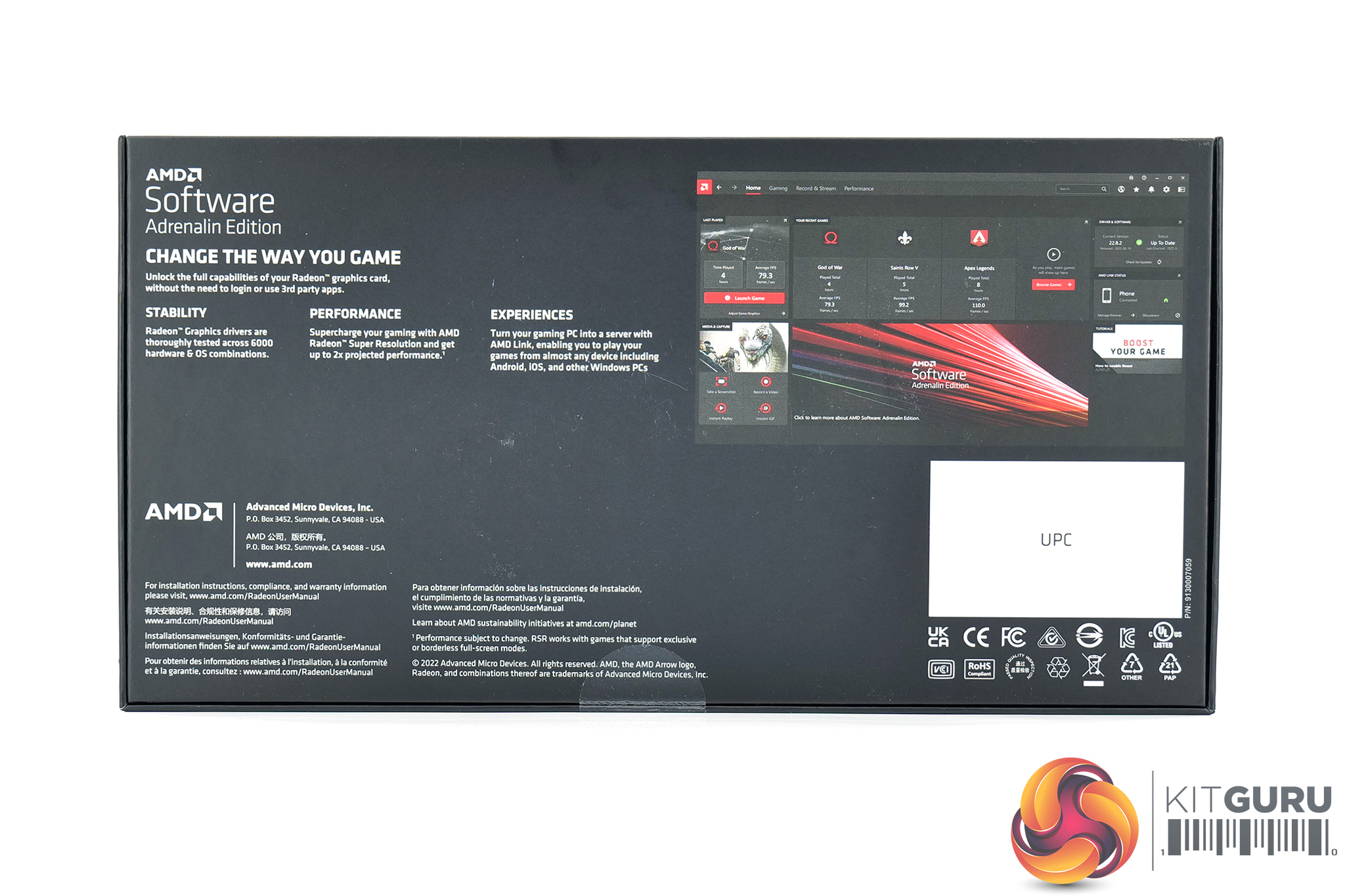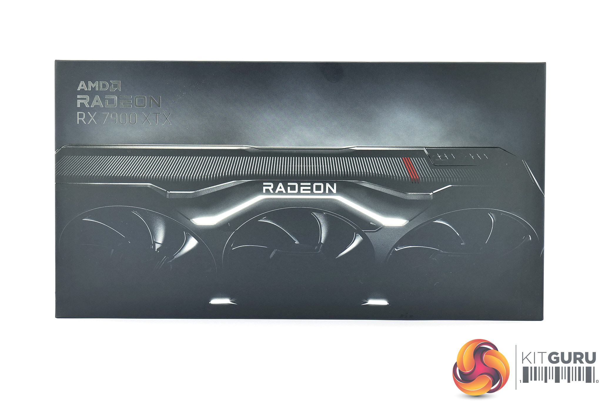 The AMD Radeon RX 7900 XTX ships in a compact black box. A semi-obscured image of the graphics card is visible on the front, while AMD highlights the Adrenalin software on the back.
