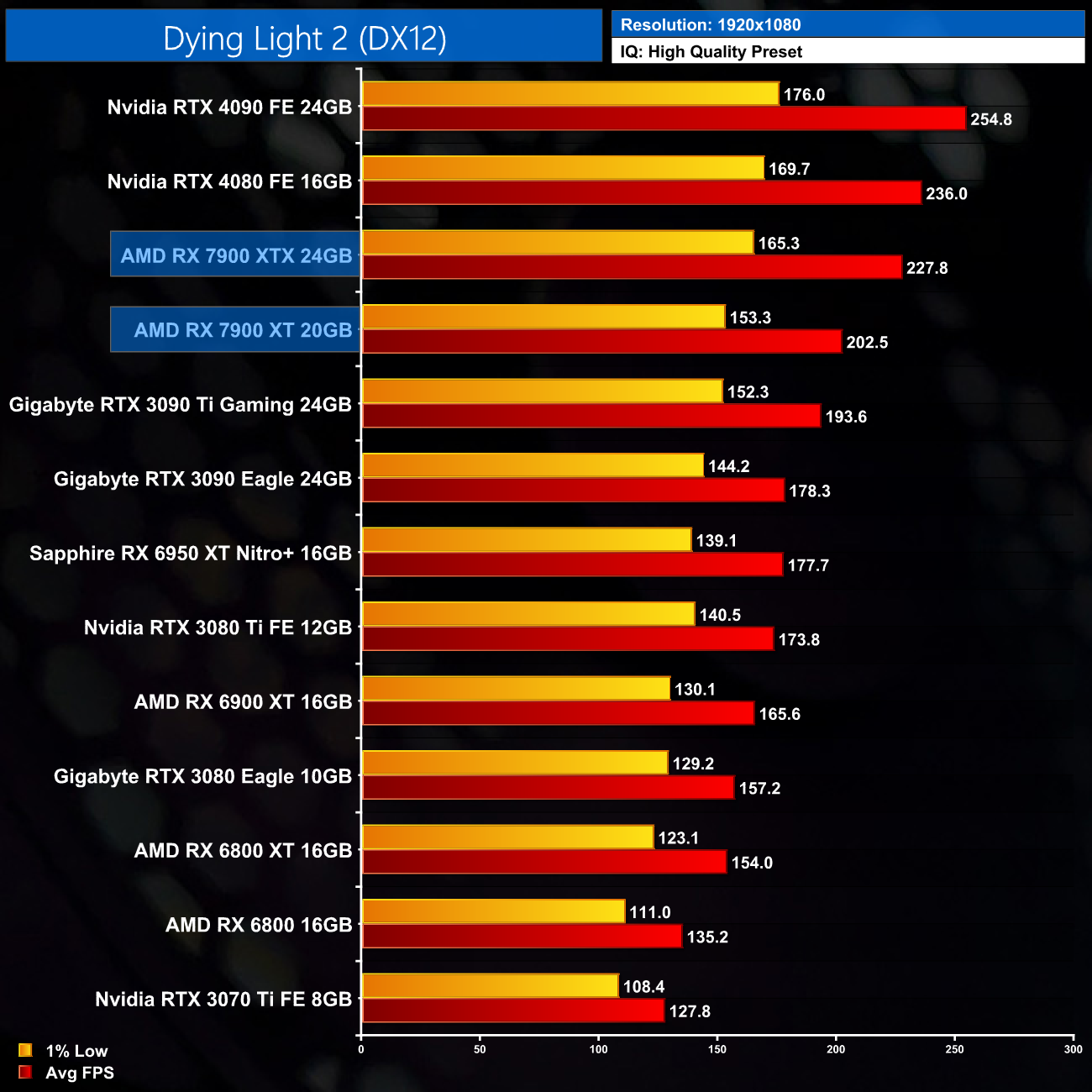 As for Dying Light 2, it's hard to argue with over 170FPS on average at 1440p, with the 7900 XTX neck-and neck with the RTX 4080.