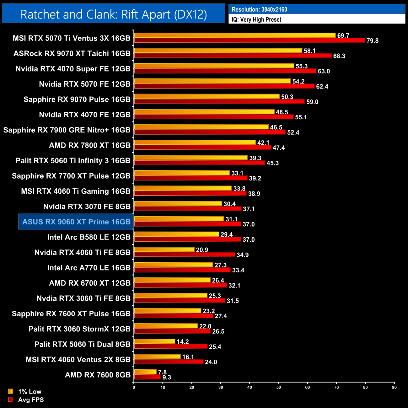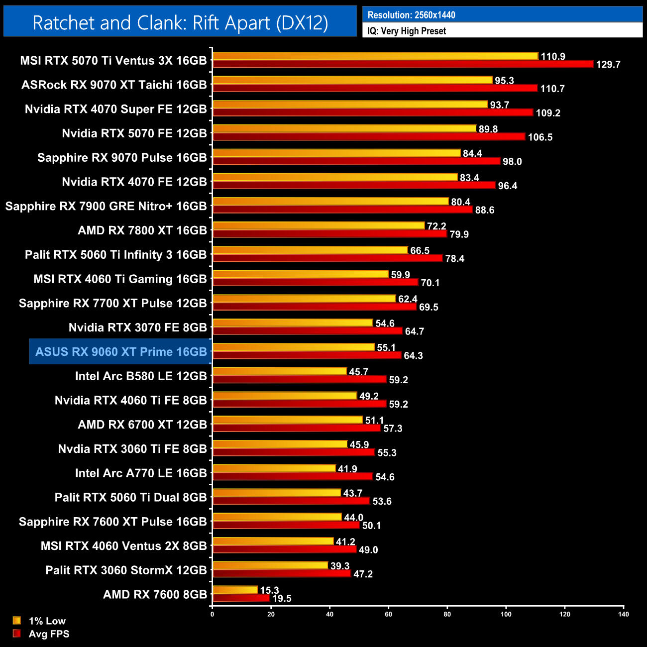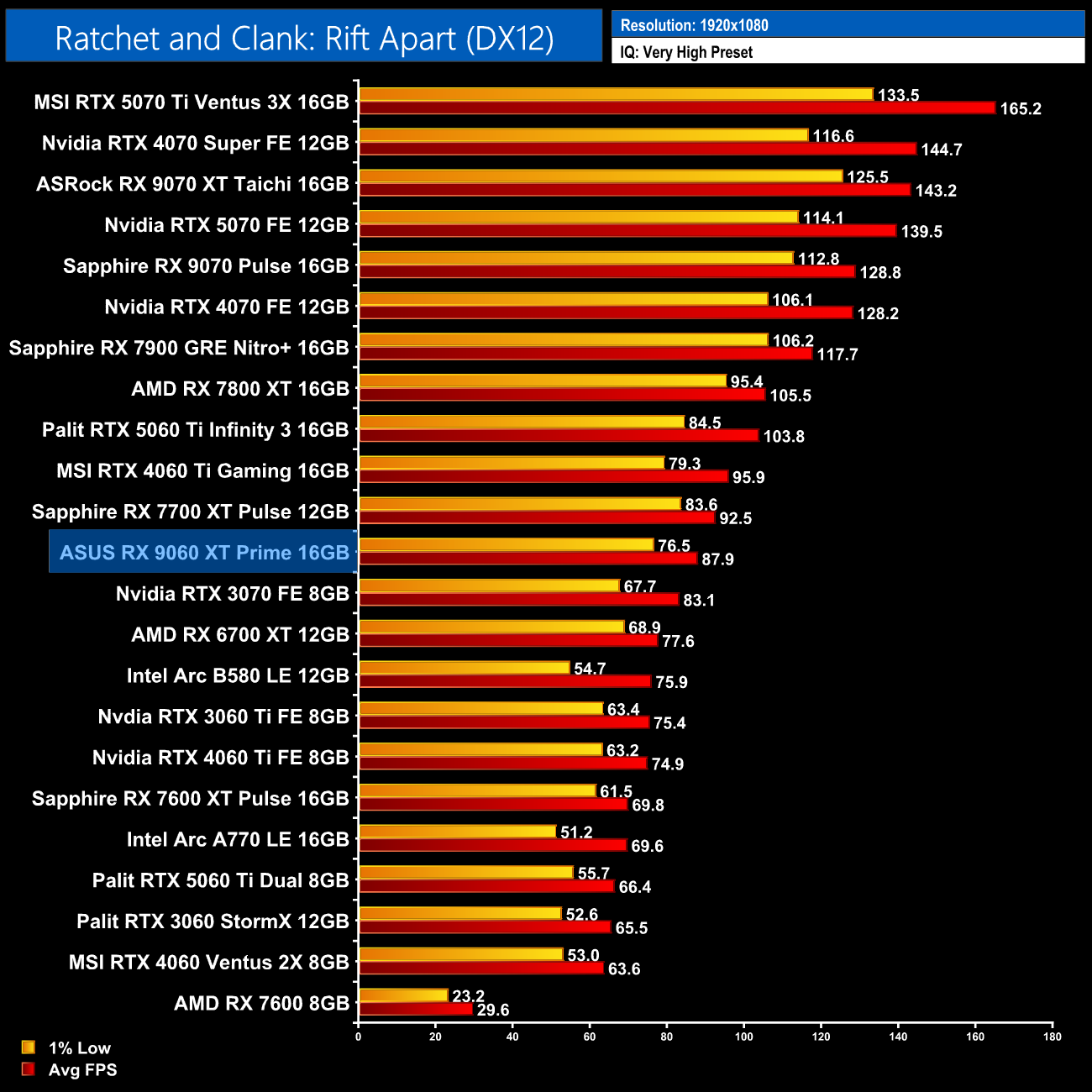 Ratchet and Clank is another game where AMD GPUs do struggle, this time showing the 9060 XT 16GB lagging behind the 5060 Ti 16GB by 15%. However, it's also a game where there's benefit to more than 8GB of VRAM, even at 1080p without ray tracing, given the AMD GPU is no less than 32% faster than the 5060 Ti 8GB.