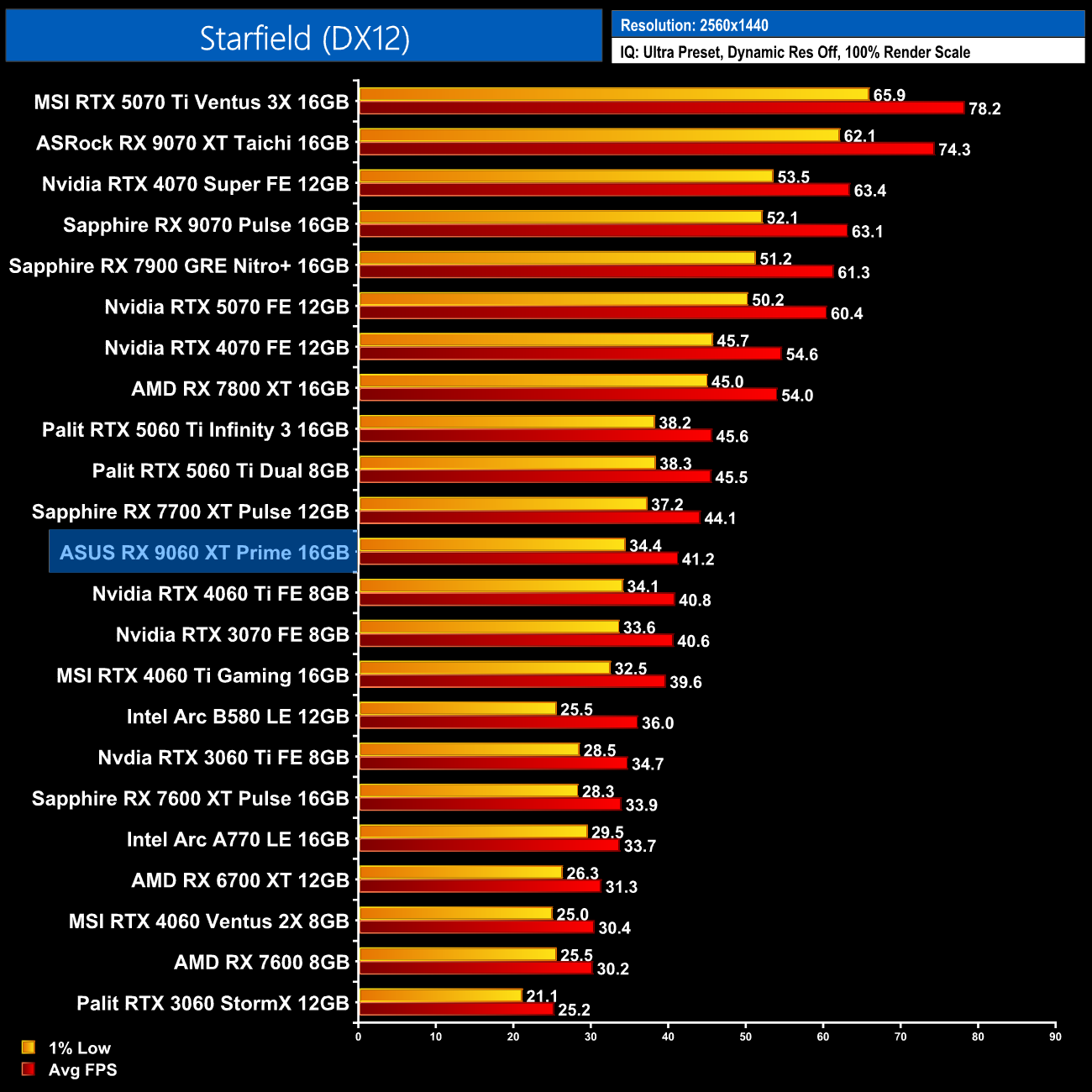 Lastly, we close up with Starfield, a game that used to favour AMD hardware but several updates and possibly driver tweaks have changed that behaviour. Still, 50fps at 1080p isn't bad, though it's a touch behind the 7700 XT and 9% slower than the 5060 Ti 16GB.