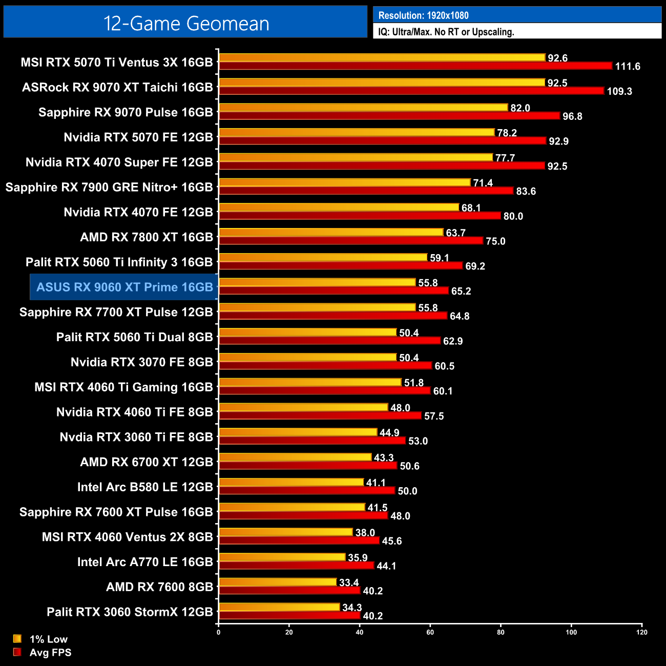 Overall then, at 1080p our 12-game geomean data shows the RX 9060 XT 16GB to be dead level with the RX 7700 XT, 4% faster than the 5060 Ti 8GB, but then 6% slower than the RTX 5060 Ti 16GB – although that's pretty good considering the difference in MSRP.