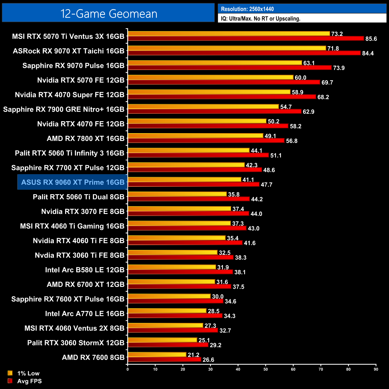 At 1440p the 9060 XT 16GB scales just slightly worse compared to the 5060 Ti 16GB, we saw it come in 7% slower on average, but four of the twelve games show it behind by more than a 10% margin.
