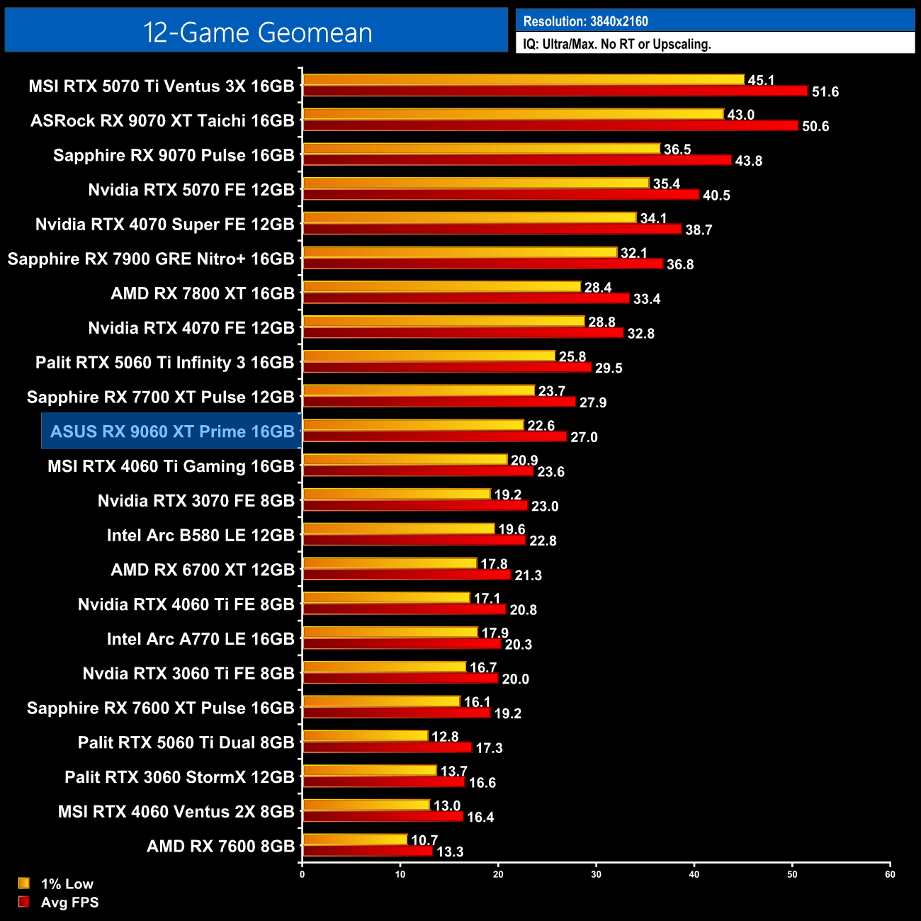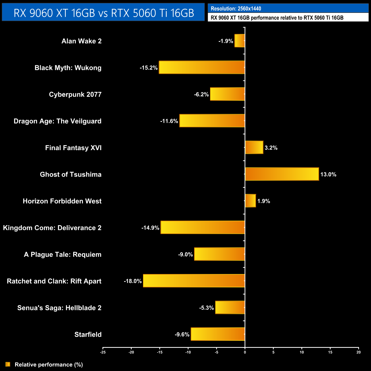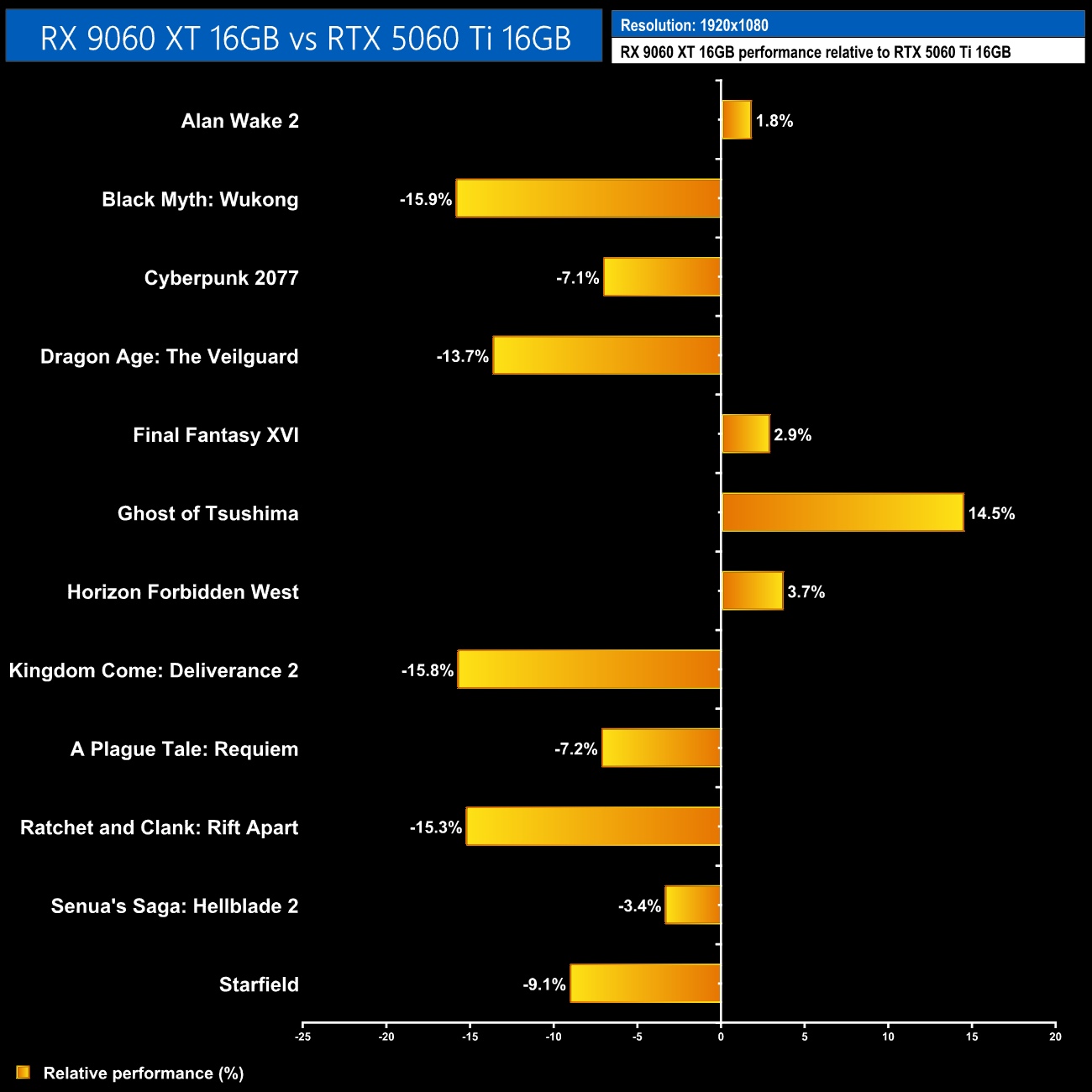 To look into the comparison versus the 5060 Ti 16GB a little closer, the 9060 XT 16GB proved slower in eight of the twelve games tested. While it was faster in the other four, three of those four showed differences of less than 5%, with Ghost of Tsushima being the only game where the AMD GPU was noticeably faster.