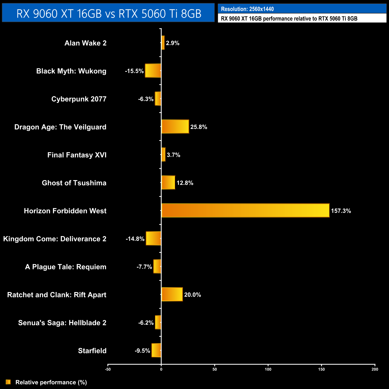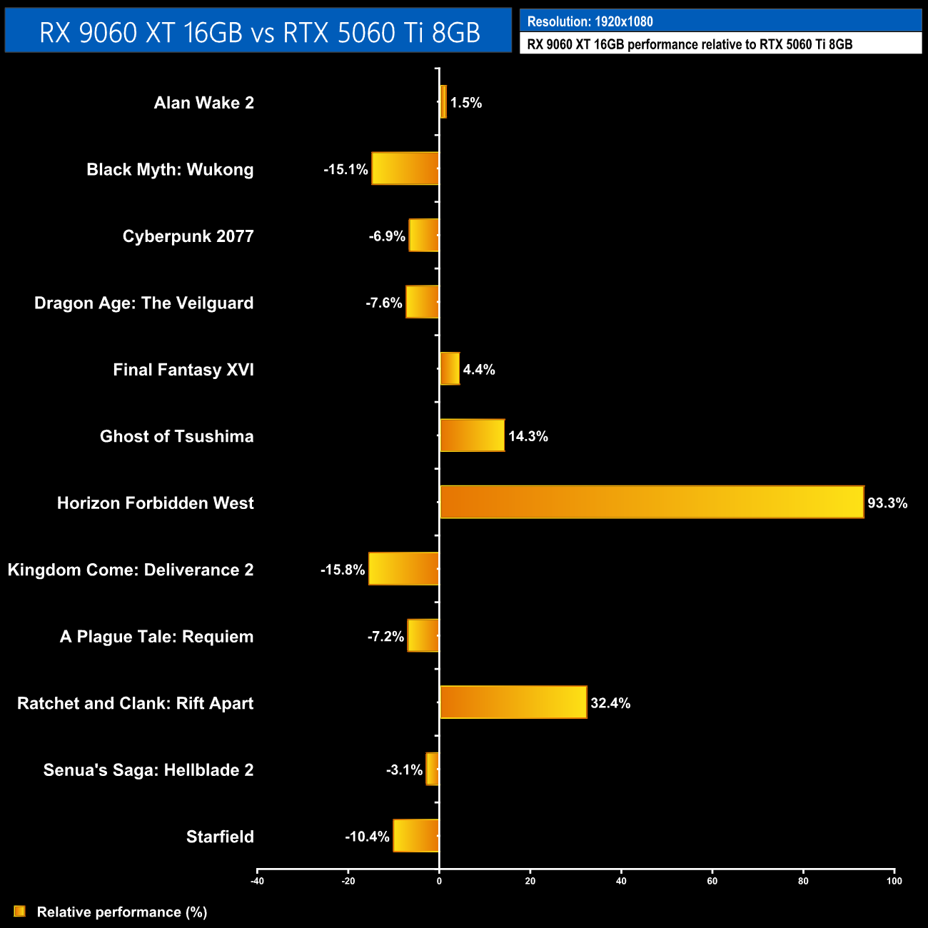 The comparison versus the 5060 Ti 8GB is a different story however – some games still perform the same, but there's a couple of clear examples where – even at 1080p! – an 8GB VRAM buffer just does not cut it anymore, resulting in huge wins for the 9060 XT 16GB.