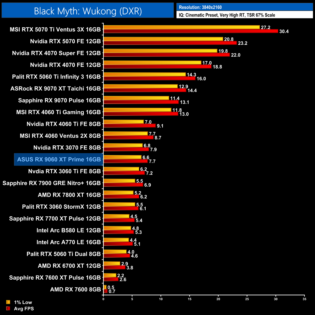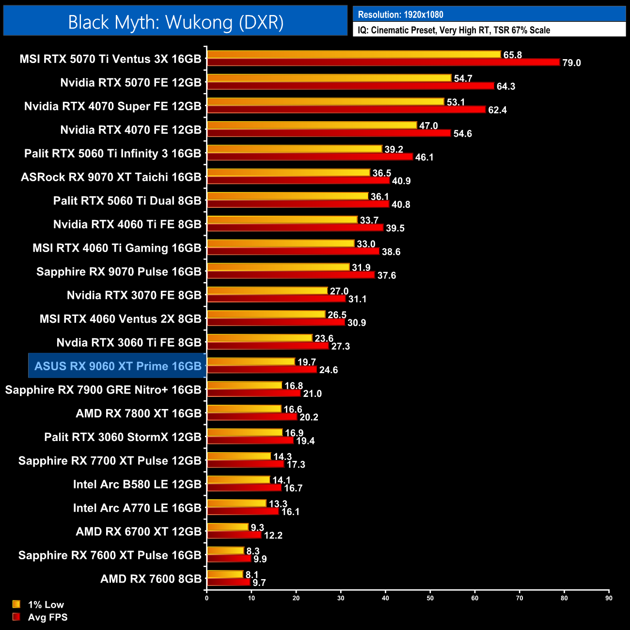 The same goes for Black Myth: Wukong, another highly demanding title when using path tracing. Even at 1080p with Quality upscaling, performance just isn't playable on this sort of GPU – you'd need an RX 9070 as the bare minimum.