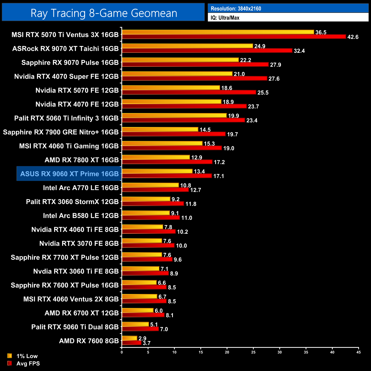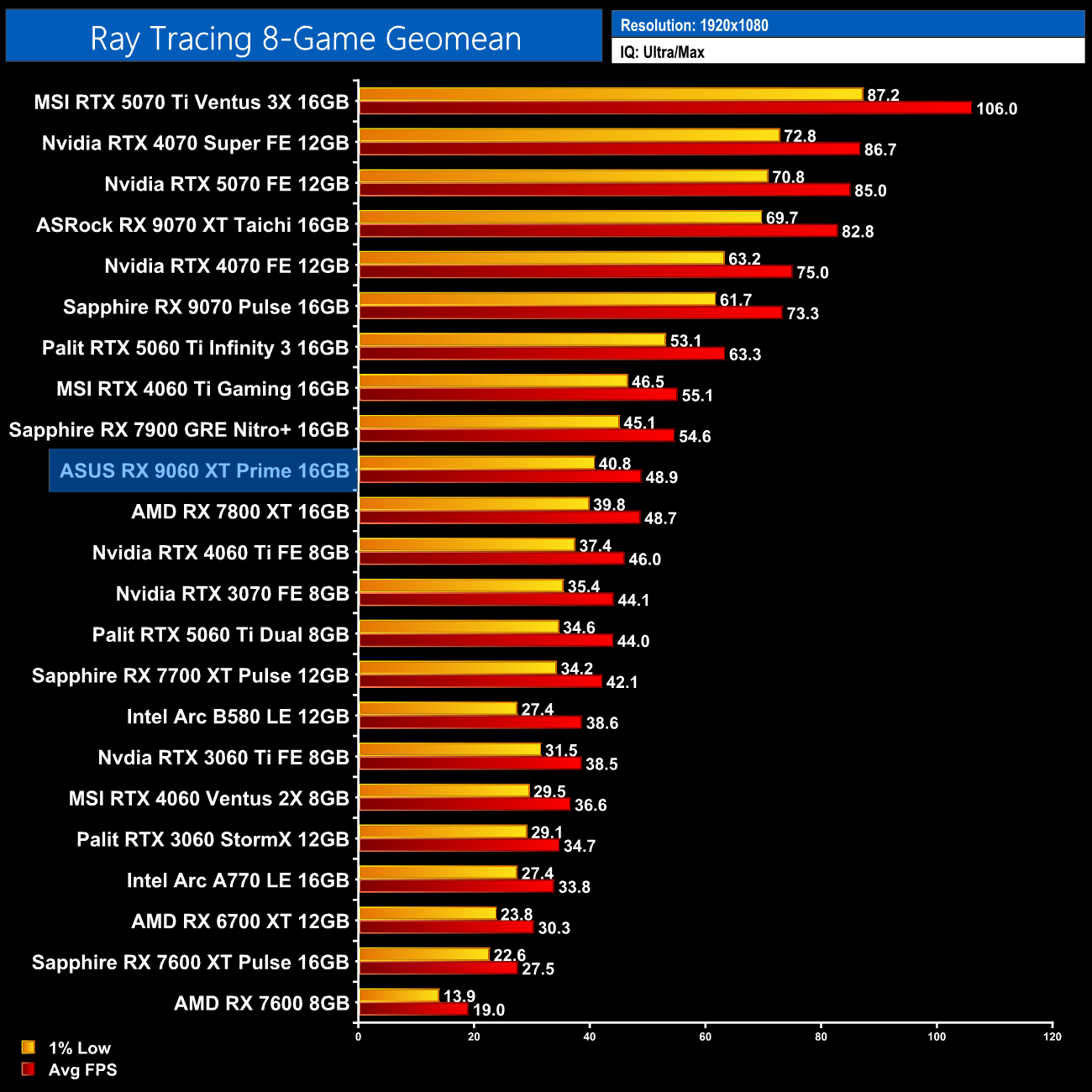 However, there's no getting away from the fact that Nvidia still has the upper hand in this area. Compared to the 5060 Ti 16GB, the 9060 XT 16GB is some 23% slower, though it does still average a higher frame rate than the 5060 Ti 8GB model due to its superior VRAM capacity.