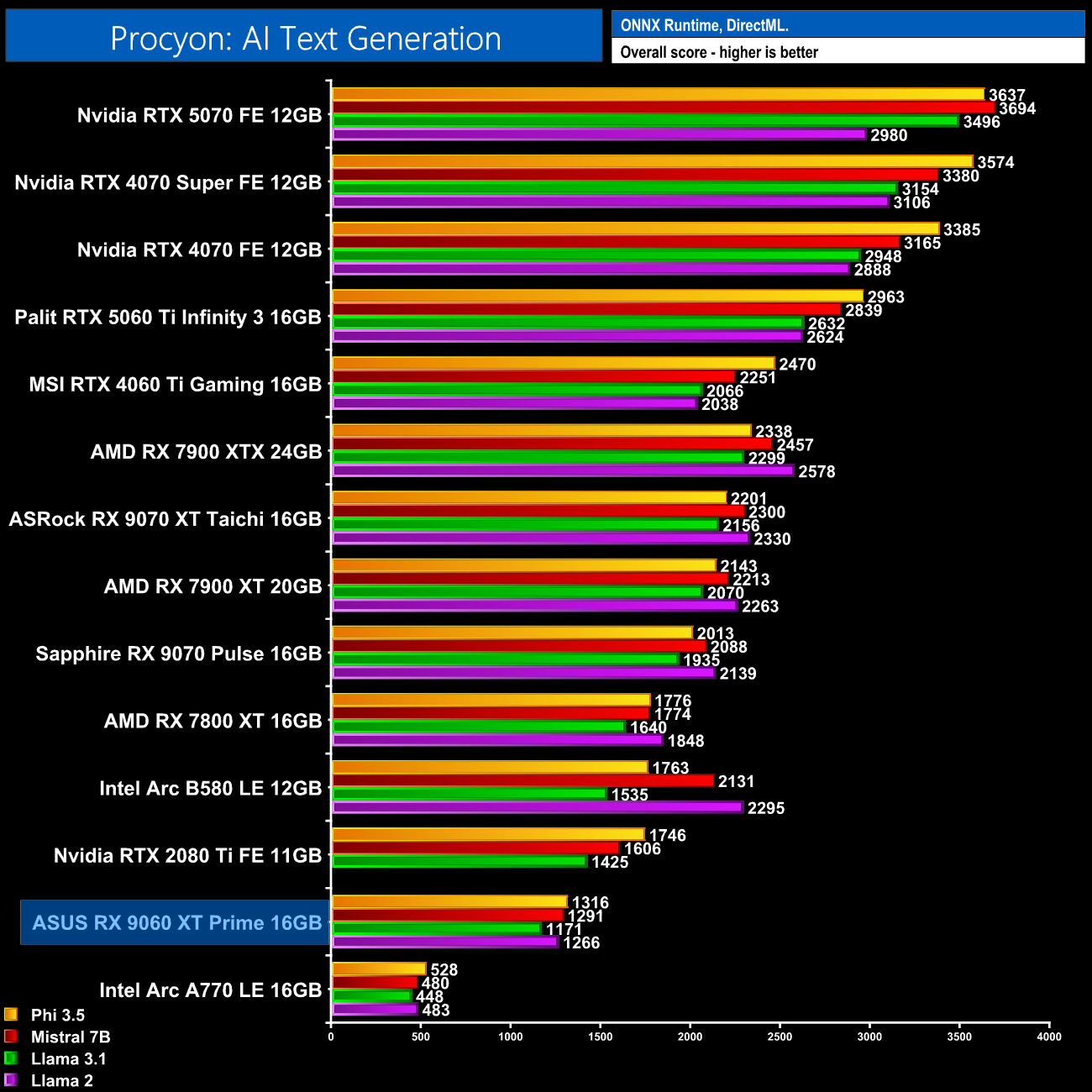 AI text generation is towards the bottom of the chart however, only beating the Arc A770 and slower than the B580 across all four models tested.