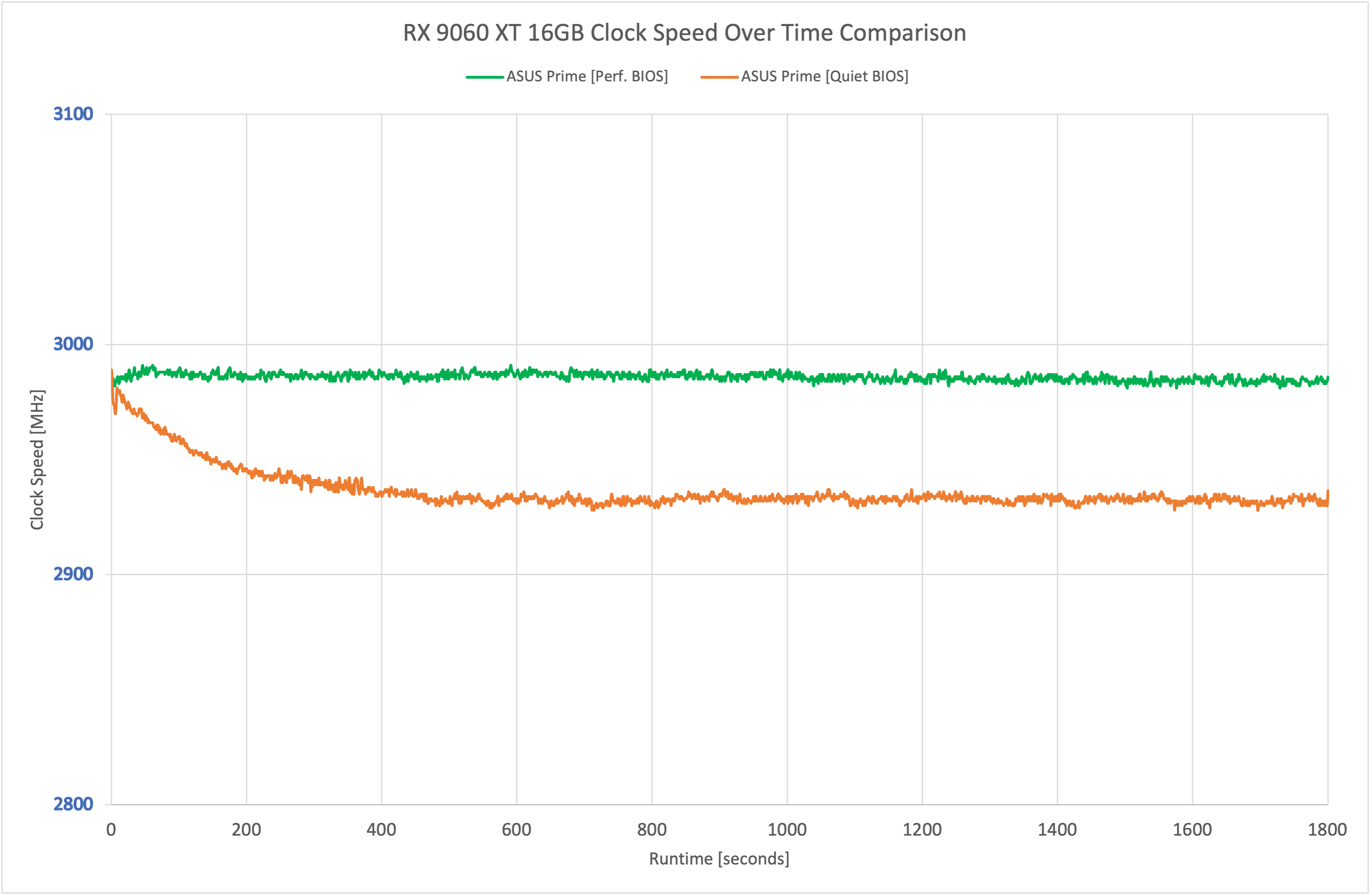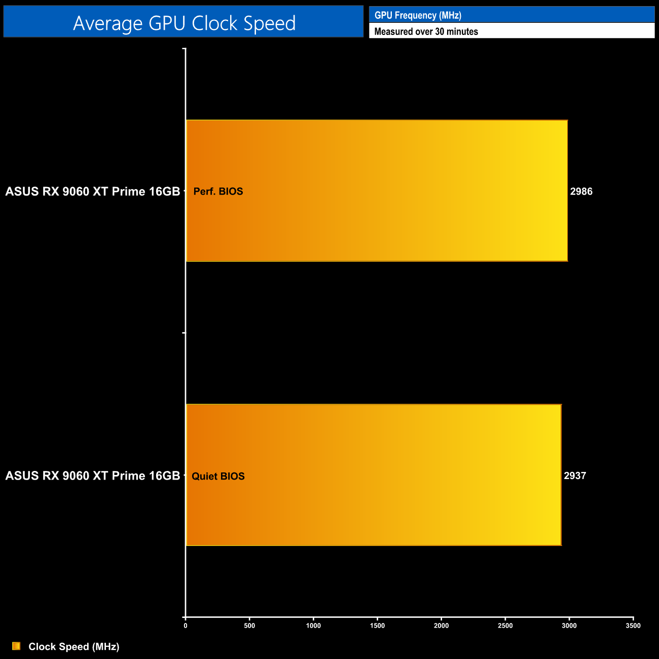 Averaged over the thirty minute stress test, it hit 2986MHz, compared to 2937MHz for the Quiet BIOS.