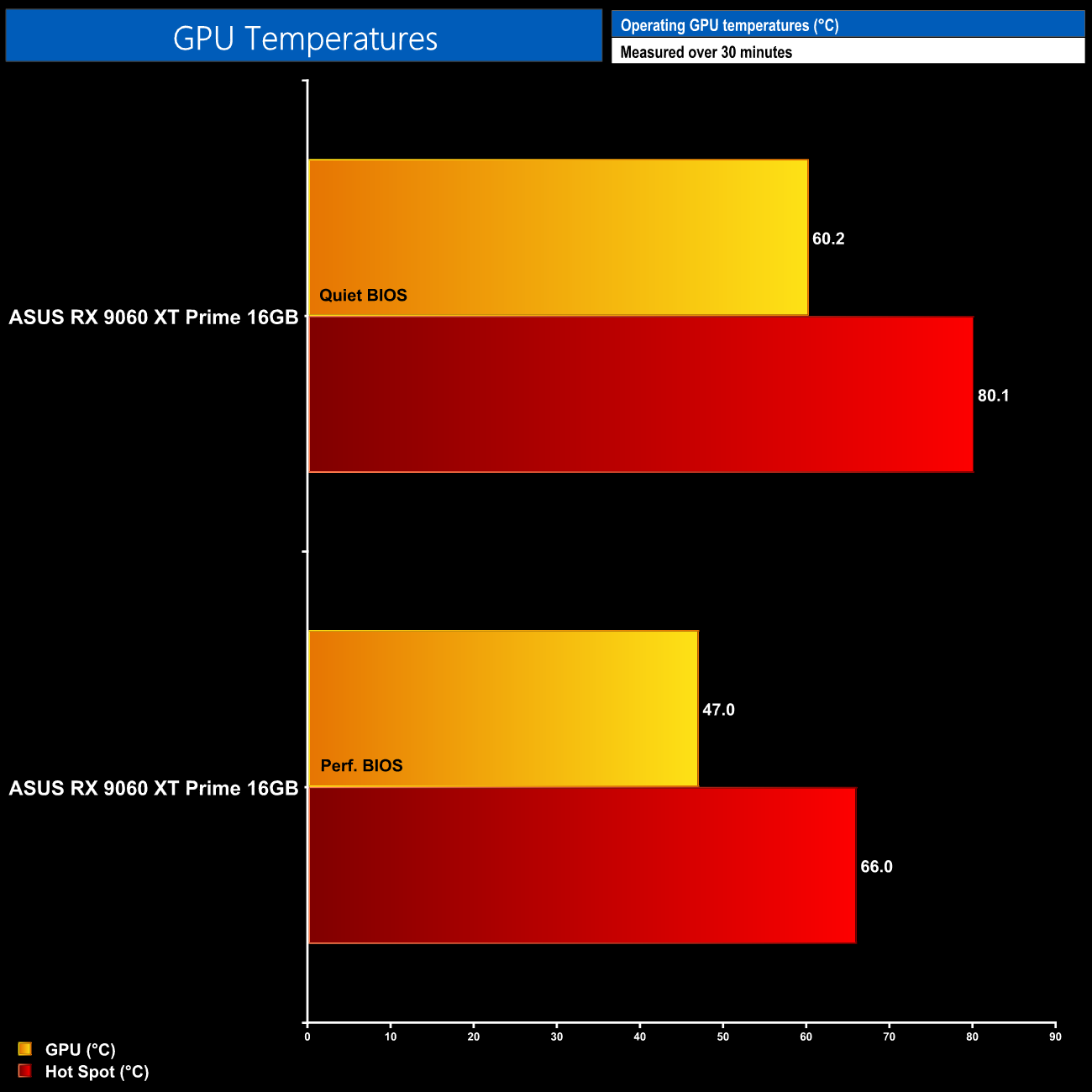 The Performance BIOS has a clear advantage for thermal performance, too, given the GPU hit just 47C in my testing, with the hot spot at 66C. The Quiet BIOS runs warmer, but is still well within safe limits given the hot spot hit 80.1C.