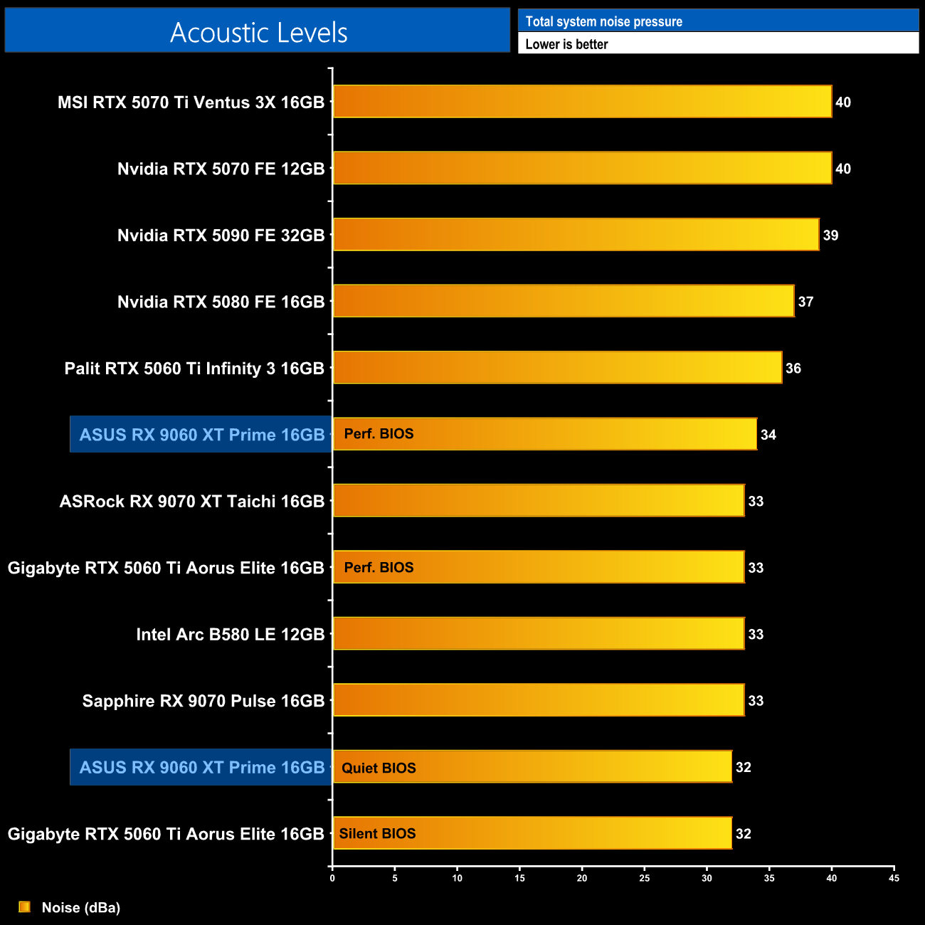 We take our noise measurements with the sound meter positioned 1 foot from the graphics card. I measured the noise floor to be 32 dBA, thus anything above this level can be attributed to the graphics cards. The power supply is passive for the entire power output range we tested all graphics cards in, while all CPU and system fans were disabled. A reading under load comes from running A Plague Tale: Requiem for 30 minutes.
