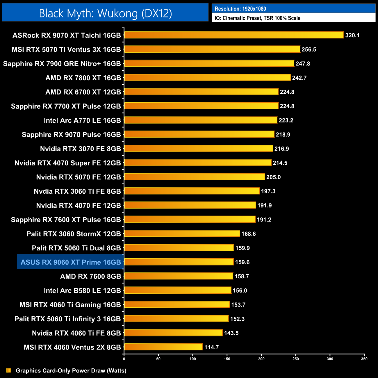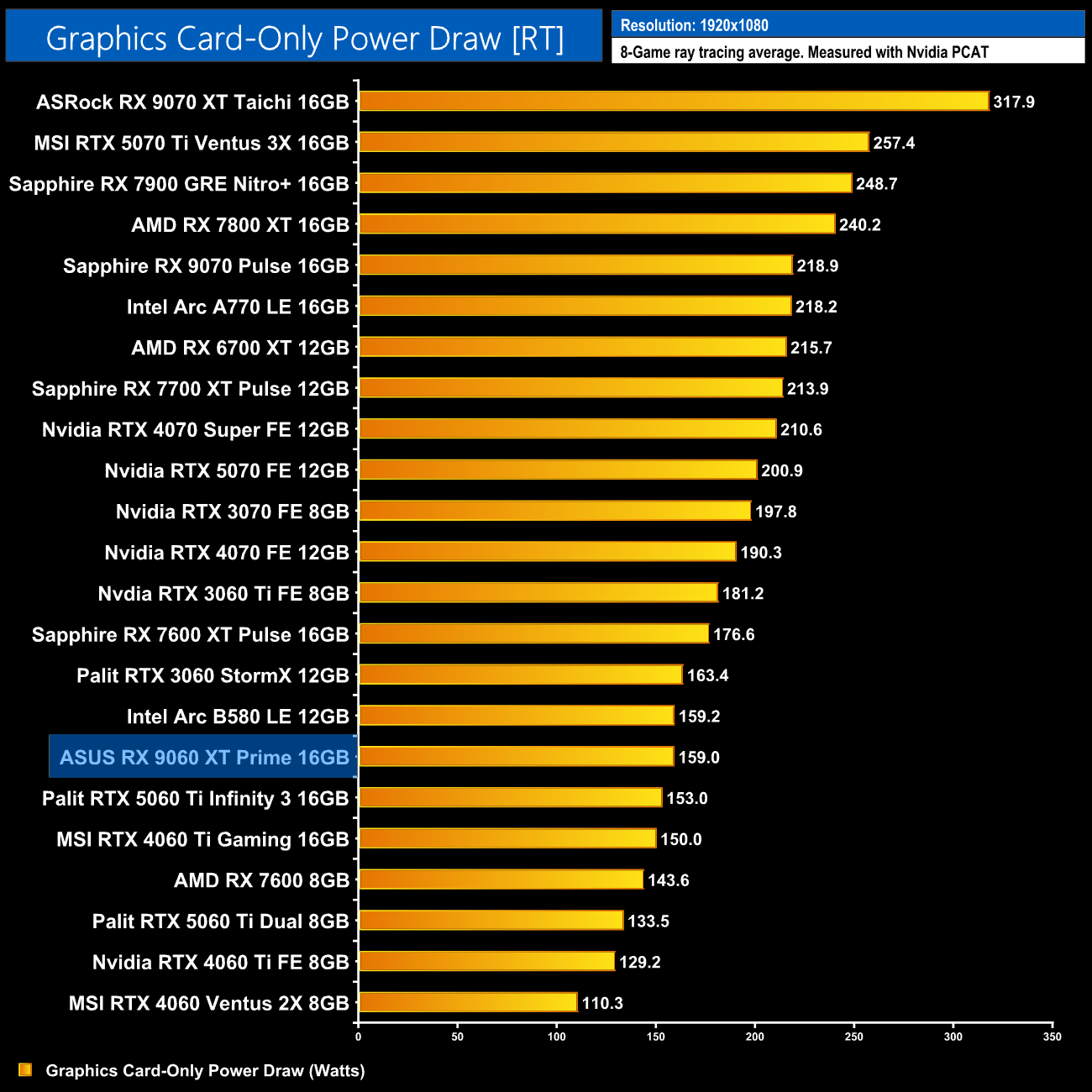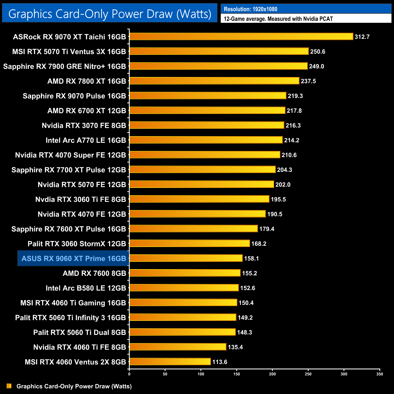 Power draw of our ASUS Prime came in right in-line with AMD's claimed 160W TBP. Over the twelve games tested at 1080p, it averaged 158.1W, so it's actually more frugal than the RX 7600 XT, despite being much faster.