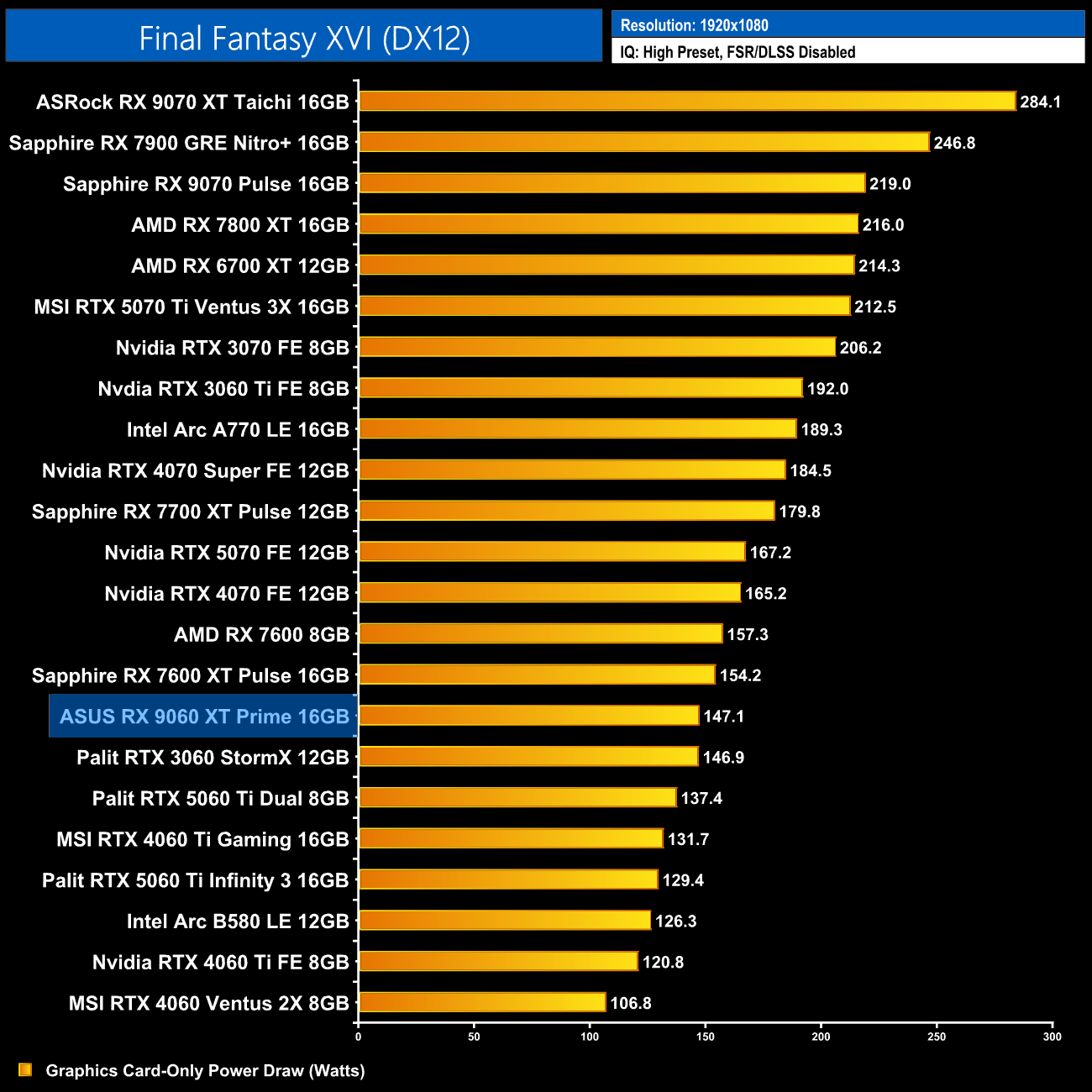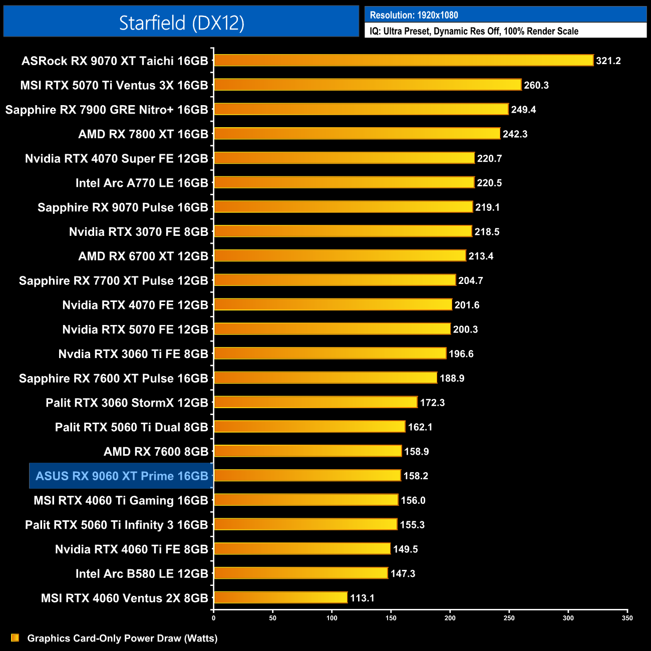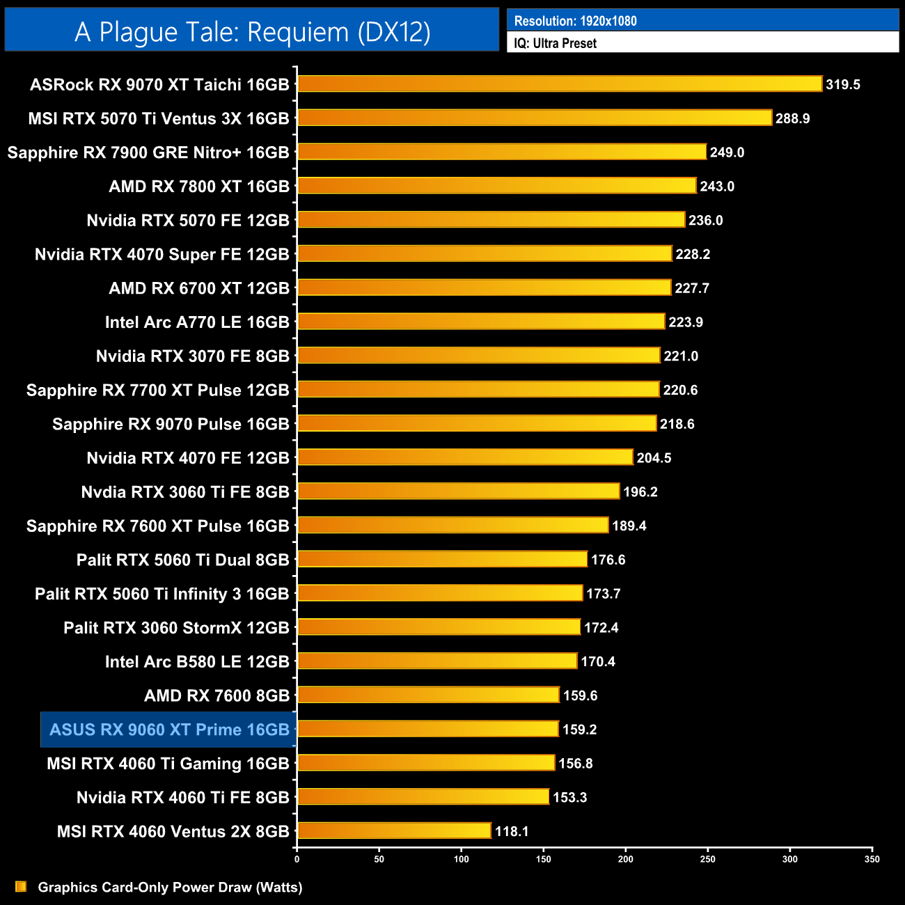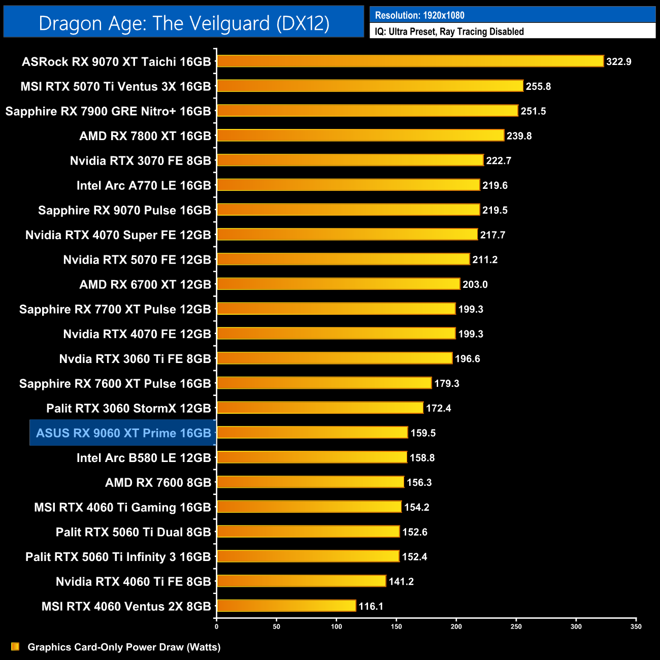 Power draw of our ASUS Prime came in right in-line with AMD's claimed 160W TBP. Over the twelve games tested at 1080p, it averaged 158.1W, so it's actually more frugal than the RX 7600 XT, despite being much faster.