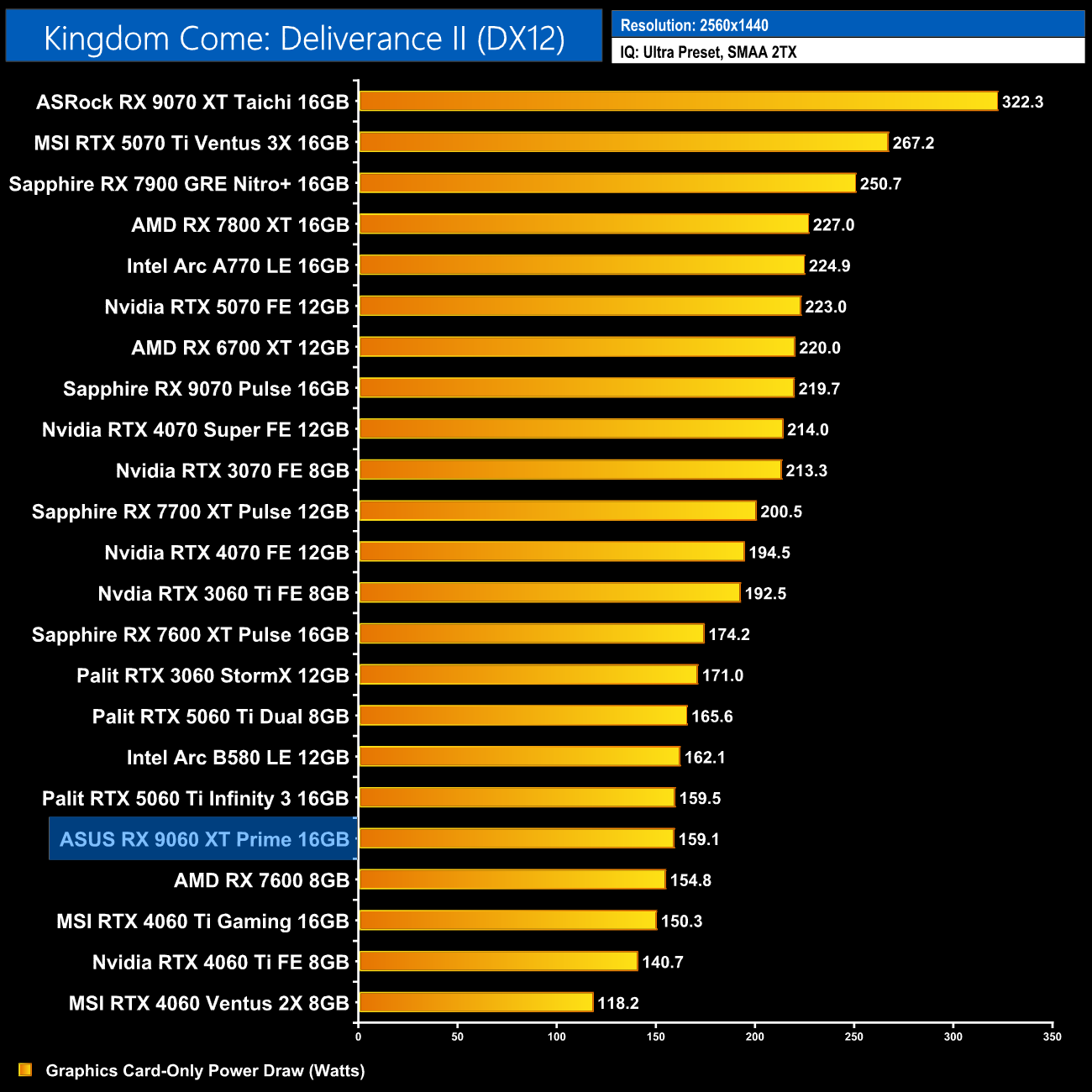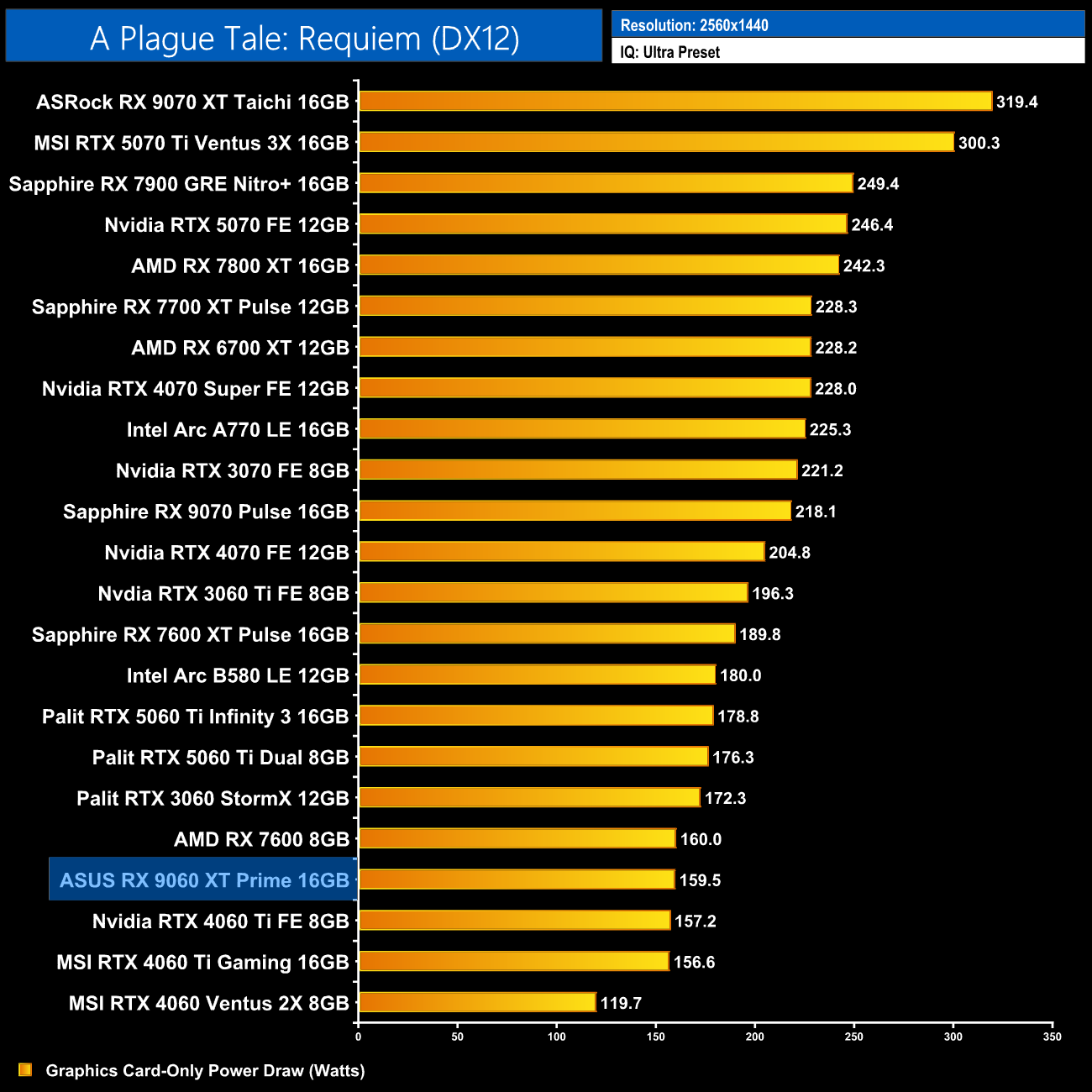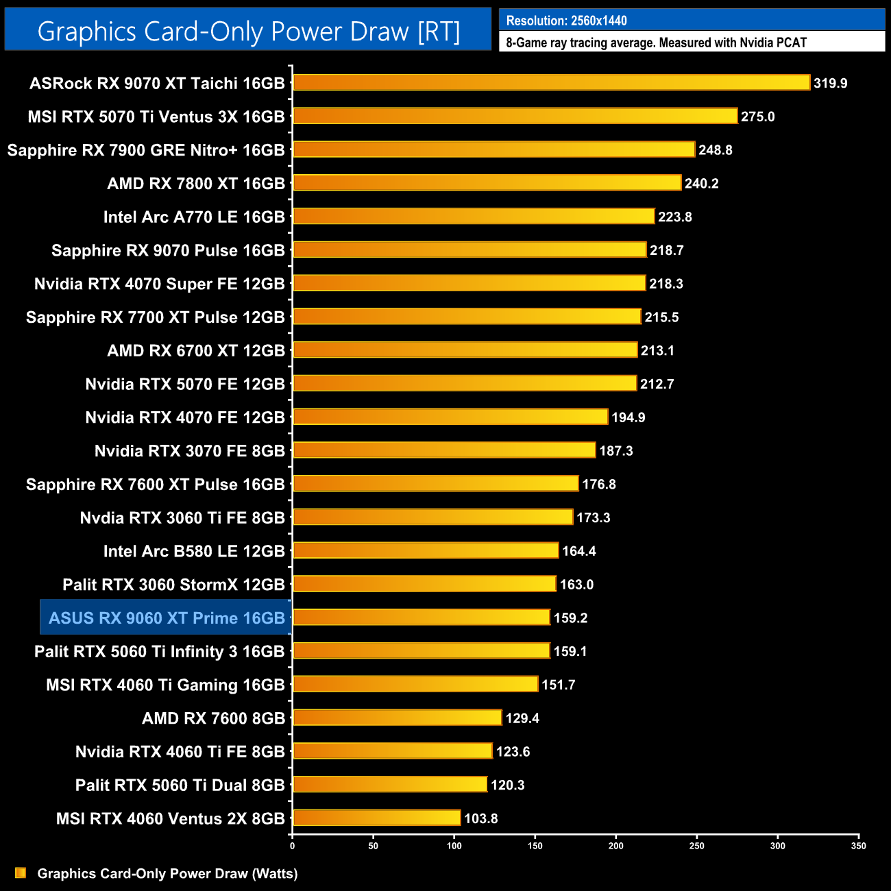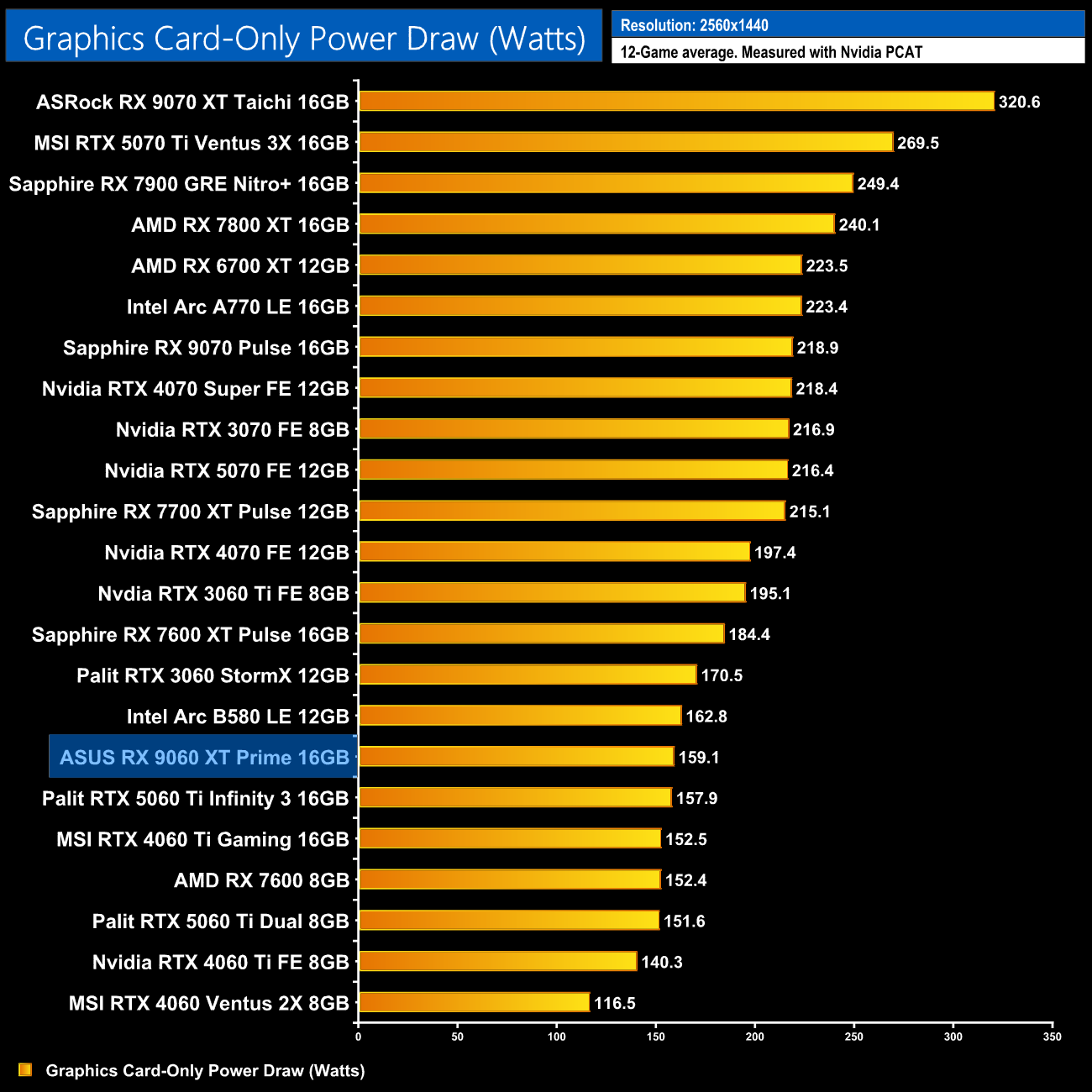 1440p power draw doesn't change much, still just below the rated limit, averaging 159.1W over my testing, so power draw is very similar to the RTX 5060 Ti 16GB as you can see.