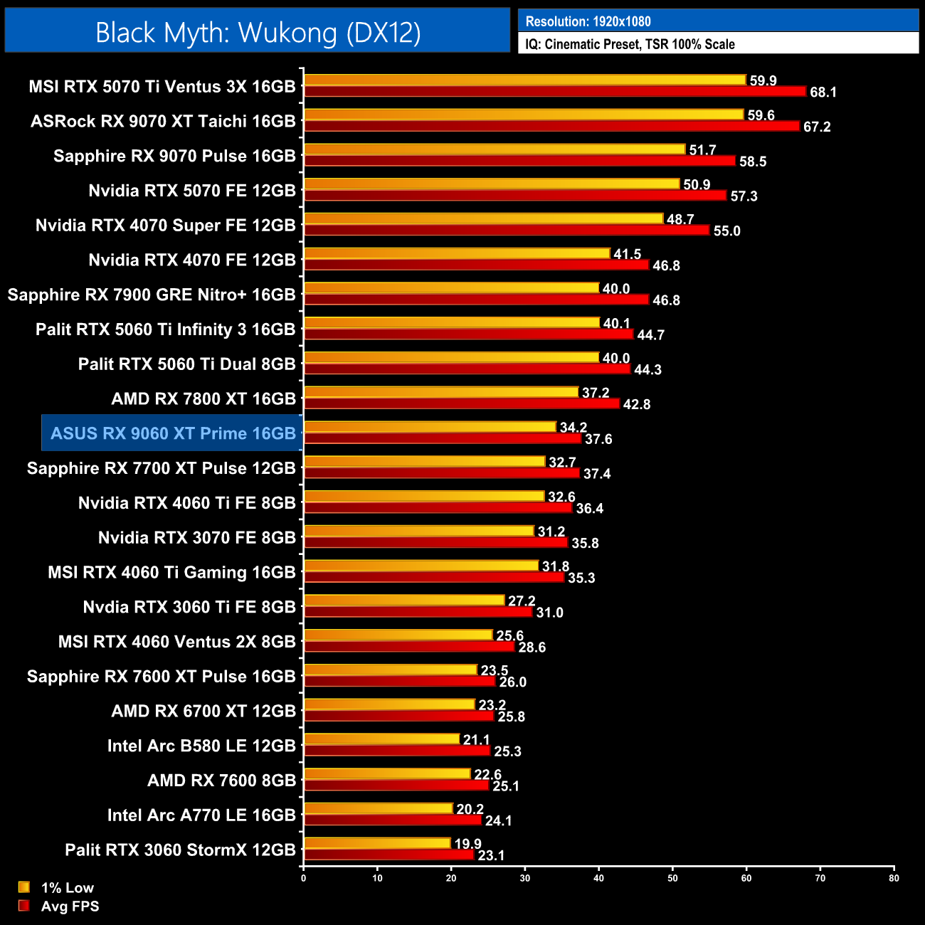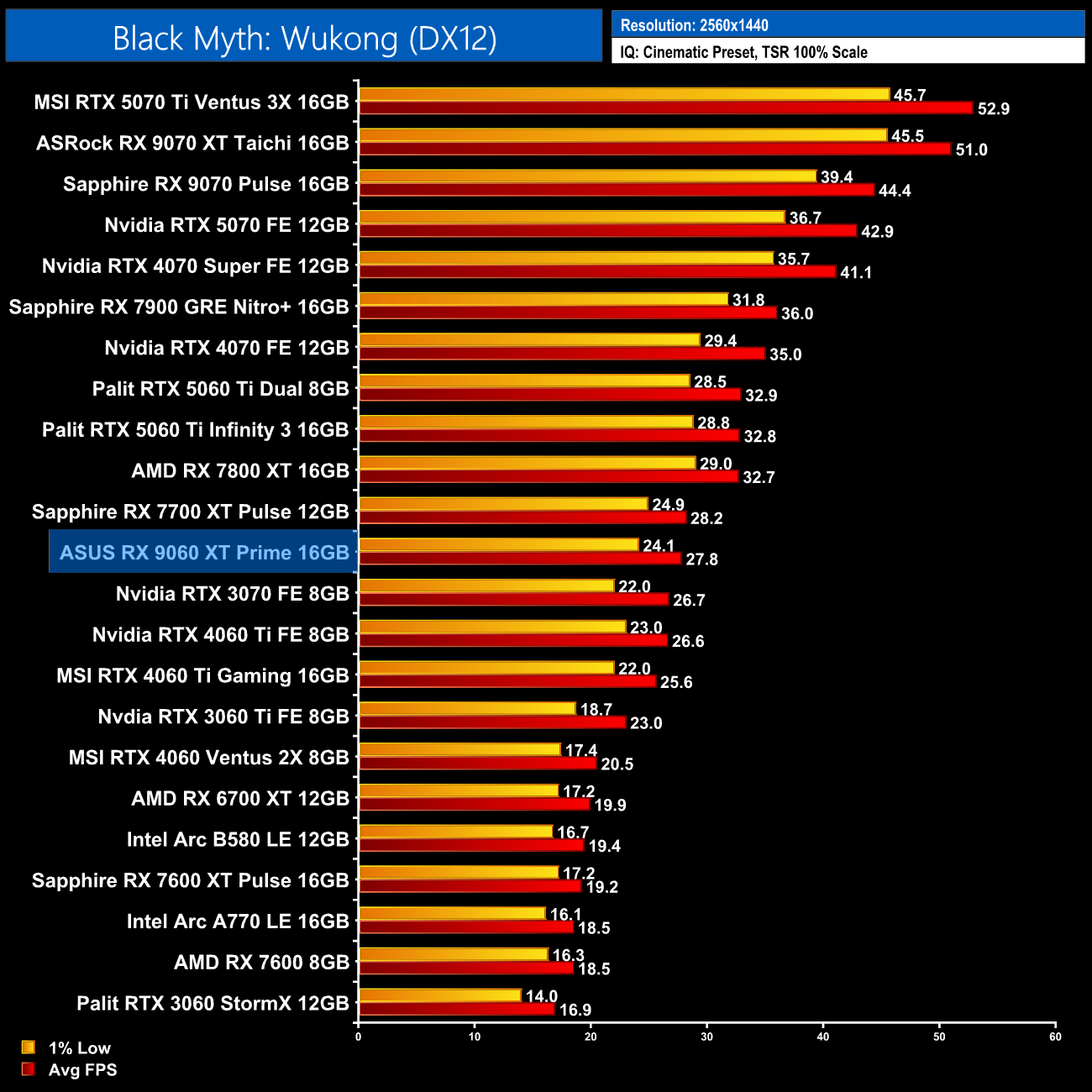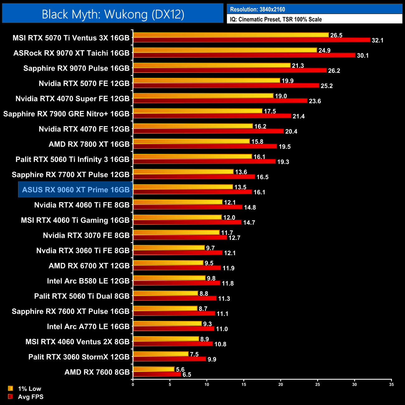 Black Myth: Wukong remains more favourable to Nvidia GPUs, and it also doesn't have a problem with 8GB cards at 1080p or 1440p – at least not without ray tracing being enabled! The 9060 XT 16GB comes in 15% slower than the 5060 Ti 8GB, while it's on par with the RX 7700 XT.