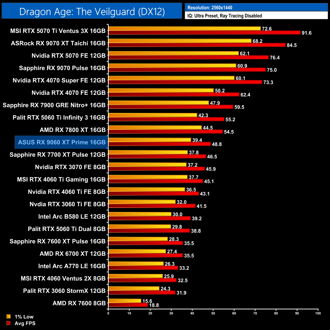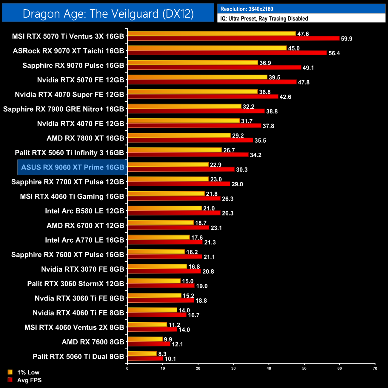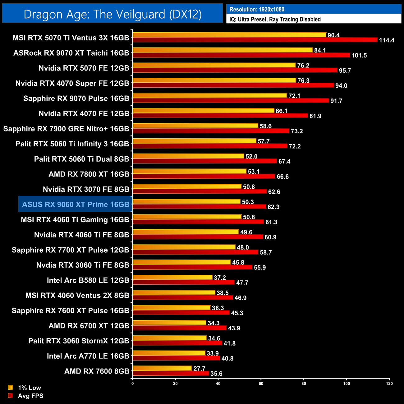 Dragon Age: The Veilguard is another game which favours Nvidia hardware, and we can see that with the 9060 XT 16GB only level with the RTX 4060 Ti, making it 14% slower than the 5060 Ti 16GB.