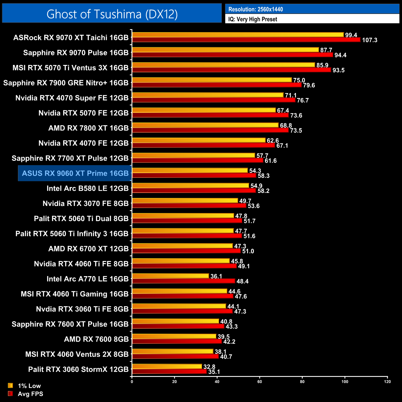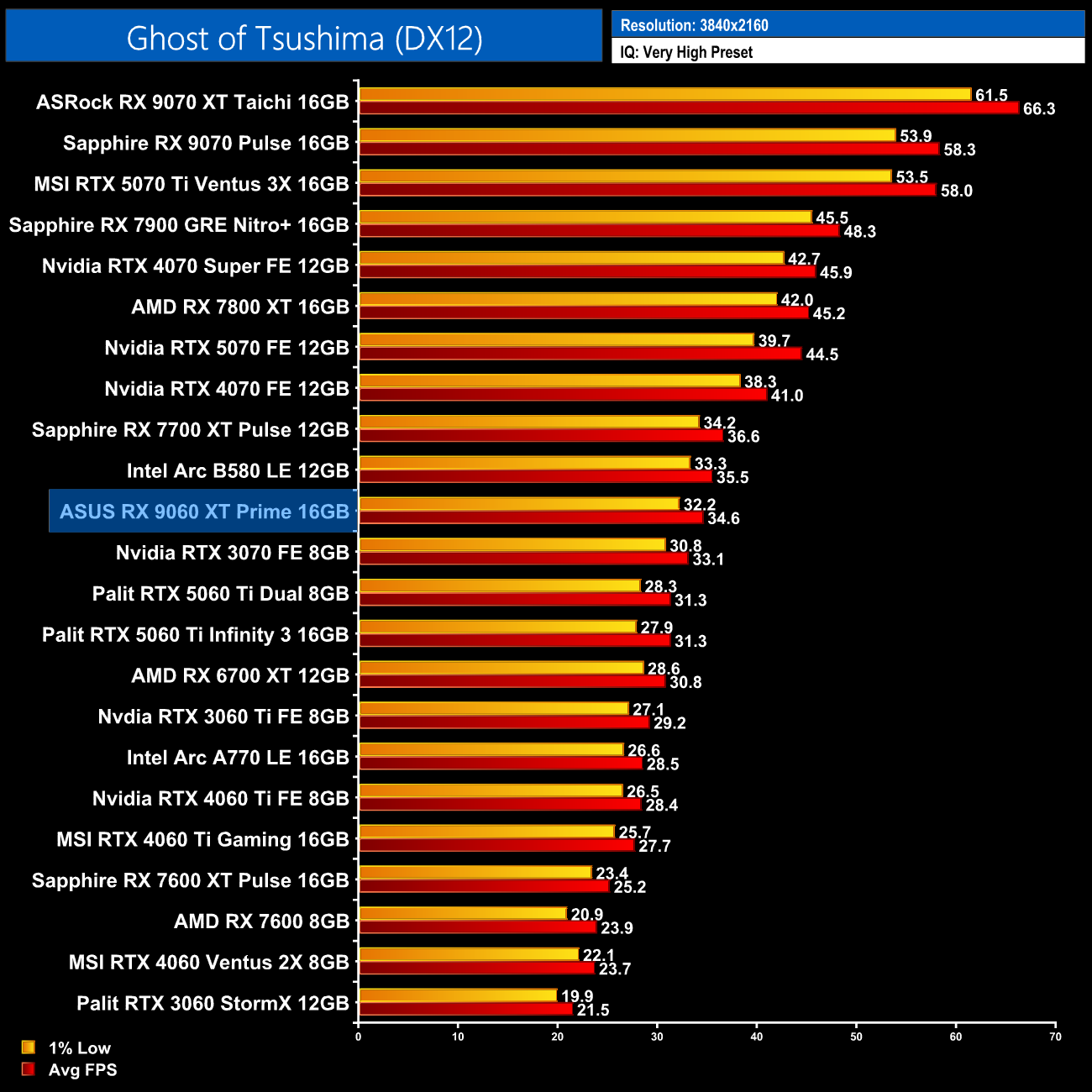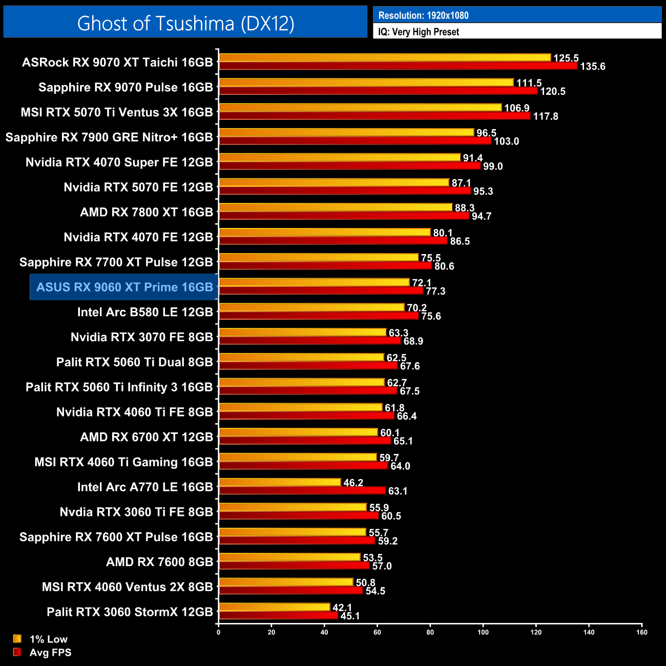 Ghost of Tsushima continues to be a strong title for AMD GPUs – or more accurately, it's a nightmare game for Nvidia hardware for some reason. The 9060 XT 16GB is 14% faster than both 5060 Ti models at 1080p for instance, hitting 77fps on average.
