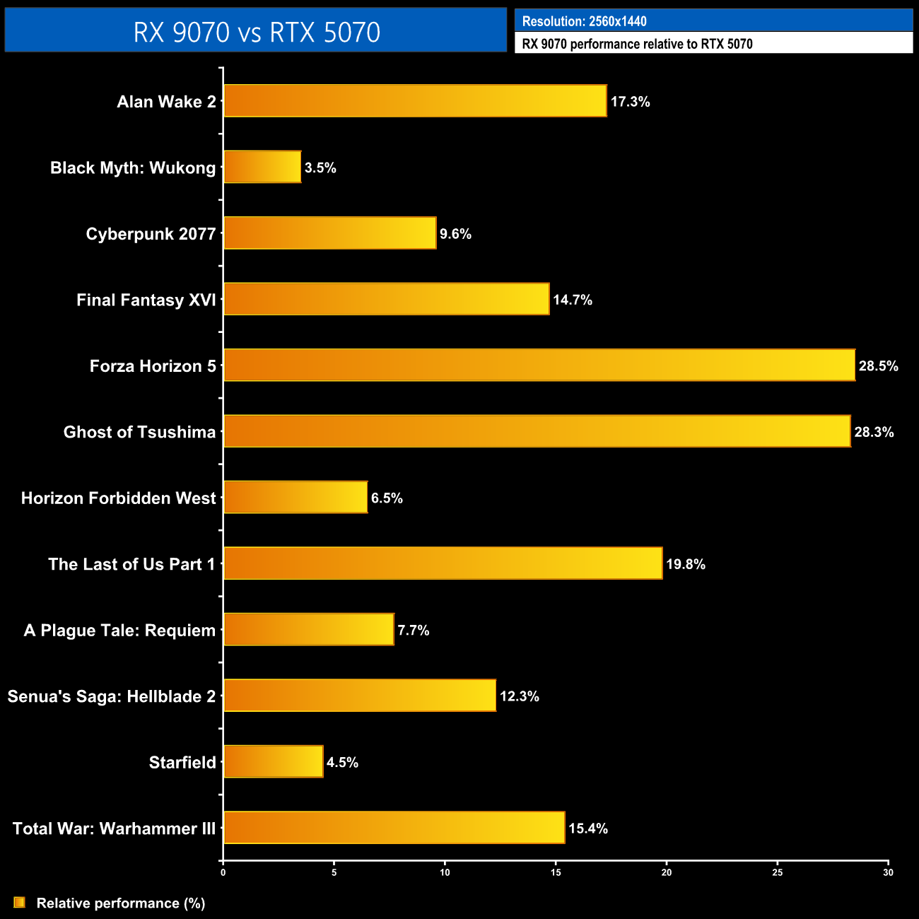 Just to take a closer look at performance versus the 5070, here we can see the 9070's relative performance compared to its GeForce competitor. I didn't see a single instance where the RDNA 4 GPU proved slower, though five of the twelve games tested saw single digit improvements. While Forza Horizon 5 and Ghost of Tsushima are clear outliers, if we remove them from the average, the 9070 only goes from being 15% faster to being 11% faster, so it doesn't really affect the outcome in any meaningful way.