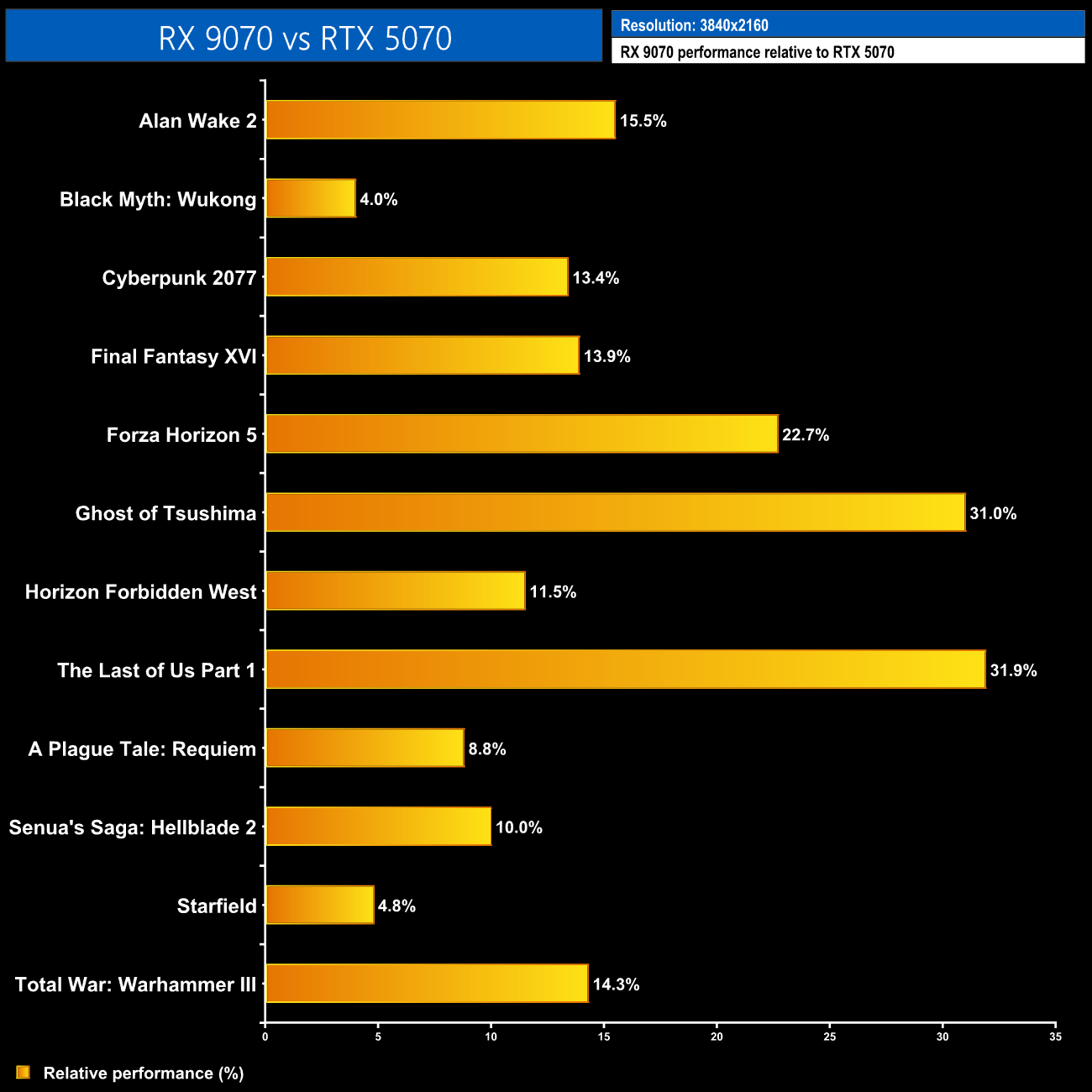 At 4K, we generally saw the 9070 scale slightly better than at 1440p, though it does vary from game to game. The Last of Us Part 1 delivered the biggest win over the 5070, with a 32% margin in favour of the Radeon GPU.