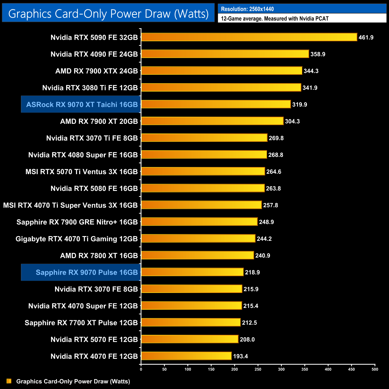 Here we present power draw figures for the graphics card-only, on a per-game basis for all twelve games we tested at 1440p. This is measured using Nvidia's Power Capture Analysis Tool, also known as PCAT. You can read more about our updated power draw testing methodology HERE.