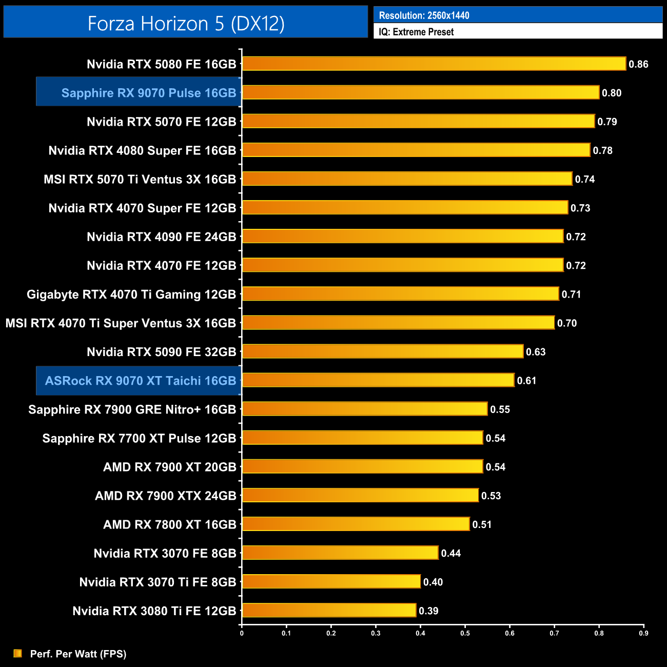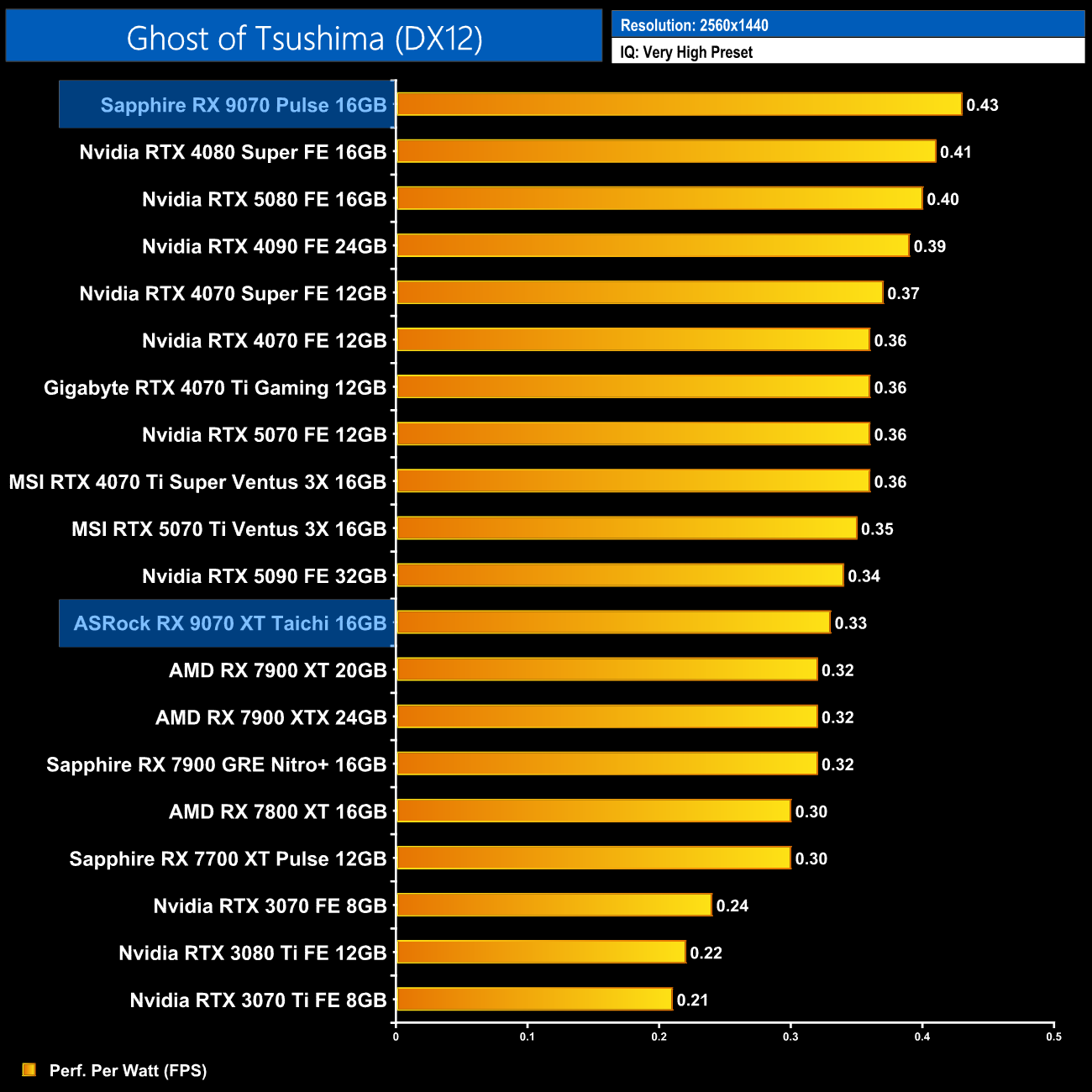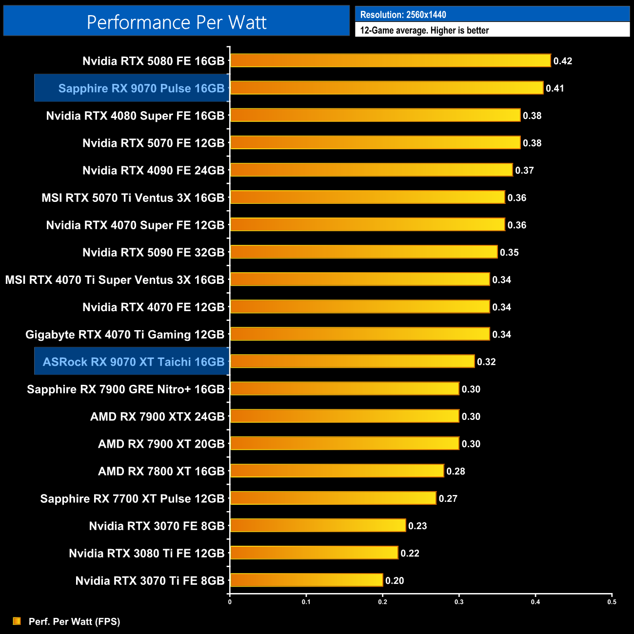At 1440p, efficiency for the 9070 is best in class, and only fractionally behind the RTX 5080. This means AMD's GPU leads the RTX 5070 by 8% when it comes to performance per watt. It also works out as a 37% improvement over the RX 7900 GRE, which was one of RDNA 3's most efficient GPUs.