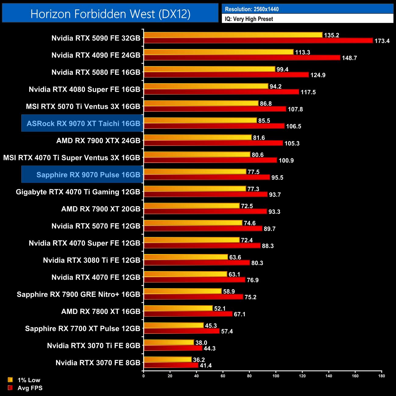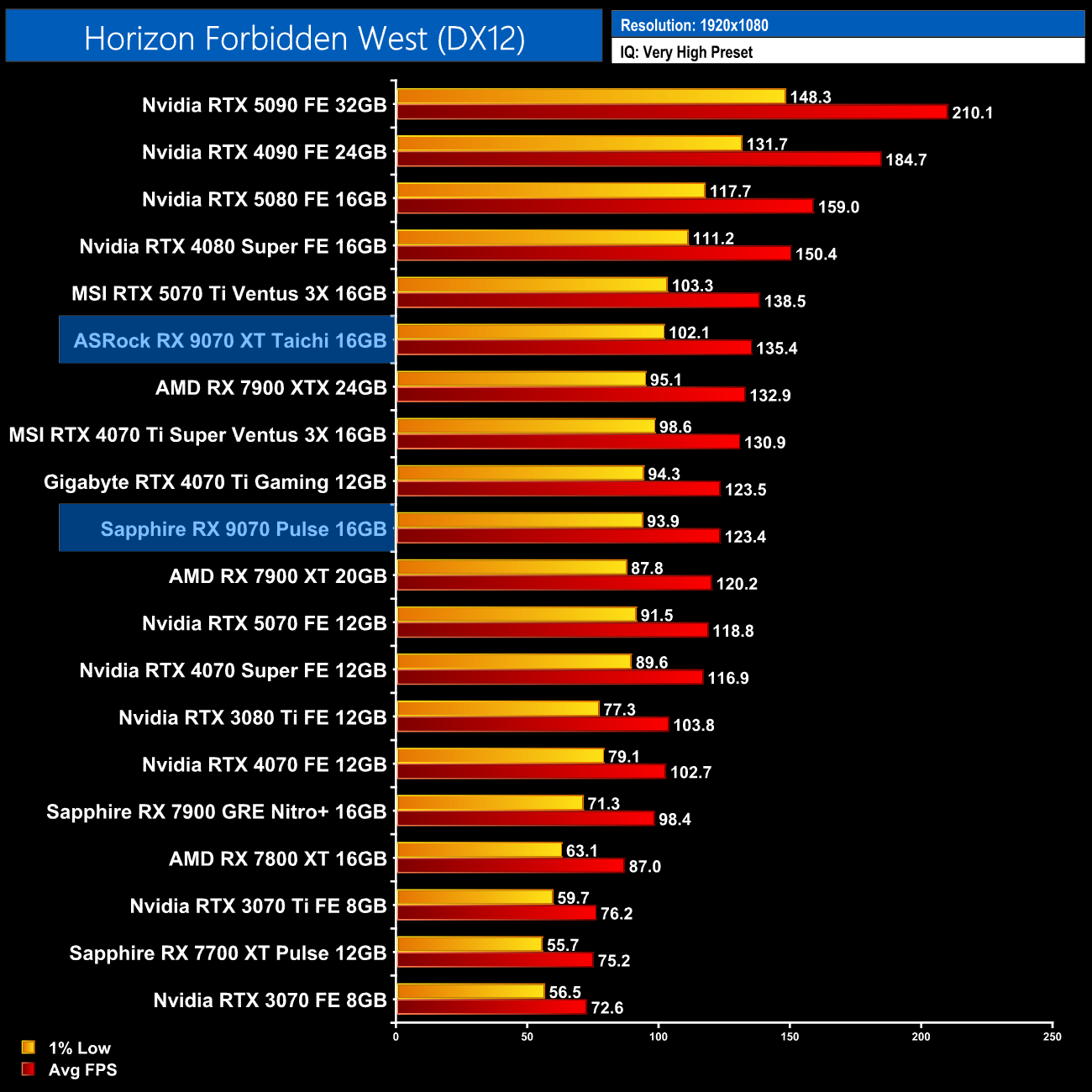 Horizon Forbidden West is much more favourable to Nvidia GPUs, but even then, at 1440p there's nothing to split between the 7900 XTX, 9070 XT and 5070 Ti – all three hover around the 105fps mark.